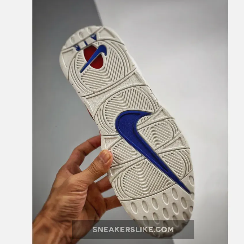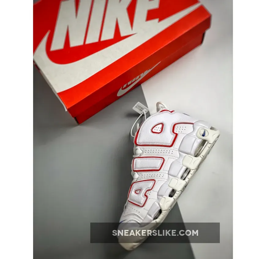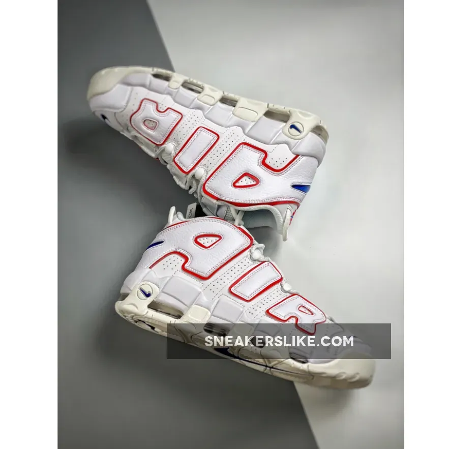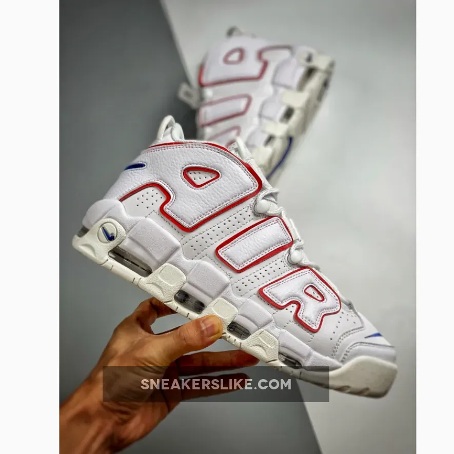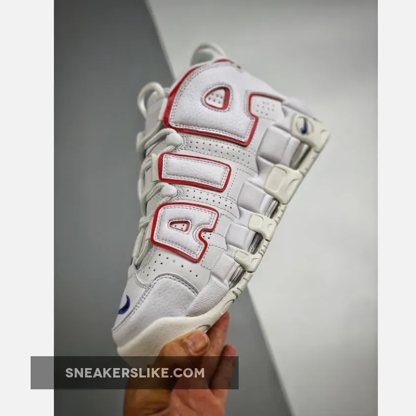 This Nike Air More Uptempo comes with White leather throughout, while the traditional perforations appear on the base. Next, Red outlines the large ‘AIR’ branding and embroidered basketball logo on the heel, while Blue appears on the Swoosh logos.