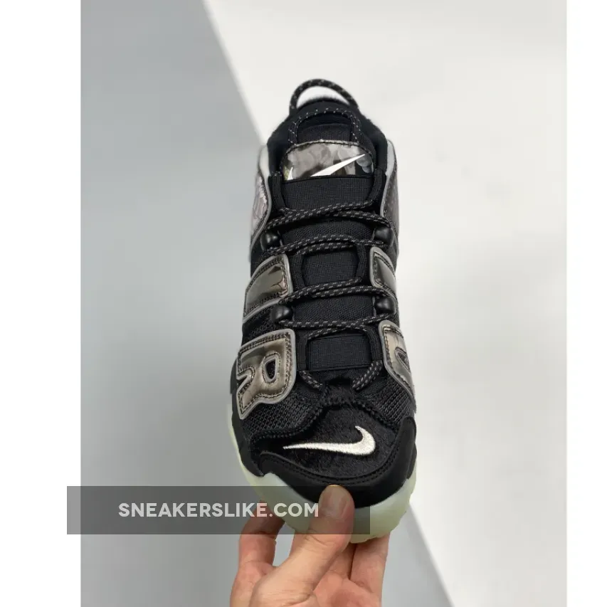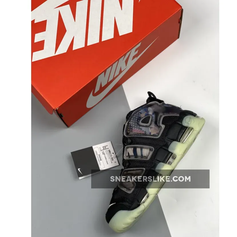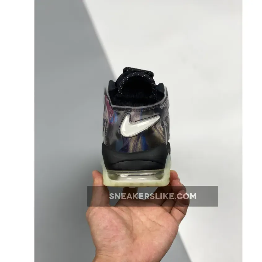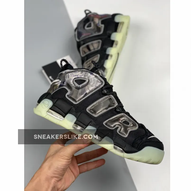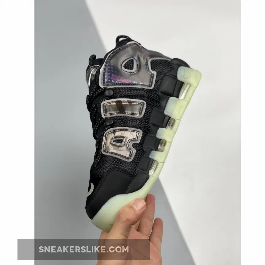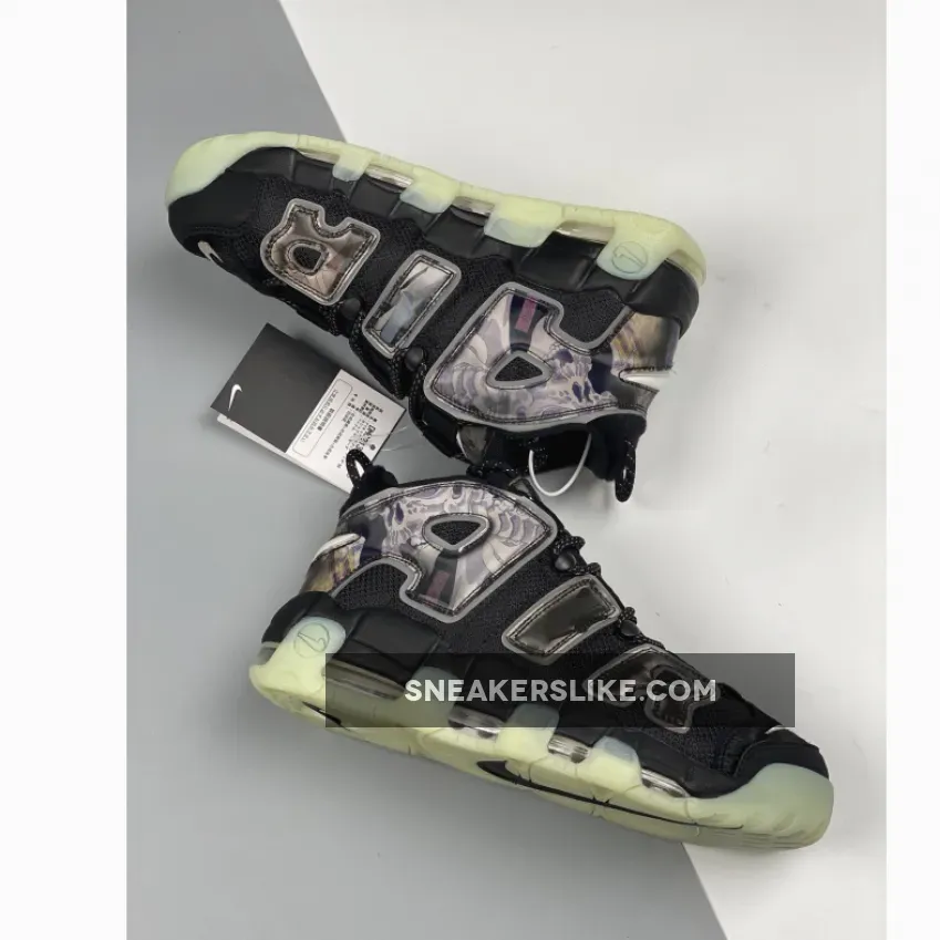 This offering of the Nike Air More Uptempo features Black covering majority of its upper built with ballistic mesh uppers with pony hair covering the toe and heel panels along with holographic overlays atop a glow-in-the-dark soles.
