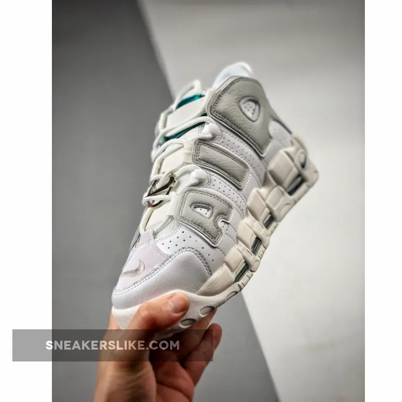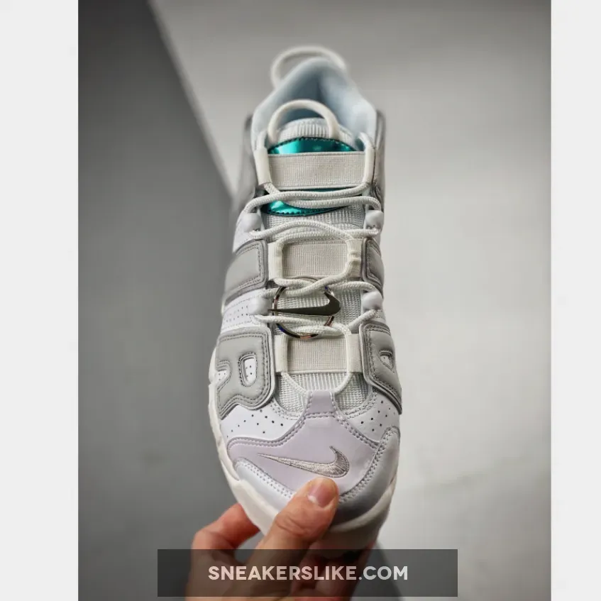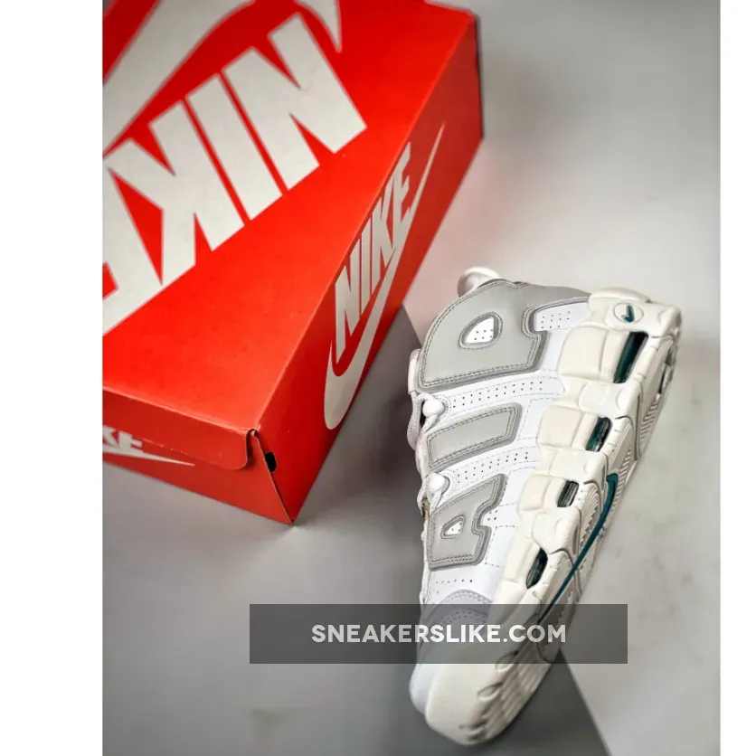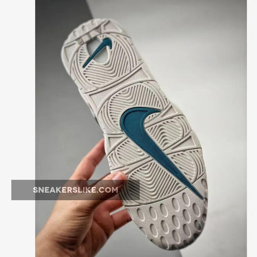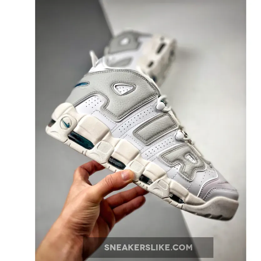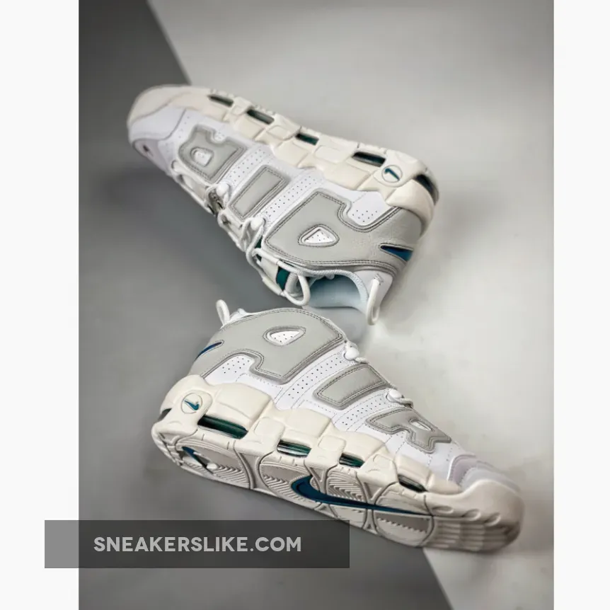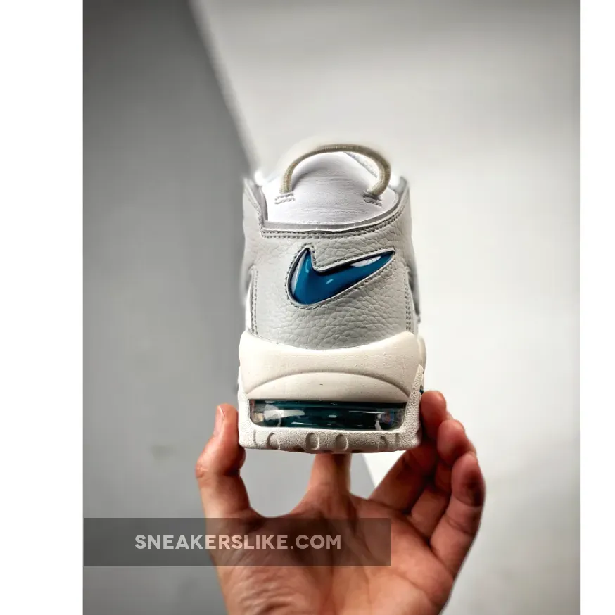 Opposing “Metallic Teal” emerges across additional branding and the Air Max unit underfoot. Mesh tongues also display a hint of the greenish tone, but their most notable element is the silver swoosh ring linked to its laces. No other jewellery is found across the sneaks. However, the emblems at the spine and around the tread provide a more attractive flair to the Air More Uptempo.