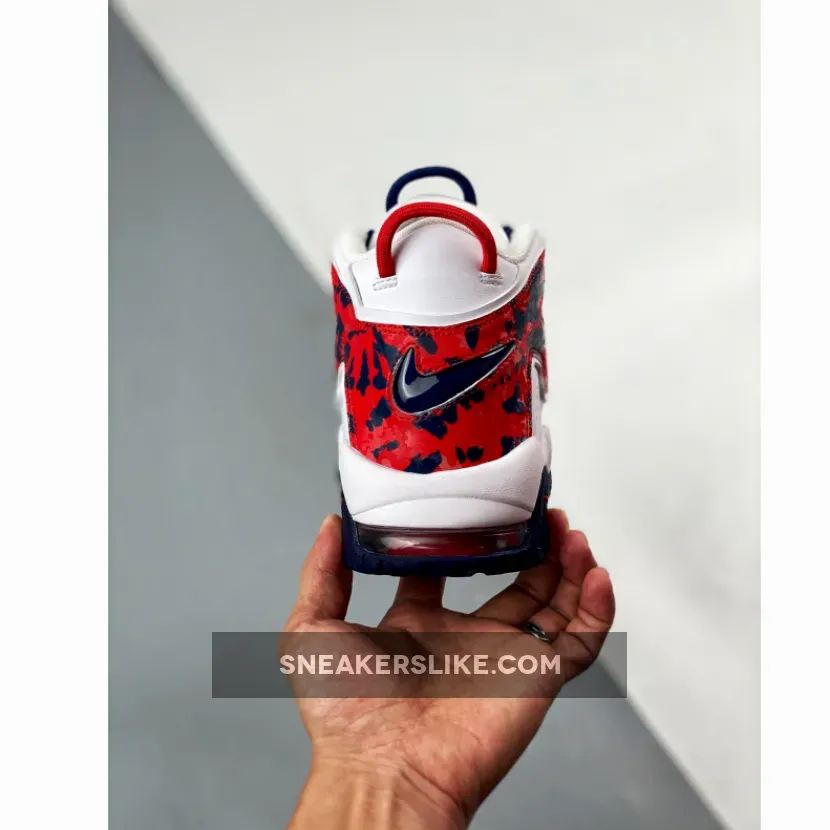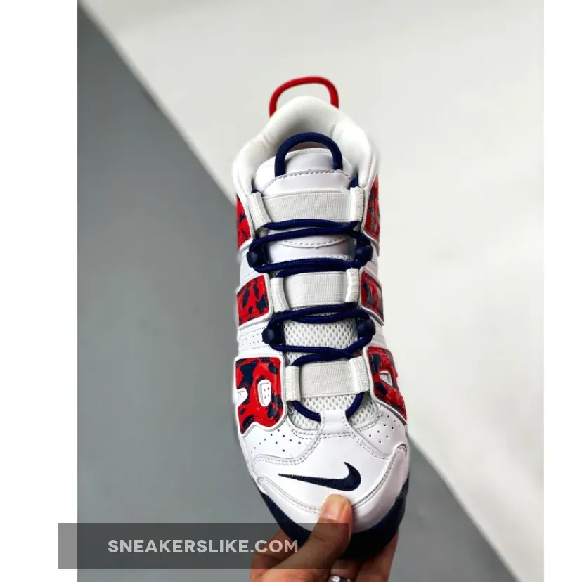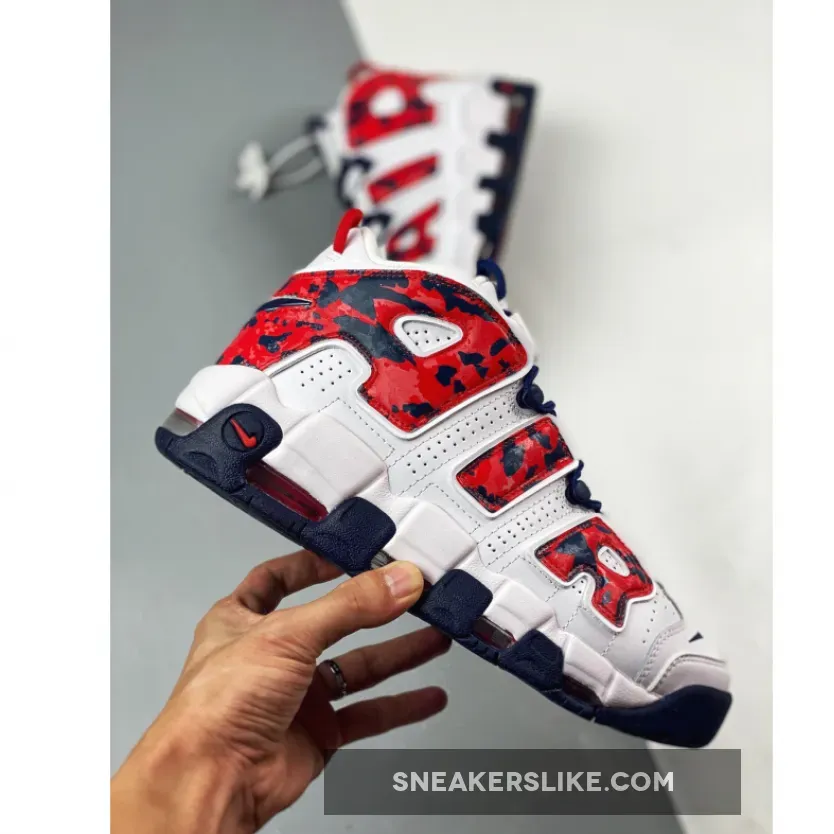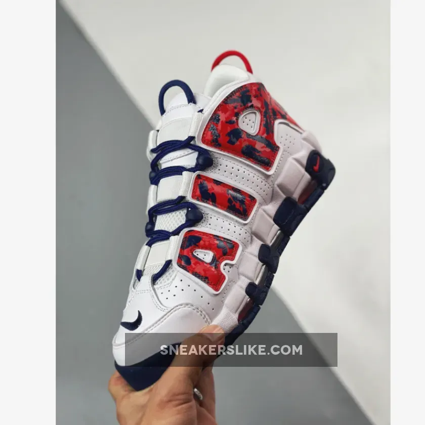Dressed in USA colors, this Nike Uptempo features a White leather upper with mesh tongues and perforations on the sides. Red and Navy contrasting accents throughout with a camo-like print on the oversized “AIR” branding completes the design.