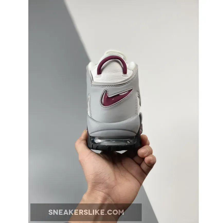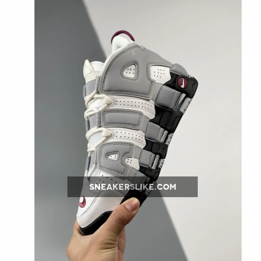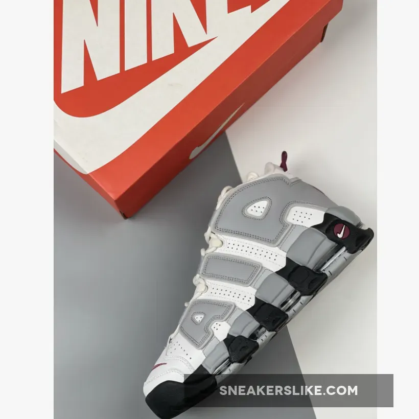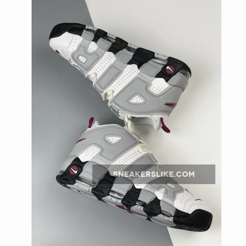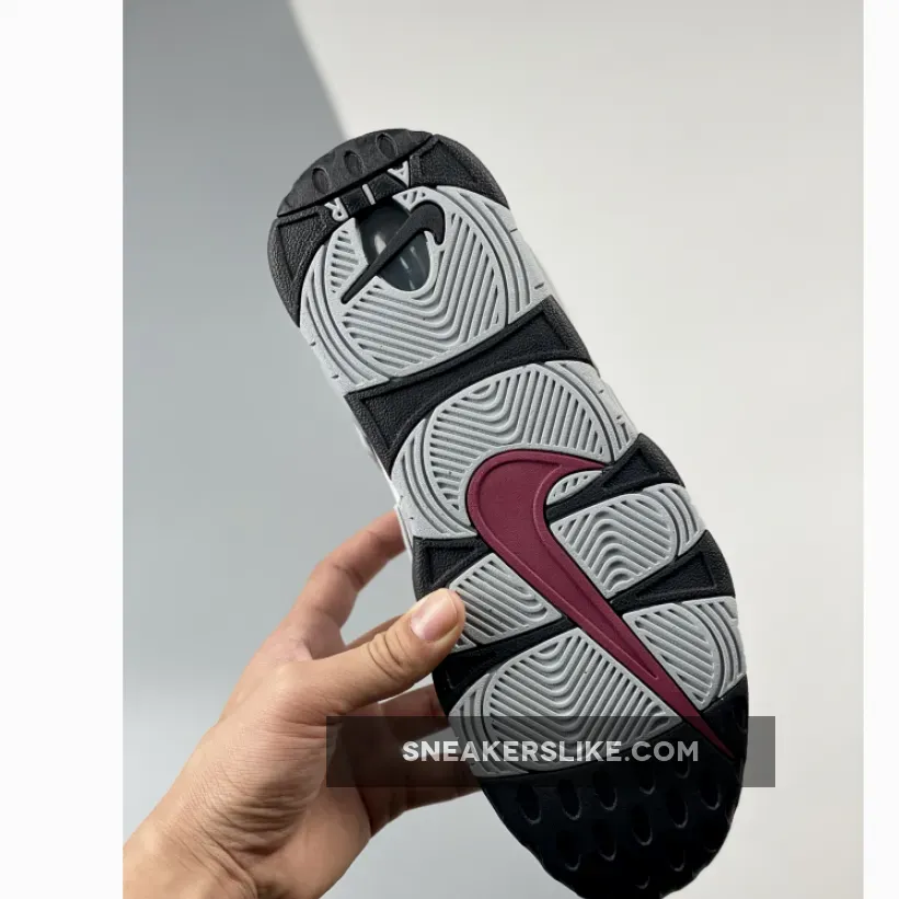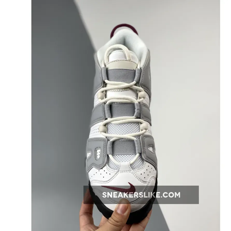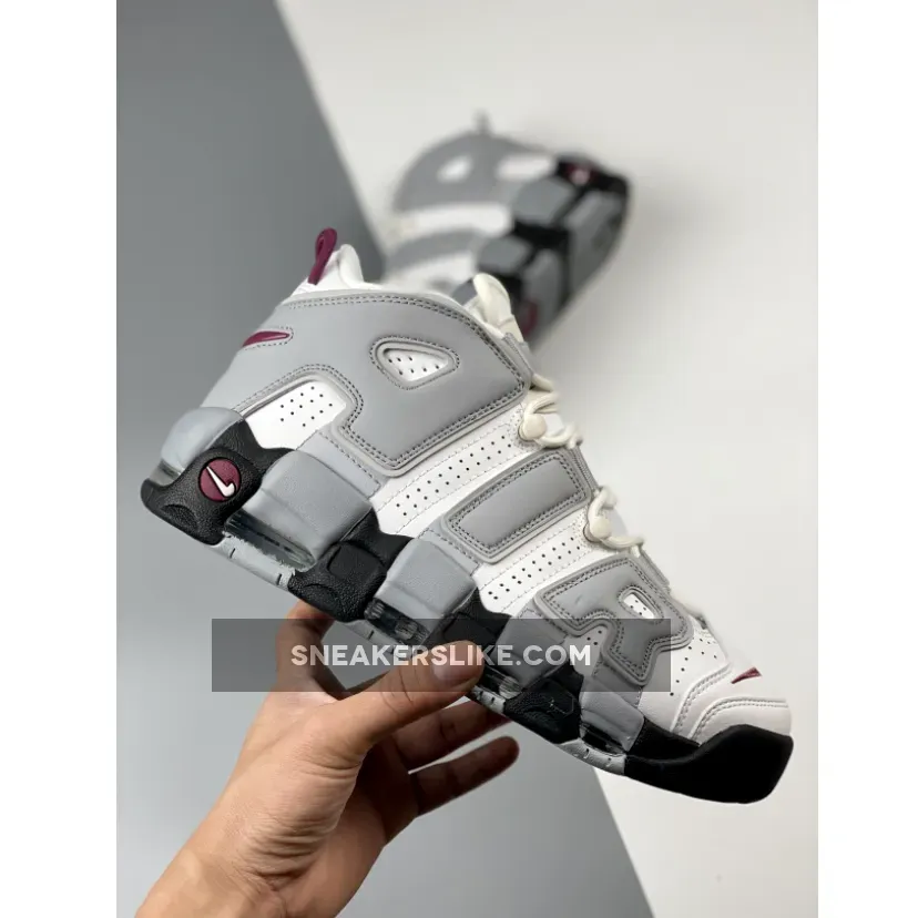 The Nike Air More Uptempo White Grey Bordeaux is what you get when you put together an elegant colourway and a bold silhouette. Balanced and ultra-stylish, this shoe features a perforated white leather base that’s topped with oversized grey “AIR” branding on the side panels. Meanwhile, hits of burgundy via the Nike Swoosh on the toe, heel branding and back loop add a fancy touch. Underfoot, the Nike Air units that provide lightweight cushioning to this Nike Air More Uptempo are encased in a black cage which matches the front portion of the durable outsole.