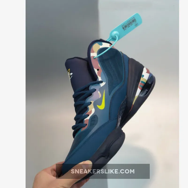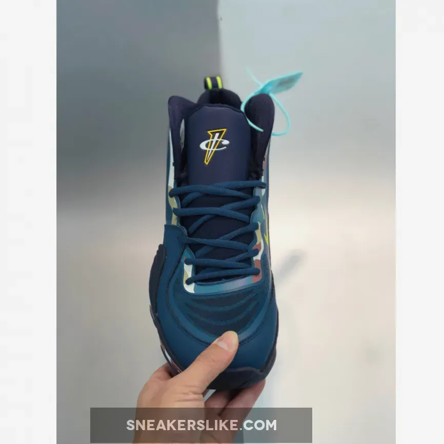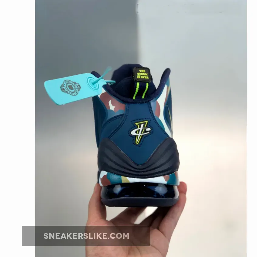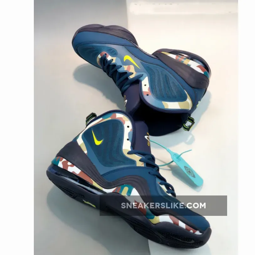 This is the “Camo” edition of the Nike Air Penny V. They come in a black spruce, black and volt colorway. Featuring a black spruce and black-based upper with a camouflage design throughout it and volt accents