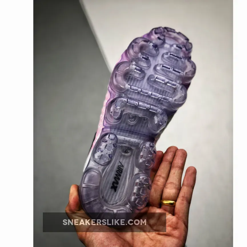 That flexible knitted material extends across everything in sight with perforated detailing which promises the best in snug comfort. It’s the integrated lacing system which keeps your foot securely locked in place and synthetic panels add some reassurance across the heel. The Vapormax 2.0 is characterised by that embossed Swoosh across the sidewall. On this pair, it offers a stark contrast, featuring in black against that colourful upper. Shades of pink and blue are woven through white Flyknit and the results are nothing short of astounding.