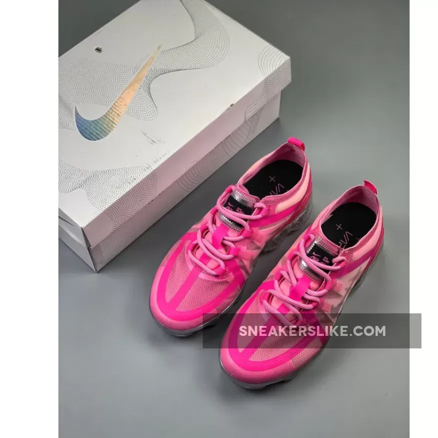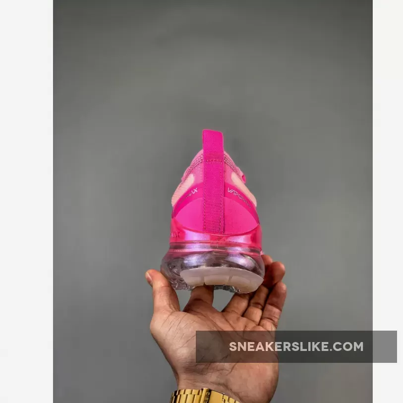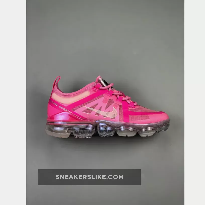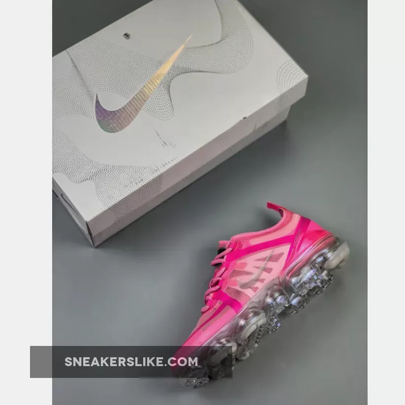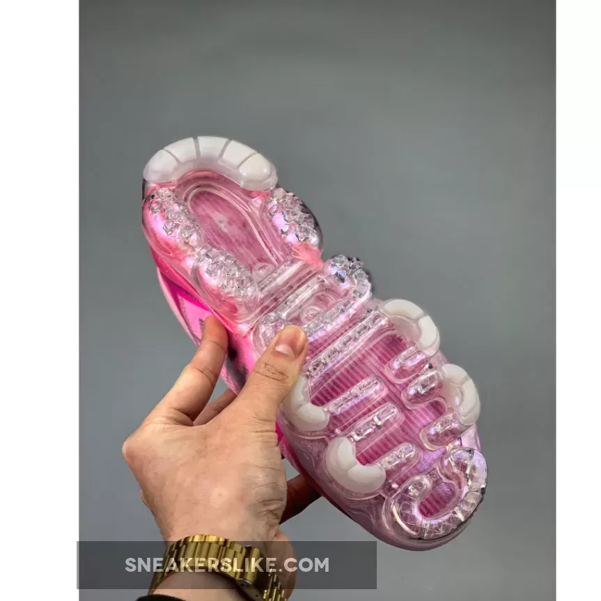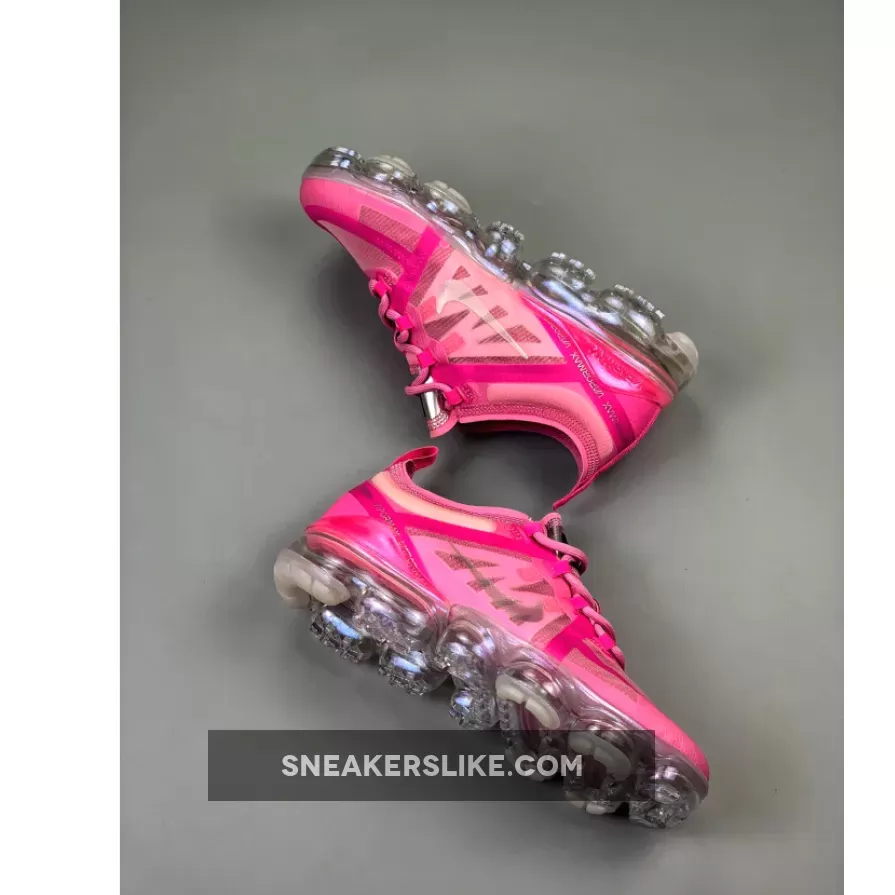 This Nike Air VaporMax features a Pink translucent TPE-infused upper in light and dark tones with Silver contrasting accents.