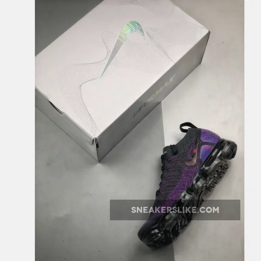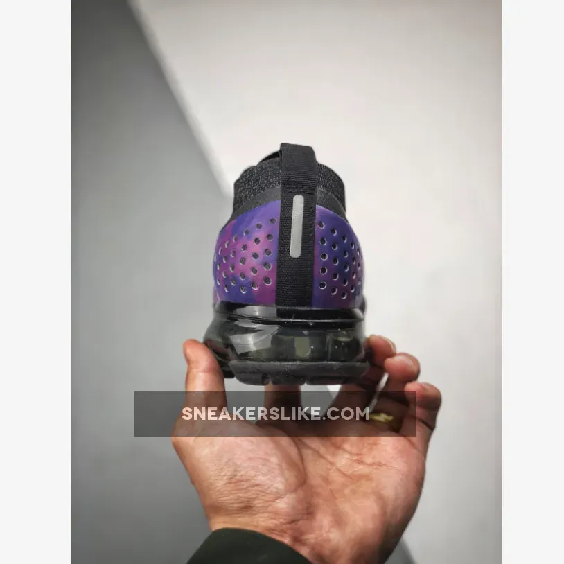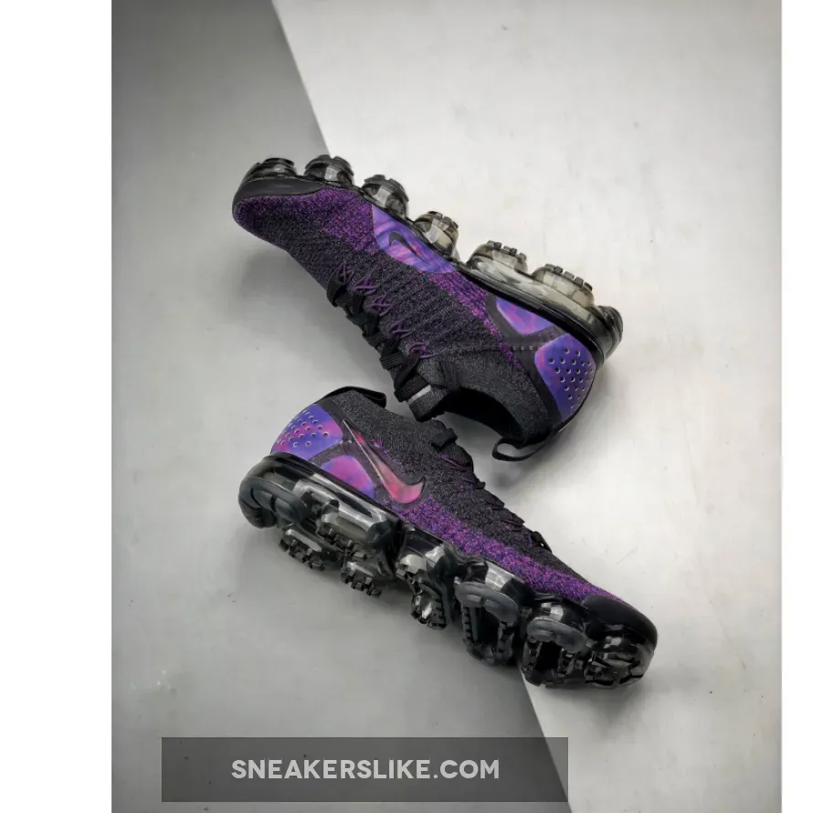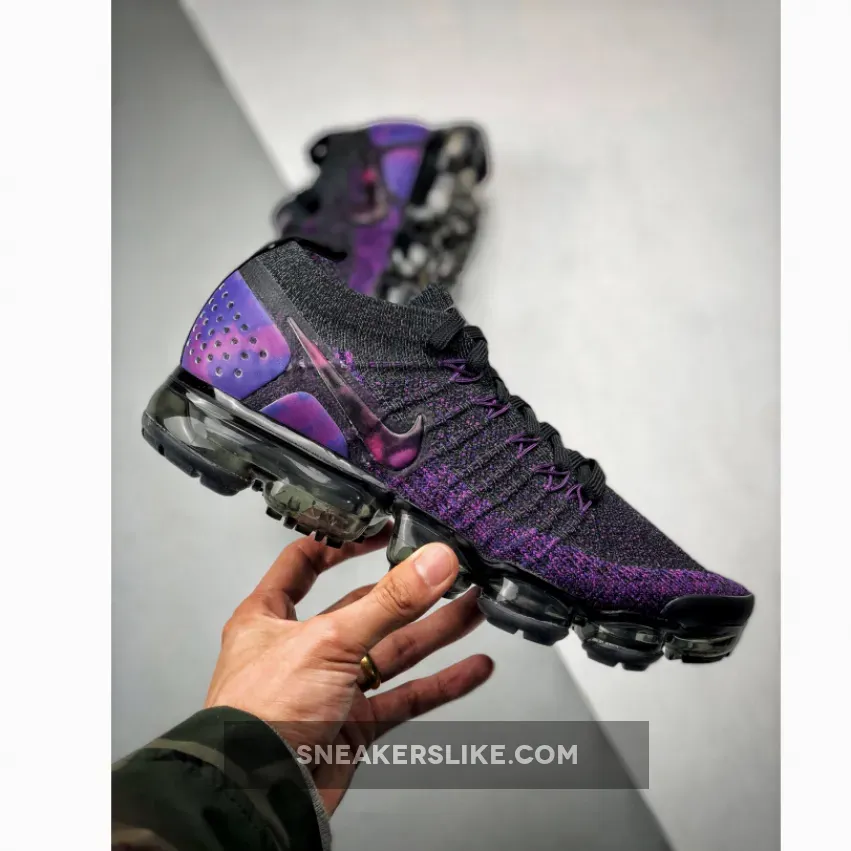 Saturated in color, the Nike Air VaporMax Flyknit 2 makes its mark for Fall 2018; sporting rich indigo shades and VaporMax Air technology for a statement-making look. The Nike Air VaporMax Flyknit 2 ‘Night Purple’ sneaker reimagines the icon with a black and purple Flyknit upper that’s complemented by camo print on its heel plates. Matching purple Flywire cables interlock with black no-tie laces for a locked-down fit.
