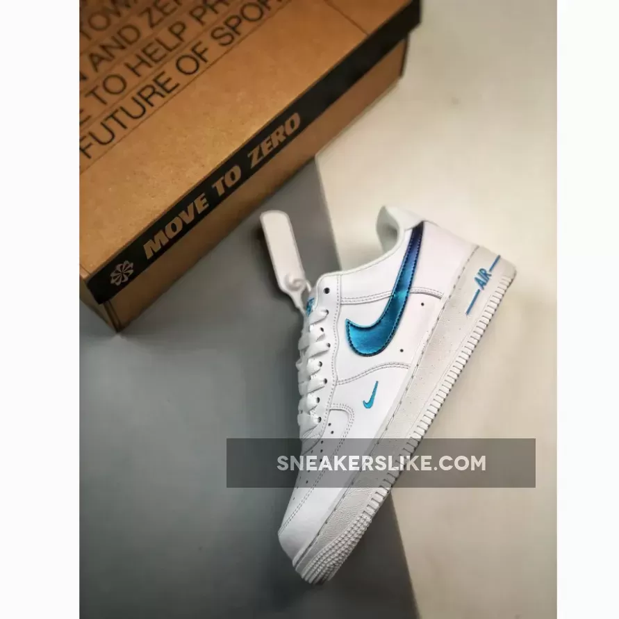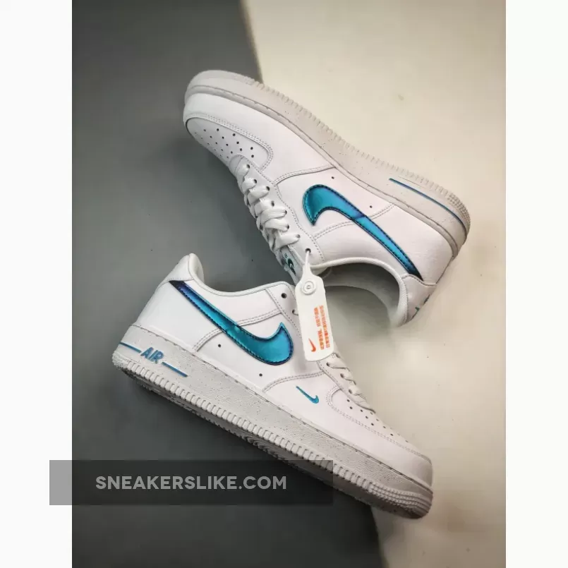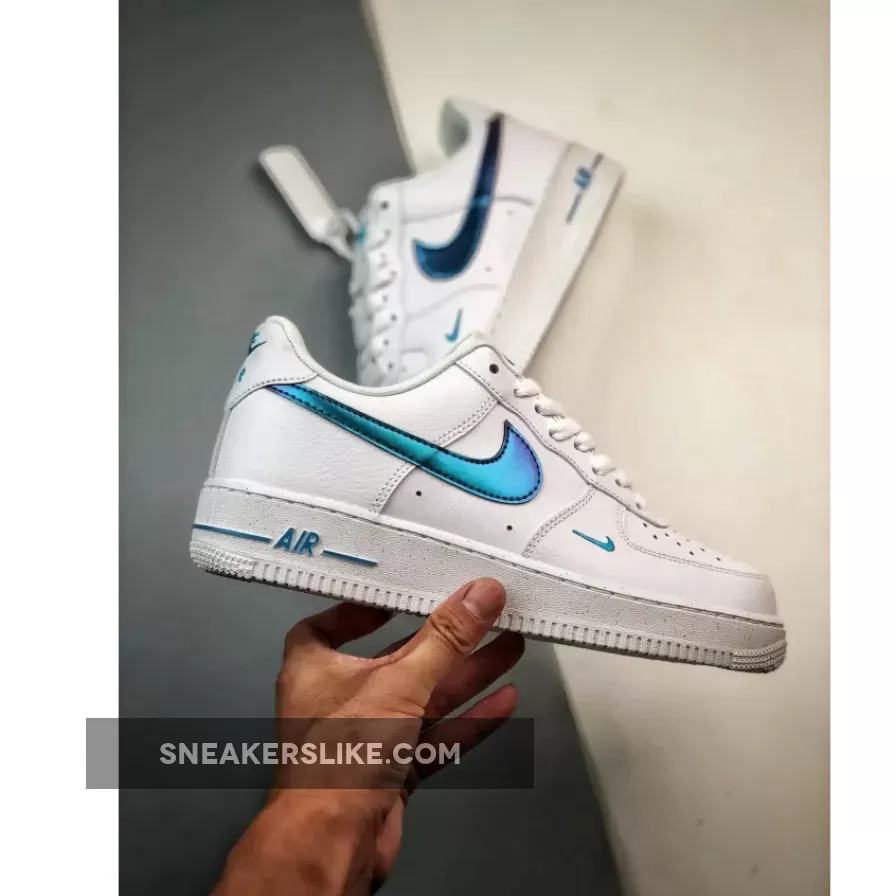 The Nike Air Force 1 Low GS White Iridescent Blue is an ethereal rendition of Bruce Kilgore’s classic sneaker design. This smaller-sized release has a smooth white leather upper which puts the iridescent sapphire blue Nike Swoosh in the spotlight. Embroidered blue Nike Swooshes and other brandings across the silhouette also add to its stylish look. Underfoot, the chunky and cushioned Nike Air Force 1 Low sole unit has a subtle speckled accent that nicely complements the rest of the shoe’s features.