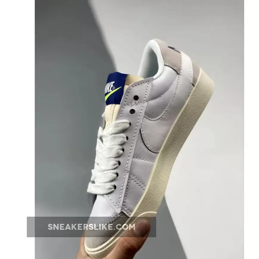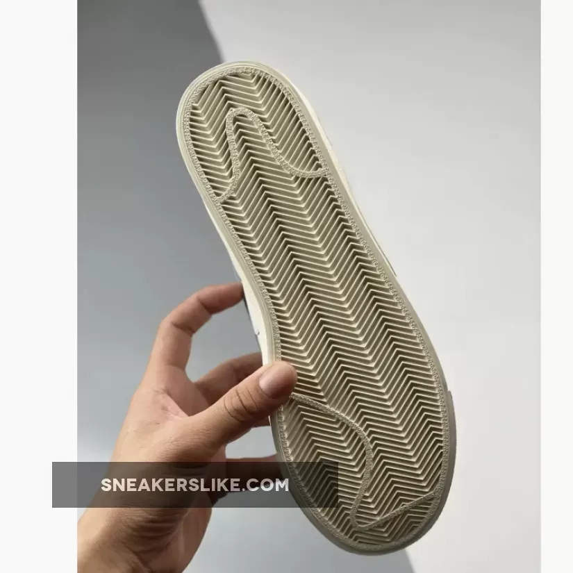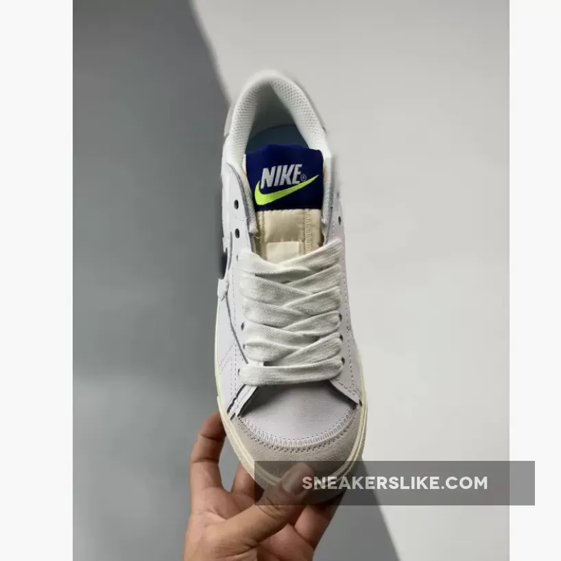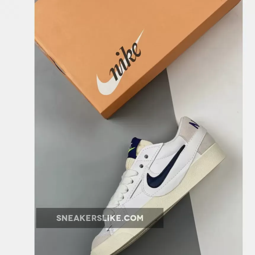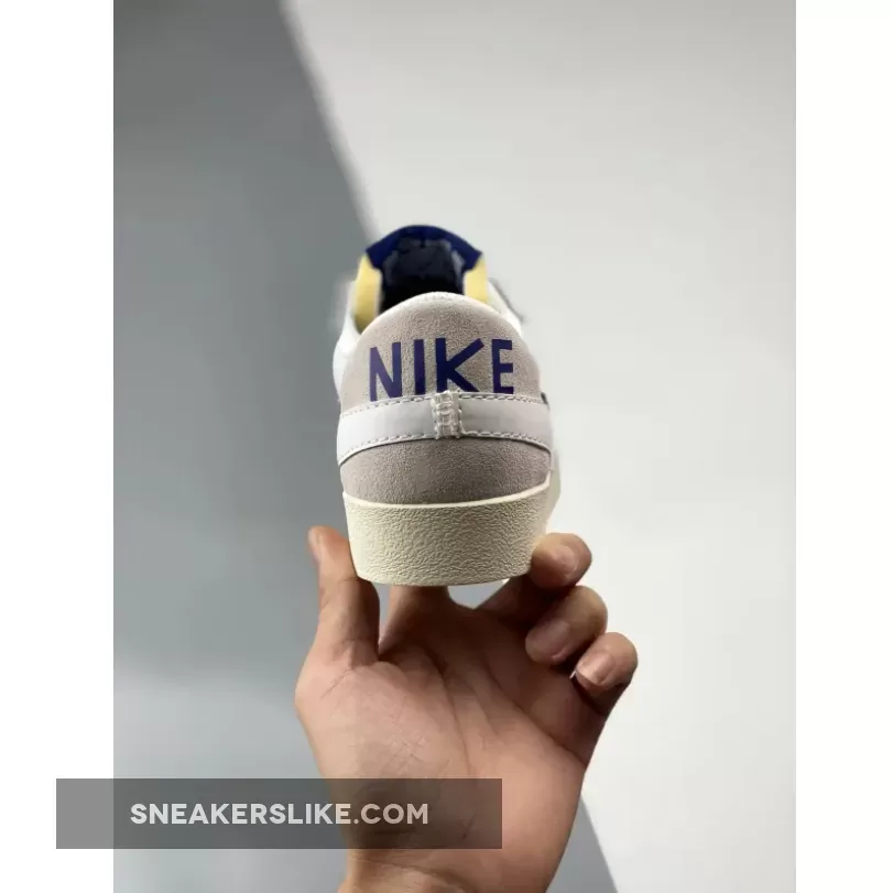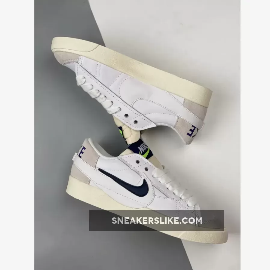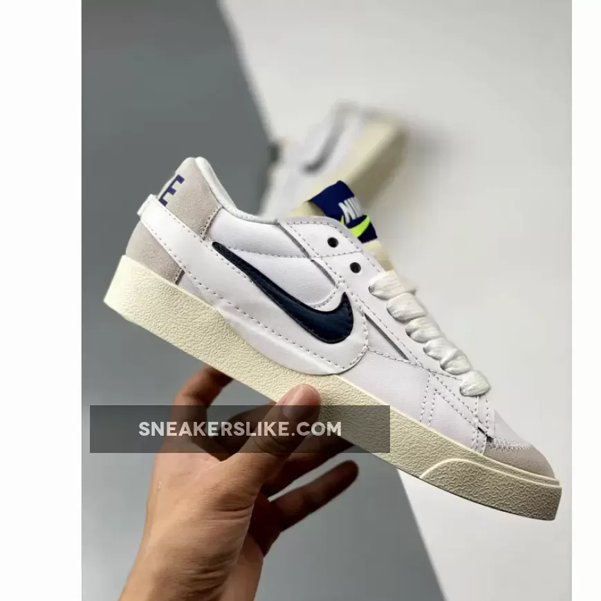 The Nike Blazer Low Jumbo White Navy offers a more understated but still eye-catching look. It has the classic low-top Blazer silhouette with a smooth colourless base and matching oversized white overlays. For this iteration, the off-white laces come in a regular size instead of the usual jumbo thickness. Meanwhile, the large Nike Swoosh is complemented by a blue mini Nike Check on top. Exposed tongue foam, grey suede accents at the toe and rear, and the “NIKE” branding at the heel round off the upper.