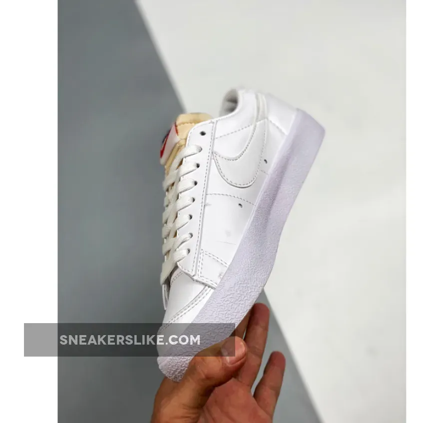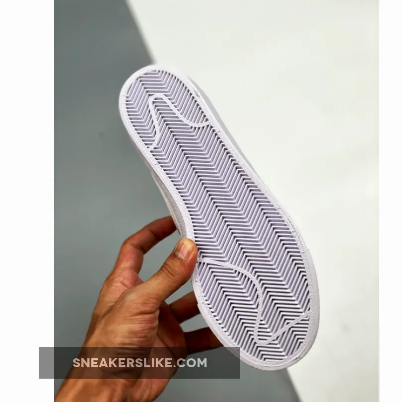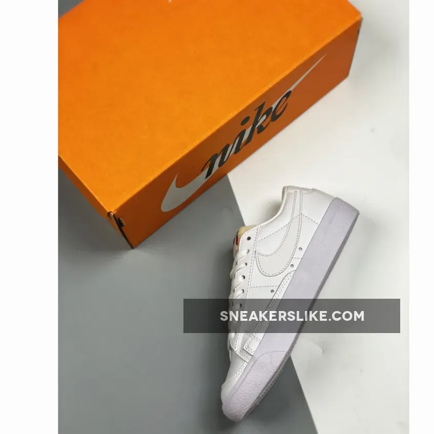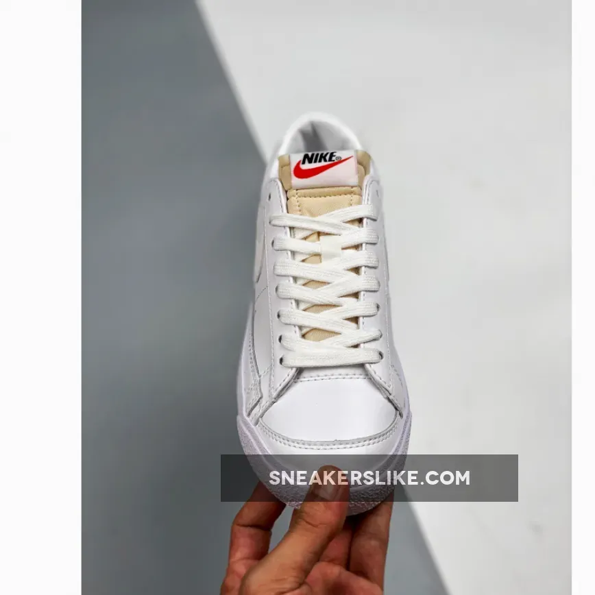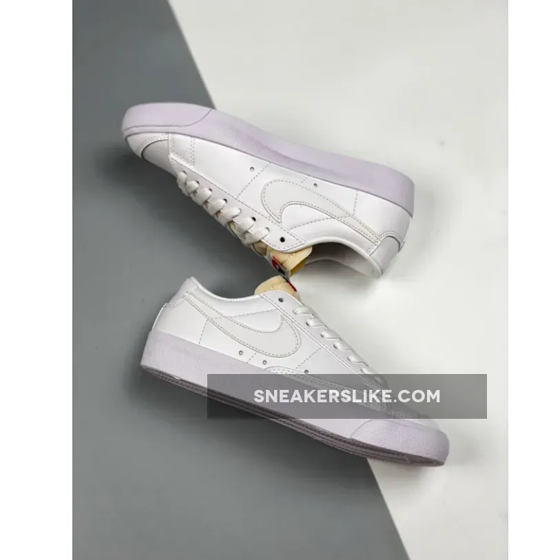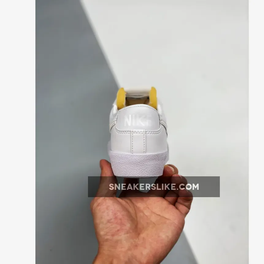 This offering of the Nike Blazer Low features an all-White leather upper with matching exposed stitching, Swooshes, heel branding, and laces.