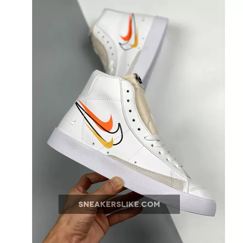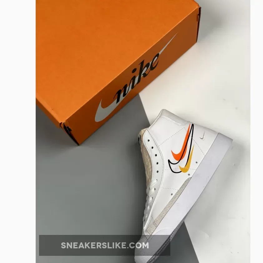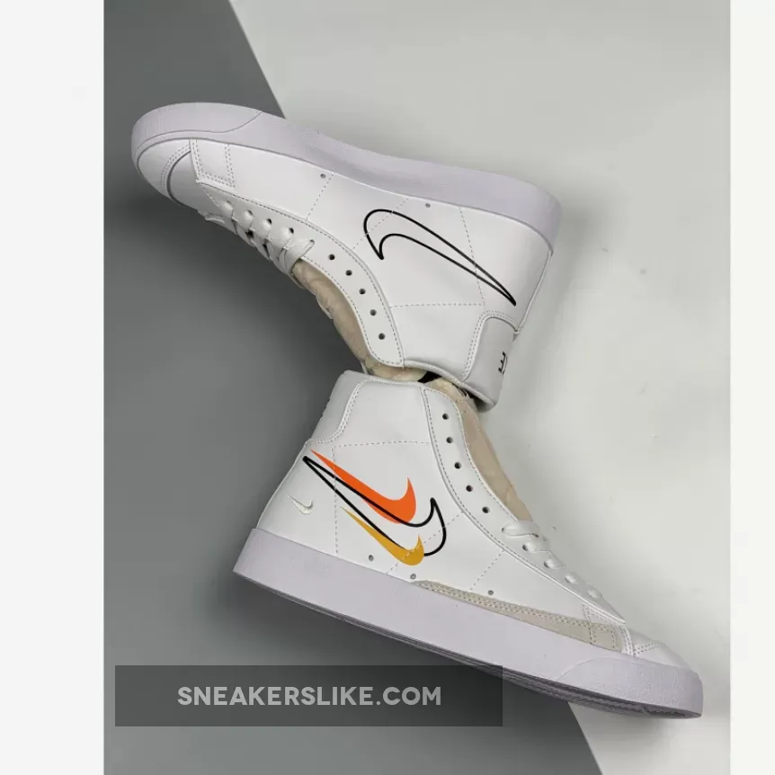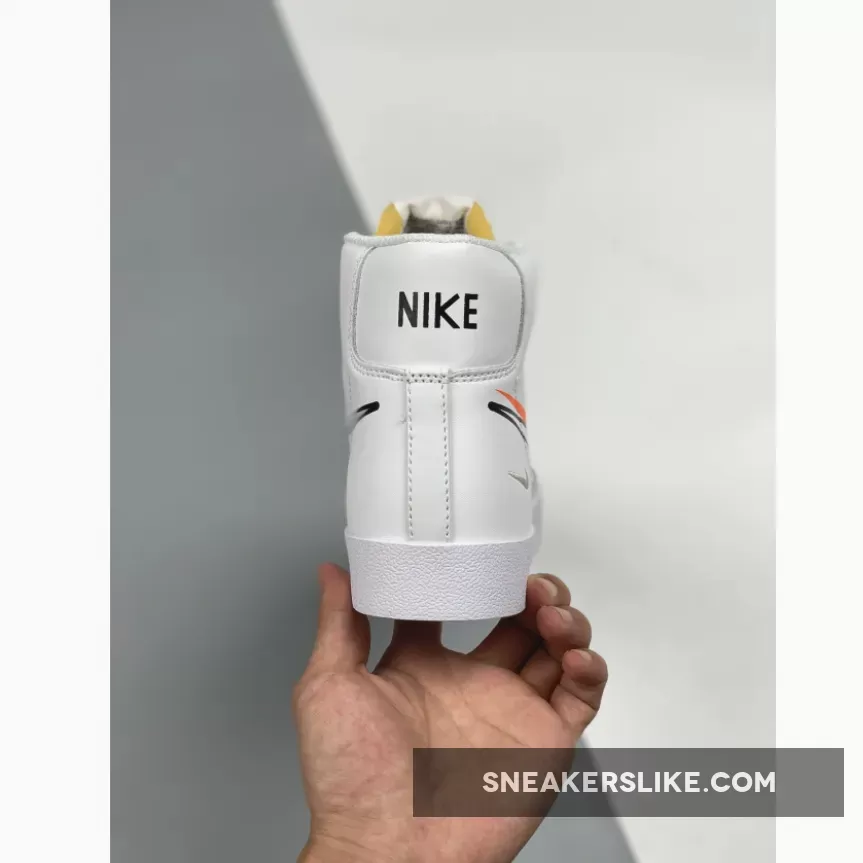 Boldly showing off the refreshing white upper body, this Blazer Mid 77 is almost like a work of art. The white eyelets, tongue tab, front guard, and collar counter all follow the same tune. The Nike Swoosh on the sidewall comes with a blast of colours with multiple Swoosh logos. But unlike the Summer Of Sports White version, this one comes with tangy orange, yellow, black, and silver. On the other hand, the medial black Nike Swoosh stays single. The construction is iconic and doesn’t even try to do much. Premium leather crafts the entire Blazer mid boot structure, except for the grey suede flaps on both sides of the forefoot. The padding on the tongue tab ensures more comfort, teaming up with flexible leather walls.