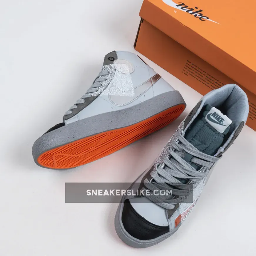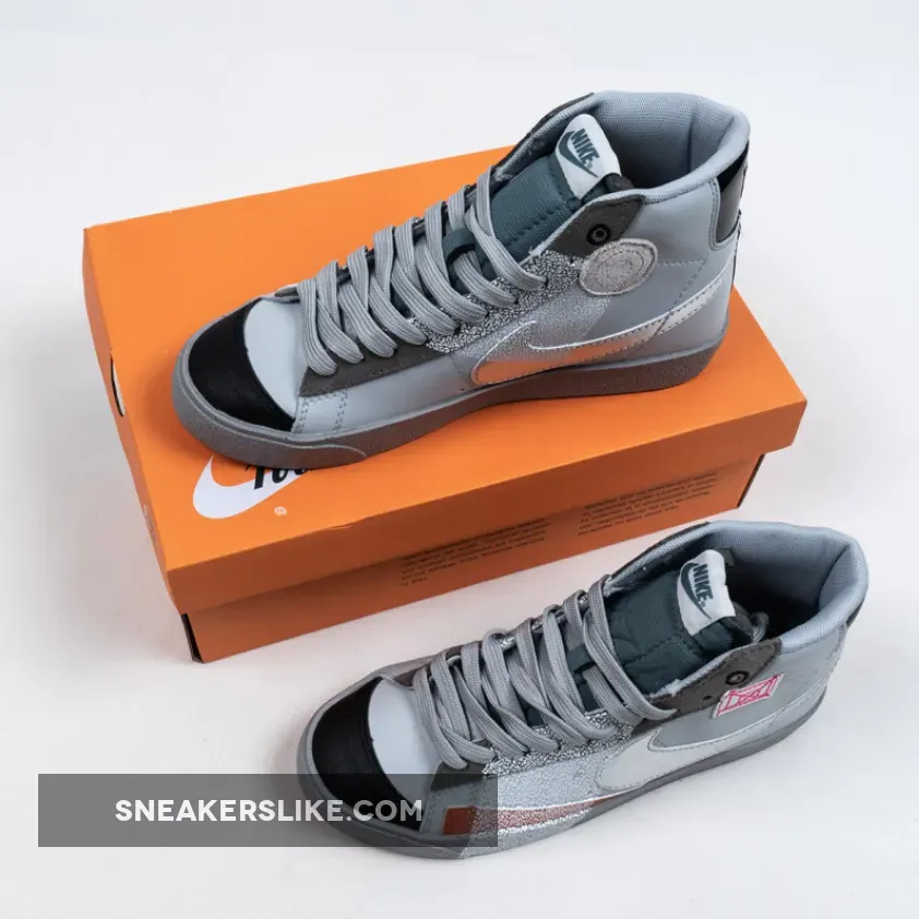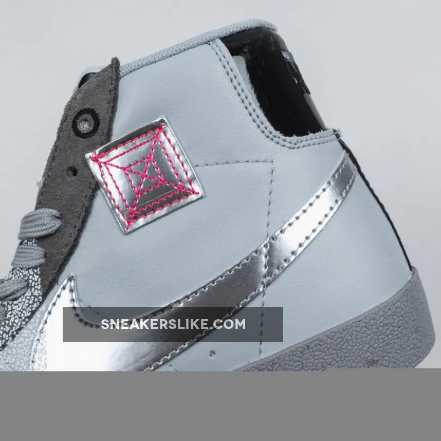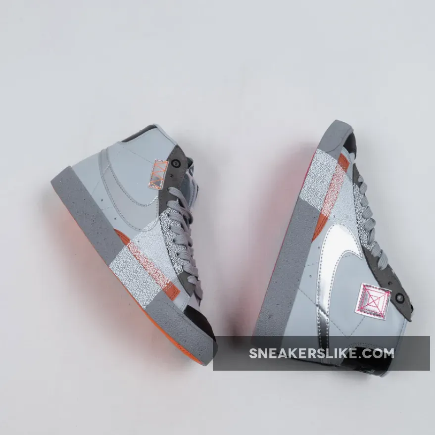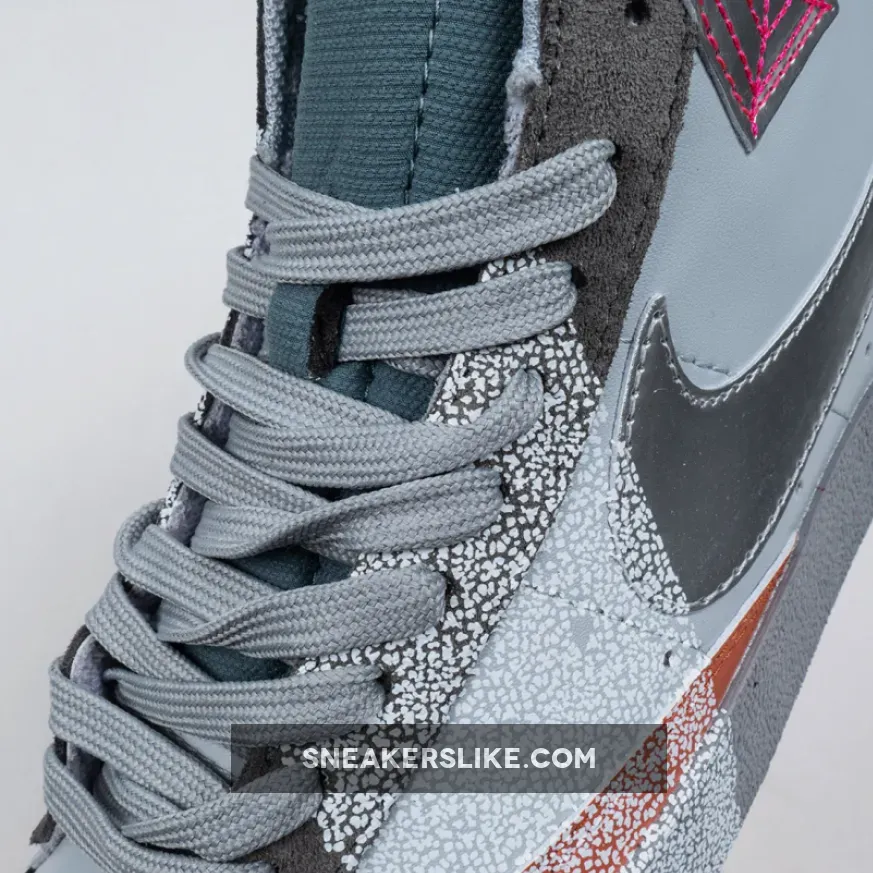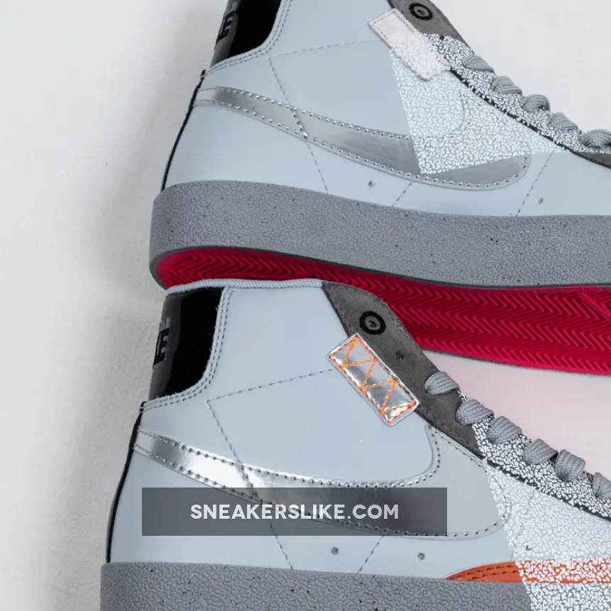 Clad in various shades of grey and blue, the mid-top Blazer makes a statement with the assortment of metallic silver accents throughout its upper. Suede along the forefoot and tongue not only deliver varying texture, but also color-blocking to the pair, with the former sporting a bright orange. The latter features a white paint stroke from lateral midsole to medial midfoot, adding a crackled finish to the lace guard and swoosh it covers. Appropriate for the experimental take, “NIKE” branding on the heel is double-layered, with the text underneath boasting a larger size and reverse orientation. Sole units revel in a midsole slightly reminiscent of the Space Hippie line and vibrant pink tread. Finally, sockliners are branded with “沪”, which translates to the “Shanghai, China” and a swoosh logo.
