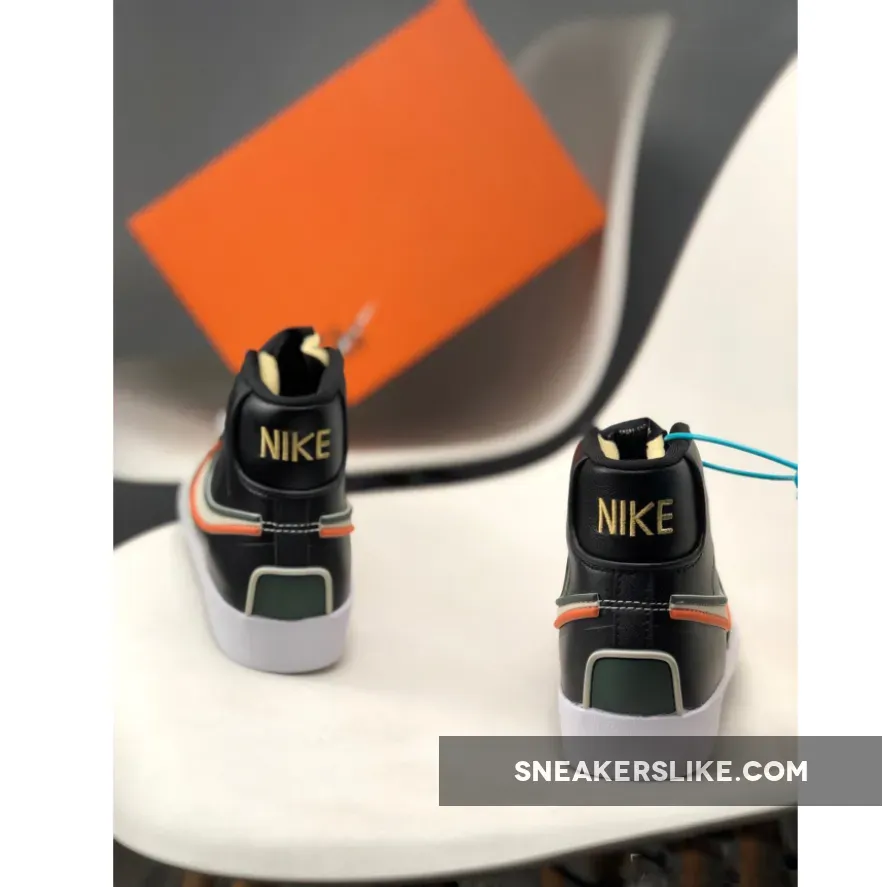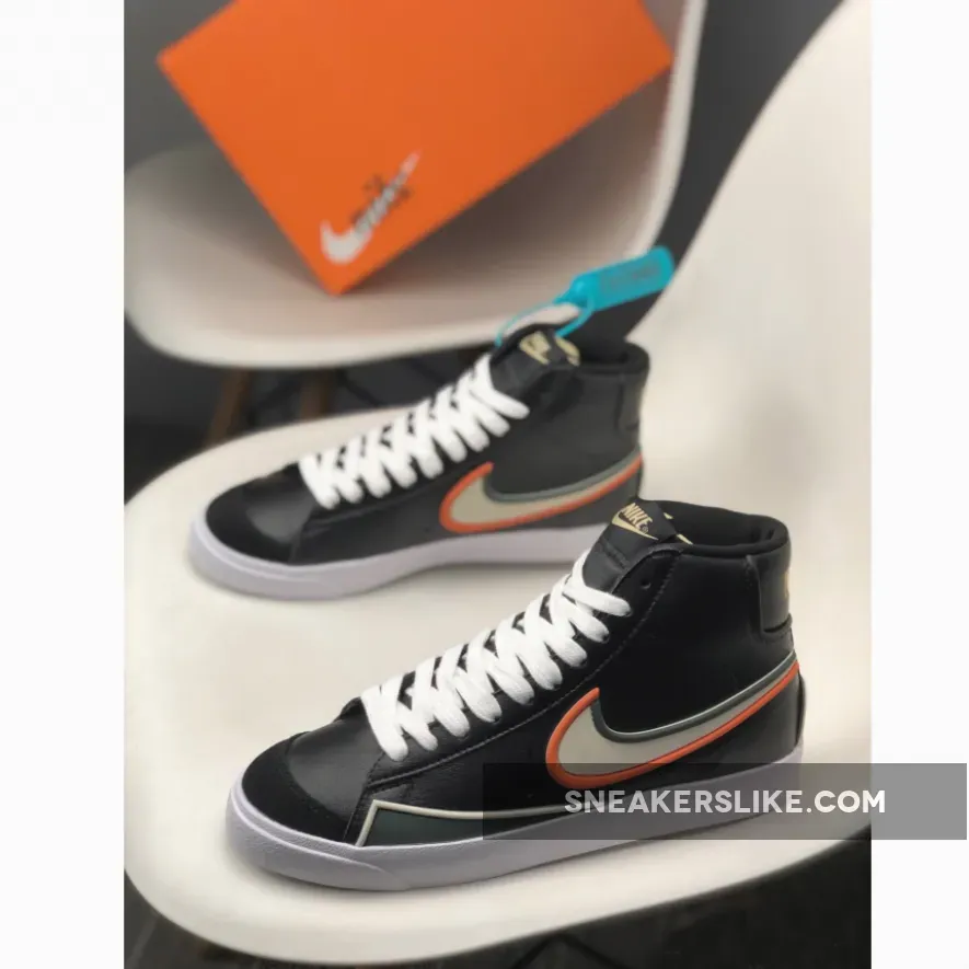 Looking closer this variation of the Nike Blazer Mid comes with Black leather across the upper with White on the Swoosh logo which is outlines in Brown and Steel Blue. The same shade of Blue is seen on the forefoot, Gold branding on the tongue and the D/MS/X logo is placed on the inside of the tongue.