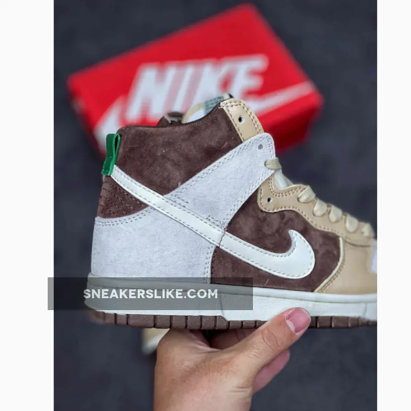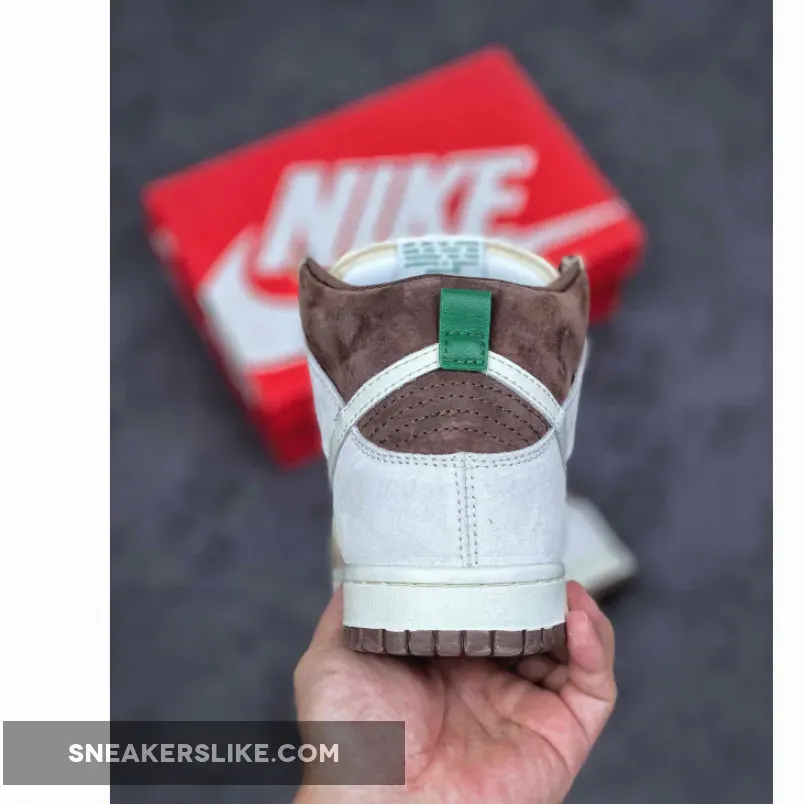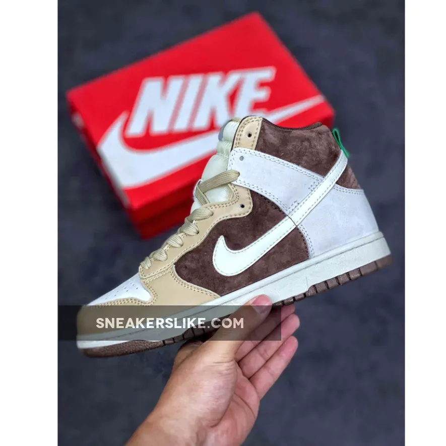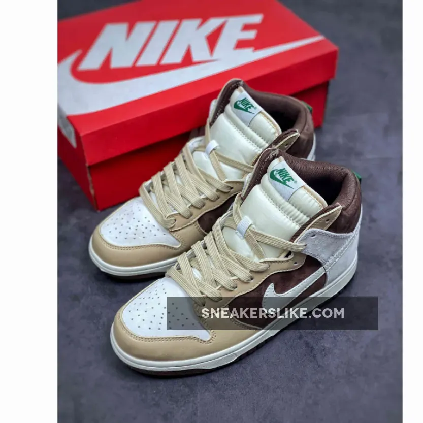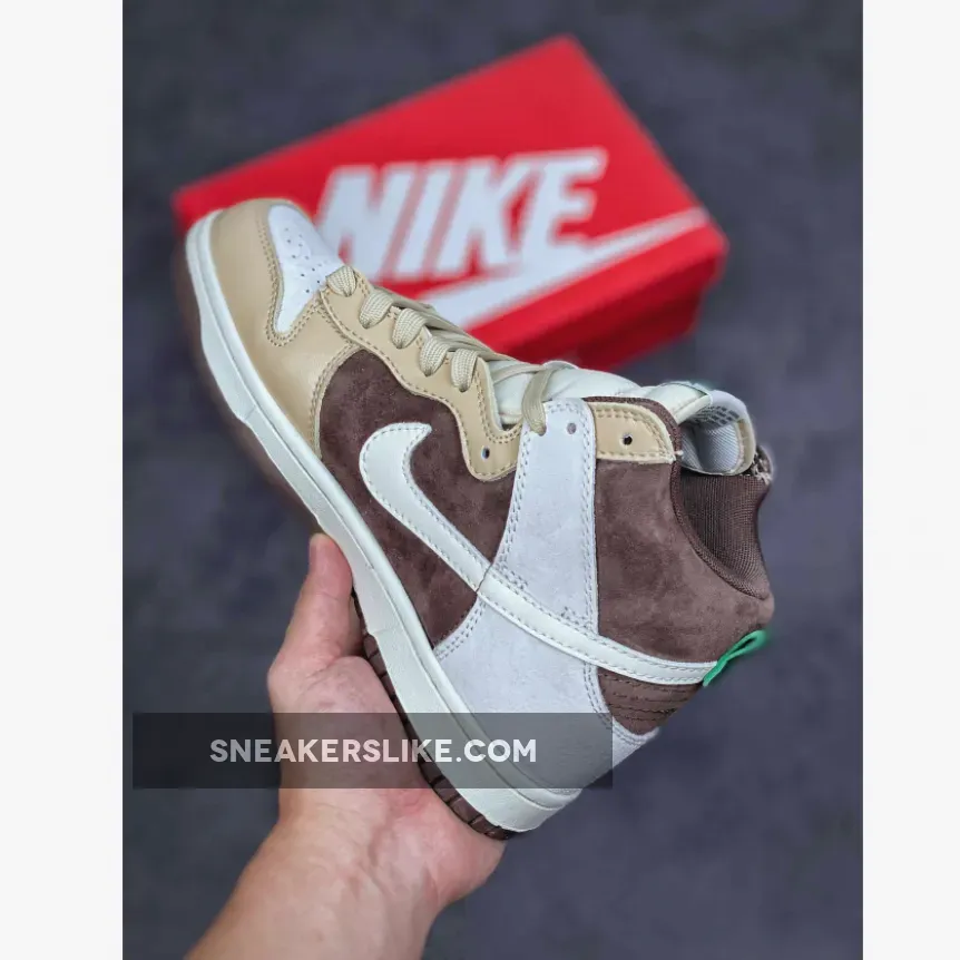 Dressed in a Sail, Khaki, and Light Chocolate color scheme. This Nike Dunk High comes constructed in a mix of suede and leather in a mix of Sail and Brown hues.