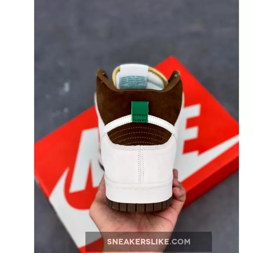 Dressed in a Sail, Khaki, and Light Chocolate color scheme. This Nike Dunk High comes constructed in a mix of suede and leather in a mix of Sail and Brown hues.