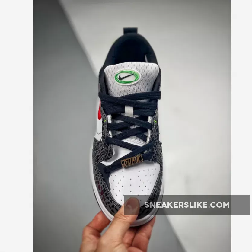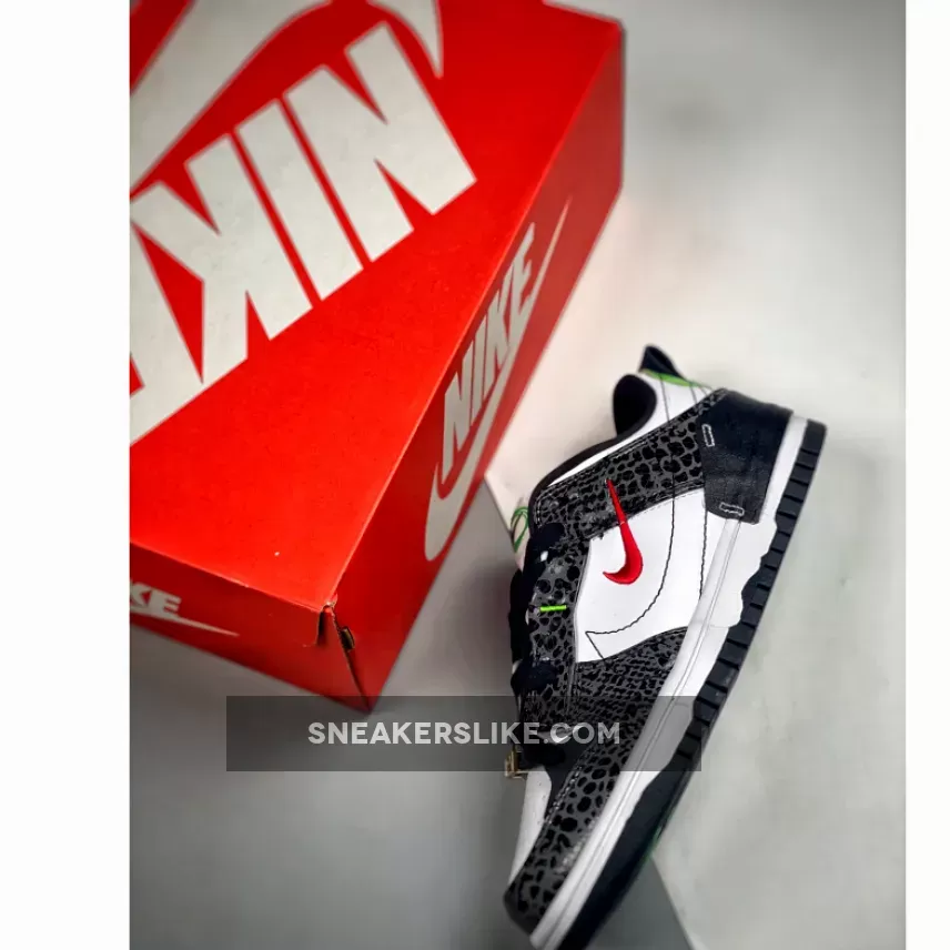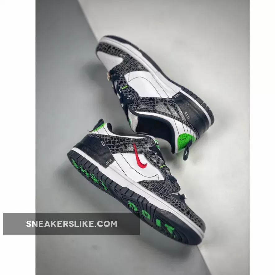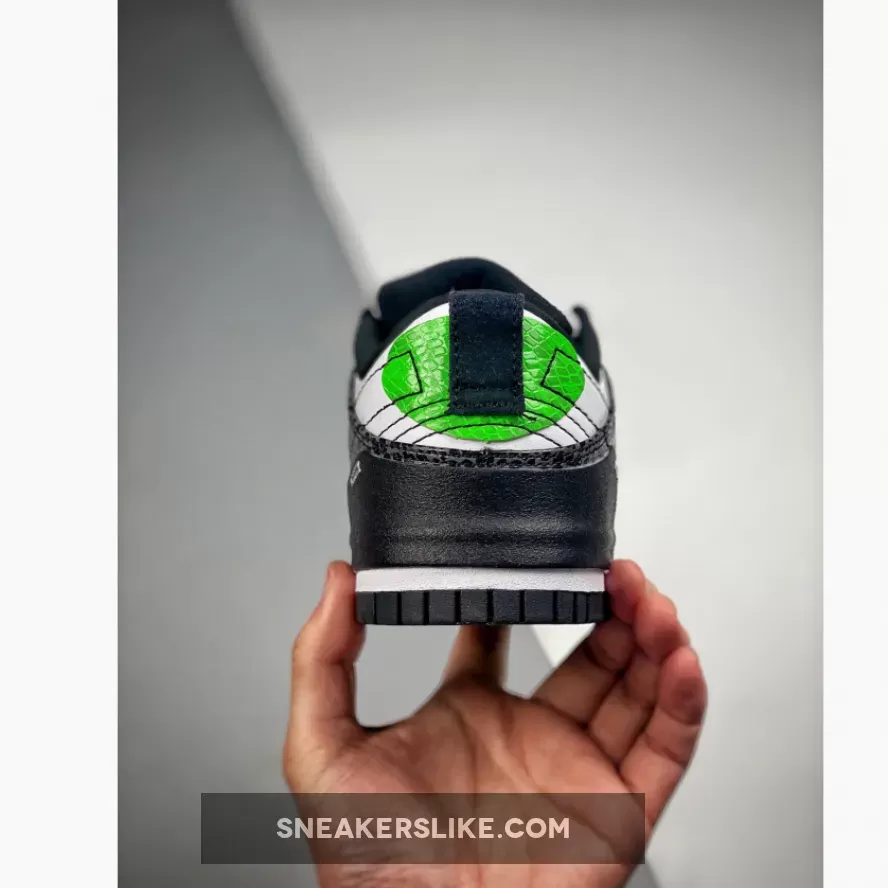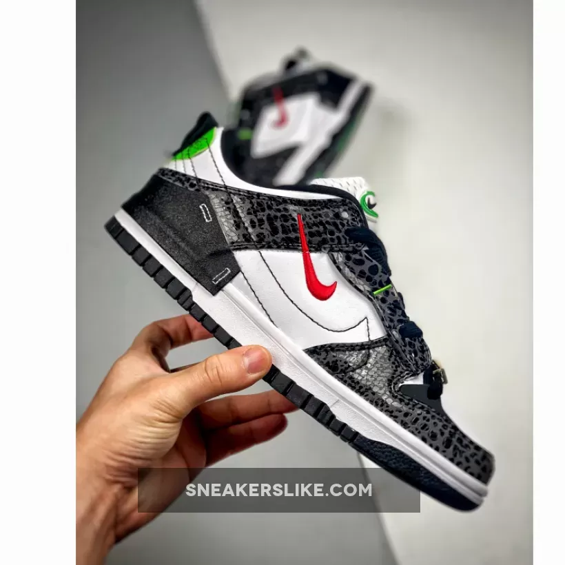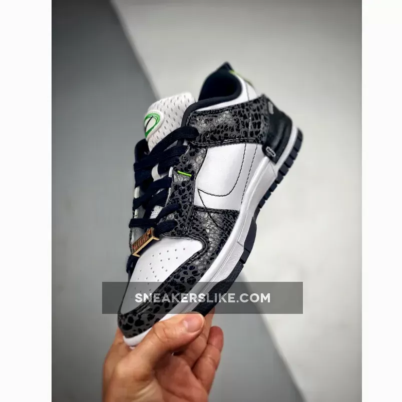 The Dunk Low Disrupt 2 silhouette has a new variant that combines opulence and a classic black-and-white colour scheme. Check out the Nike Dunk Low Disrupt 2 Just Do It Black Snakeskin.The base of this Dunk Low is plain white smooth leather, all the better to show off other eye-catching elements of the shoe. The overlays are glossy faux black snakeskin except for the heel tab which is a bright green snakeskin. The profile Swooshes have a double-stacked motif, with a black stitched Swoosh outline across the lateral quarter and punctuated by an embroidered smaller red Swoosh. More green accents appear on the eyestay panel and the Swoosh branded tongue label.