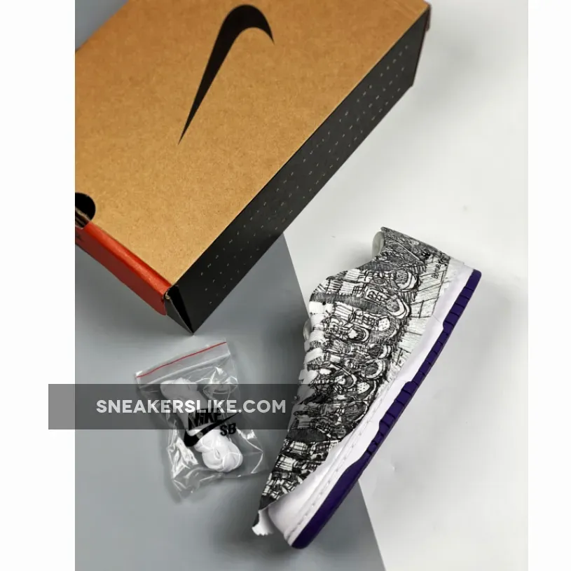 The colorway is possibly a nod an original City Attack pairing from 1999; the purple, white, and yellow are now placed on the Low, with the inverted theme converging on one actual pair with some added dimension of character. While the right shoe exists in the standard purple and white, with all the logos in proper place, the left executes a true inversion of its counterpart not just with the color, but even with the Nike logos on the tongue, heel, insole, and Swoosh. Ostrich leather is added to the overlay off both sides to further separate itself from the two ’99 Dunk Highs, although it hardly needs it. Finally, Nike coveres the upper with a box tissue layer featuring penciled illustrations of a gang of Dunk wearers on the street, with the same visuals seen on the insoles.