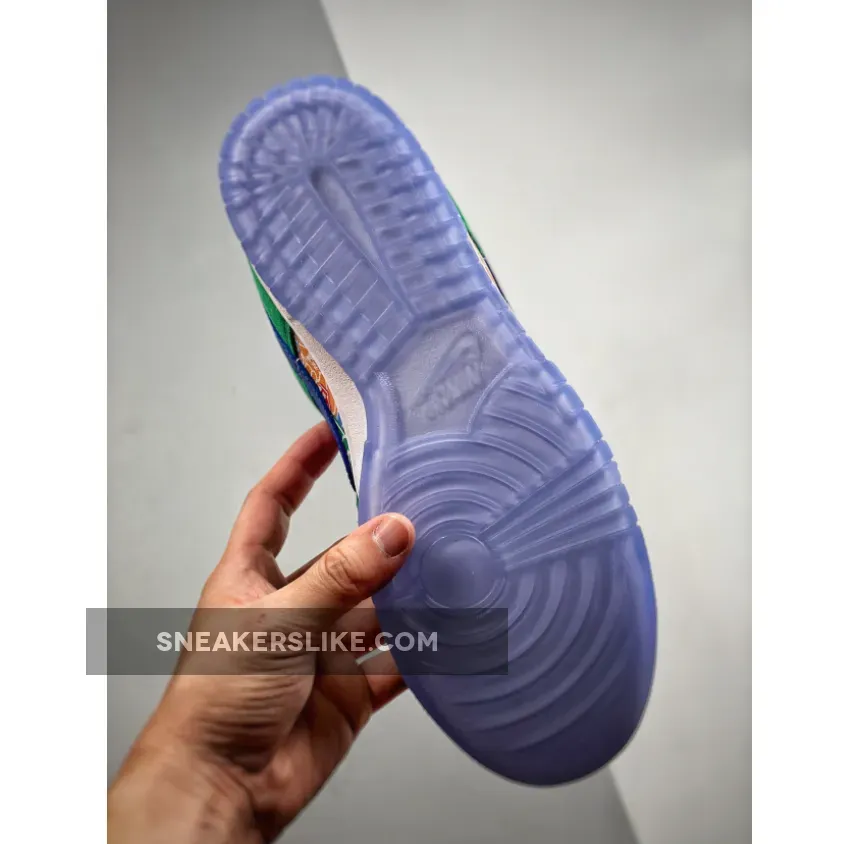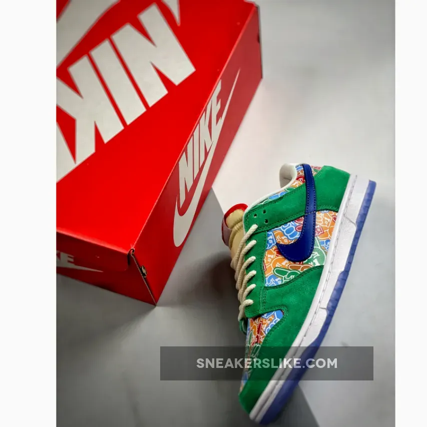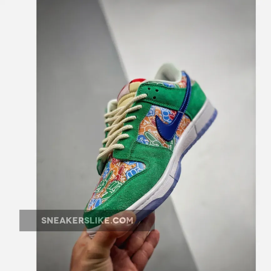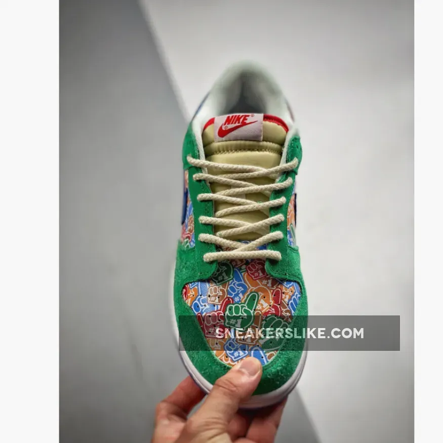 Dressed in a Stadium God, Old Royal, White, and University Red colors scheme. This offering of the Nike Dunk Low features a leather base fully covered in multiple-colored foam fingers paired with Green suede overlays.