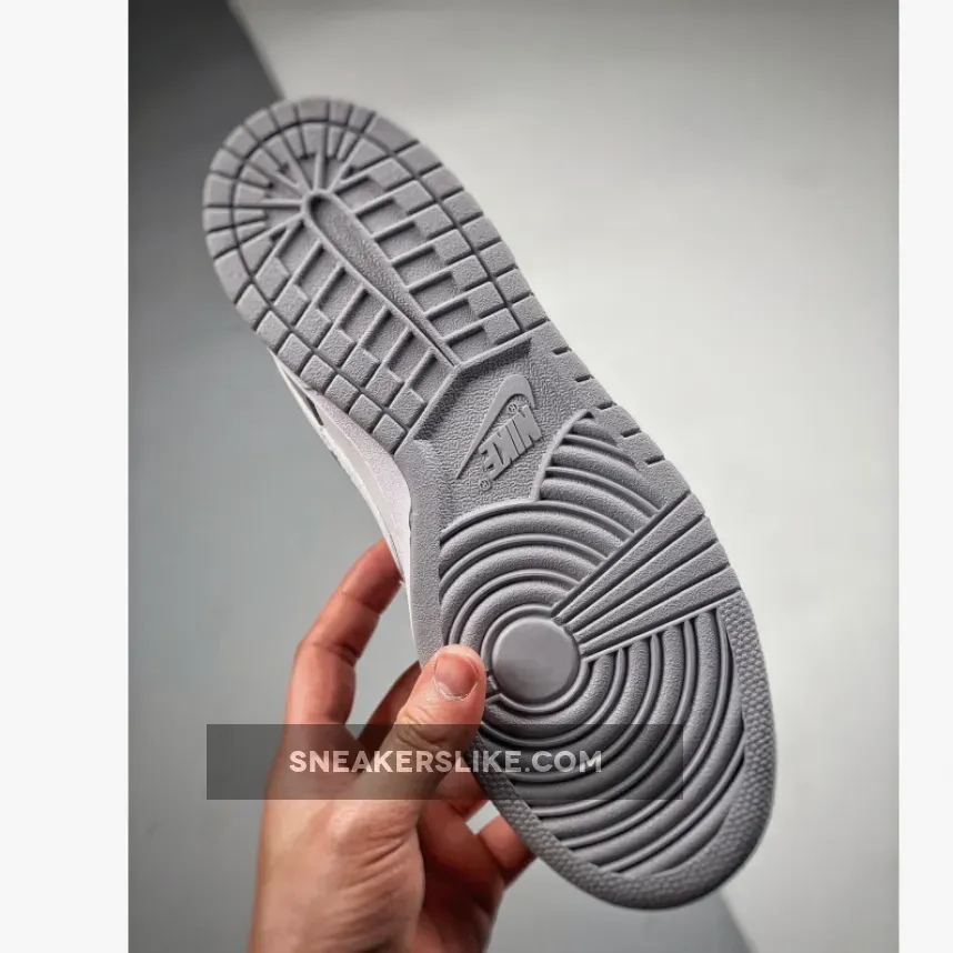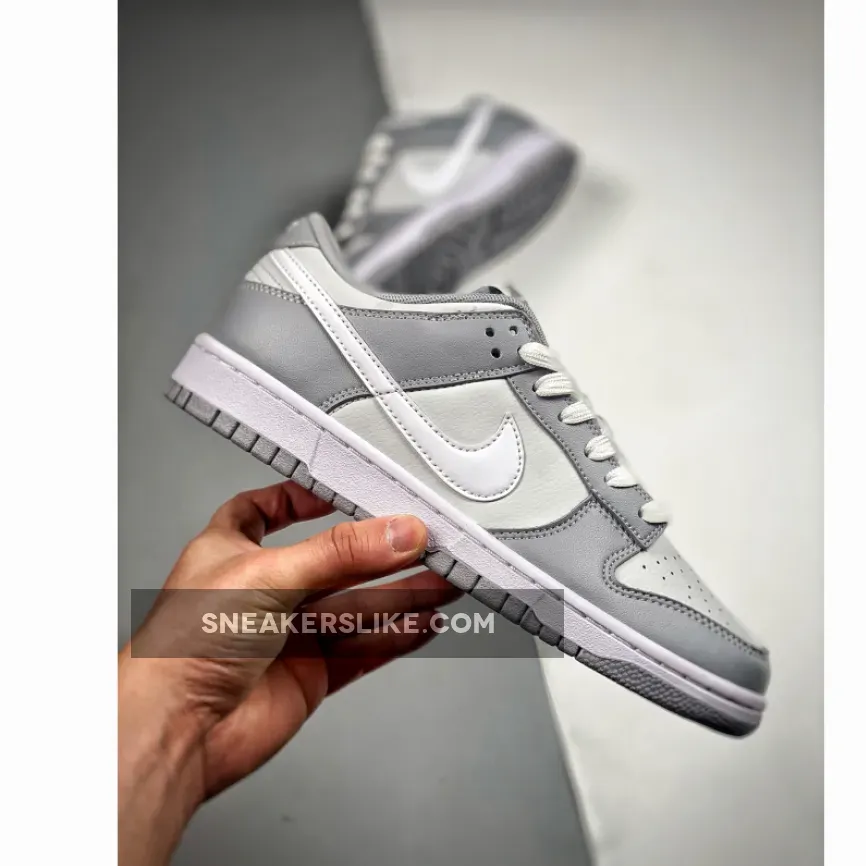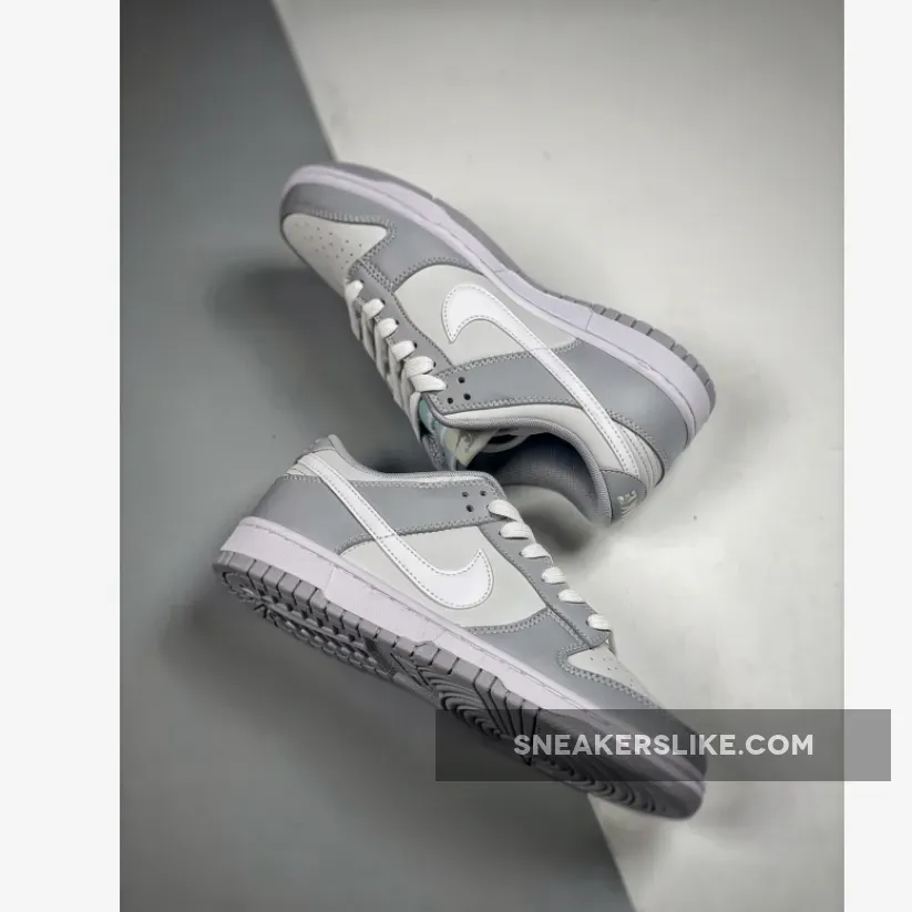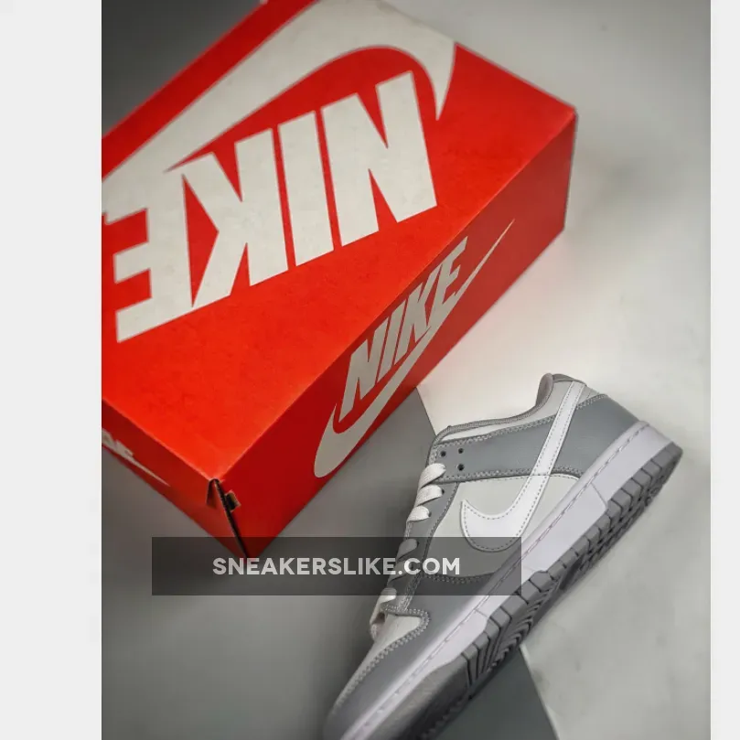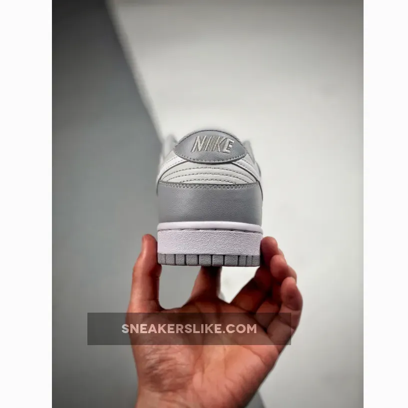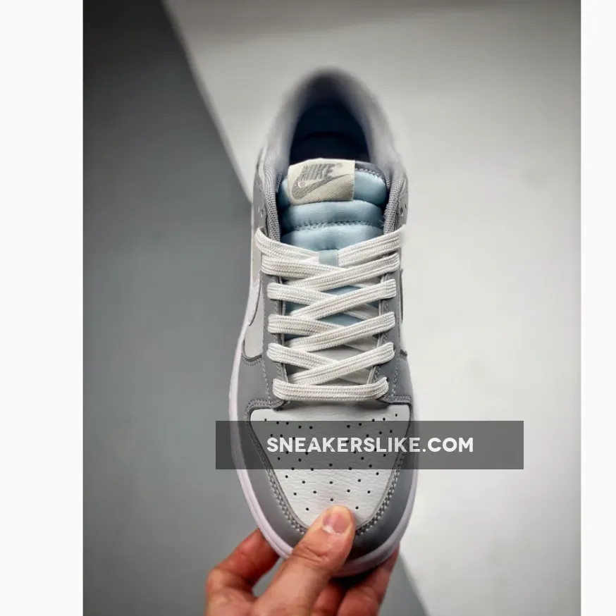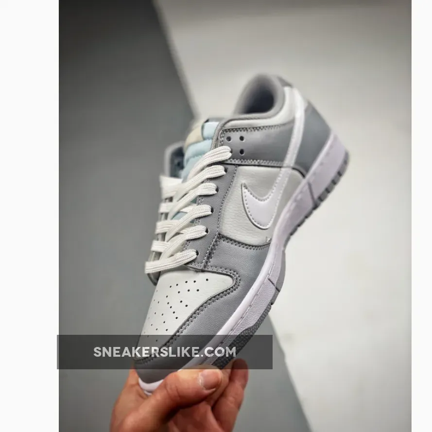 A new Nike Dunk Low comes dressed in a cool two-toned colourway. Introducing the Nike Dunk Low Grey White.The base of this shoe’s upper is light grey tumbled leather on the toe box, the quarter and the heel. The overlays are smooth leather in a slighter darker grey on the toe cap, the mudguard, the eye stay panel and the foxing. This darker grey is repeated on the mesh sockliner. The profile Swooshes on the medial and lateral sides are a clean white, matching the laces. The tongue contributes to all the cool tones in an icy blue with grey piping.