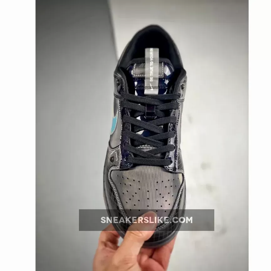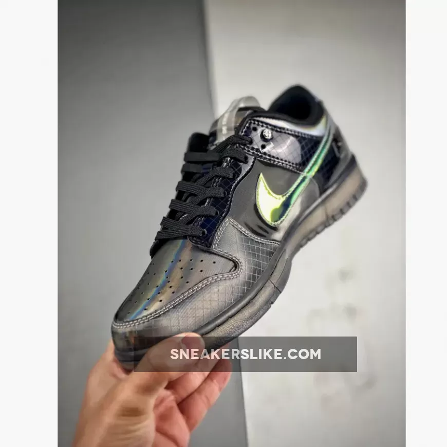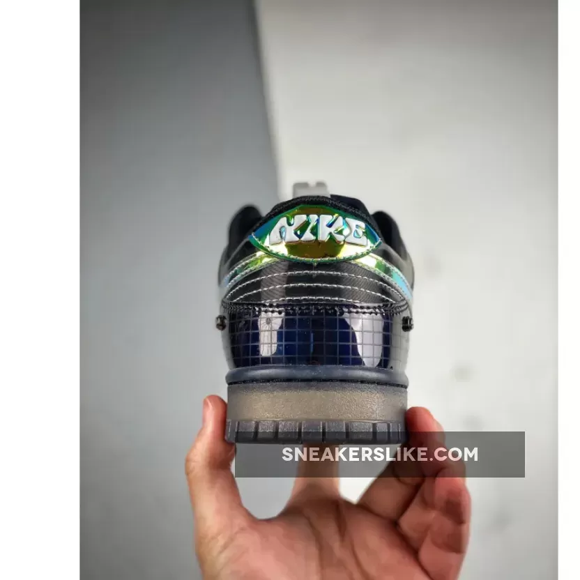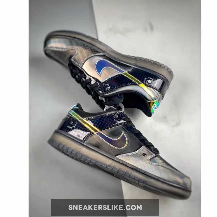 Nike is launching a second iteration of the Dunk Low “Hyperflat”, featuring darker, grey-scaled approach. The gridded pattern at the toe-guard captures that gun-metal hue, contrasted by the pitch black lace collar and heel — but off-set by a slightly oily finish. The Swoosh and heel tab, in particular, boast a reflective gloss that adds a touch of allure. The font choice blends nostalgia with a hint of retro-robotic aesthetics. Completing the overall look are the tongue pull-tabs, Phillips-head rivets, and a smoke-grey transparent outsole.