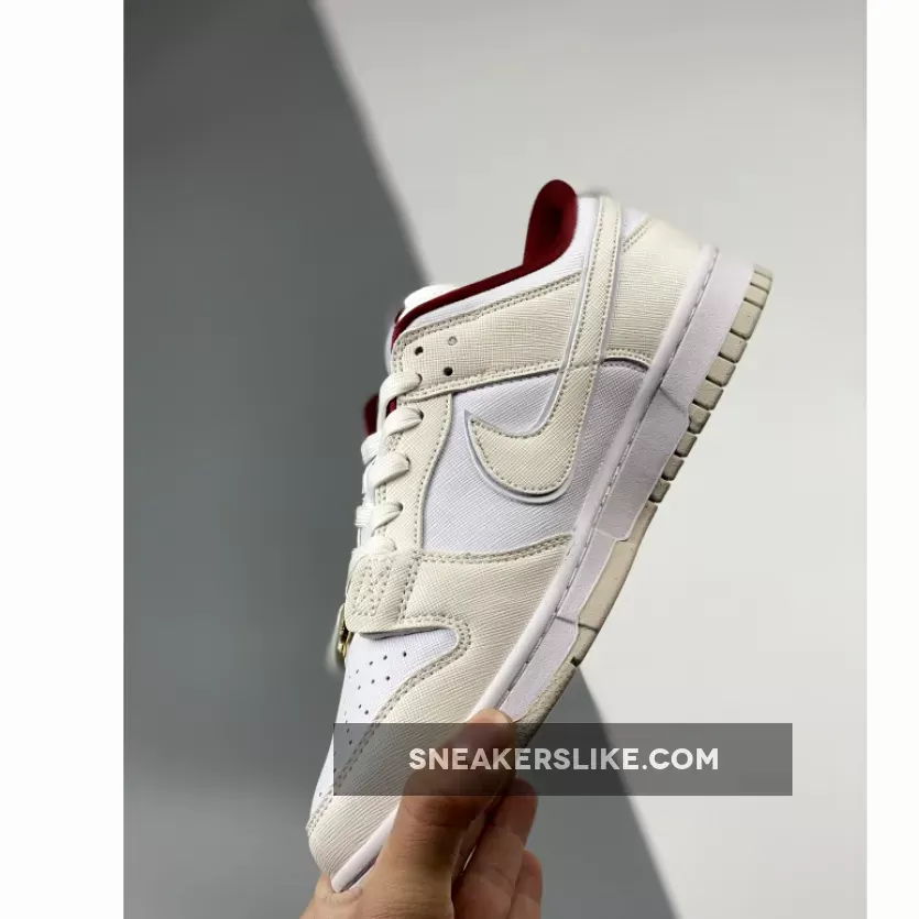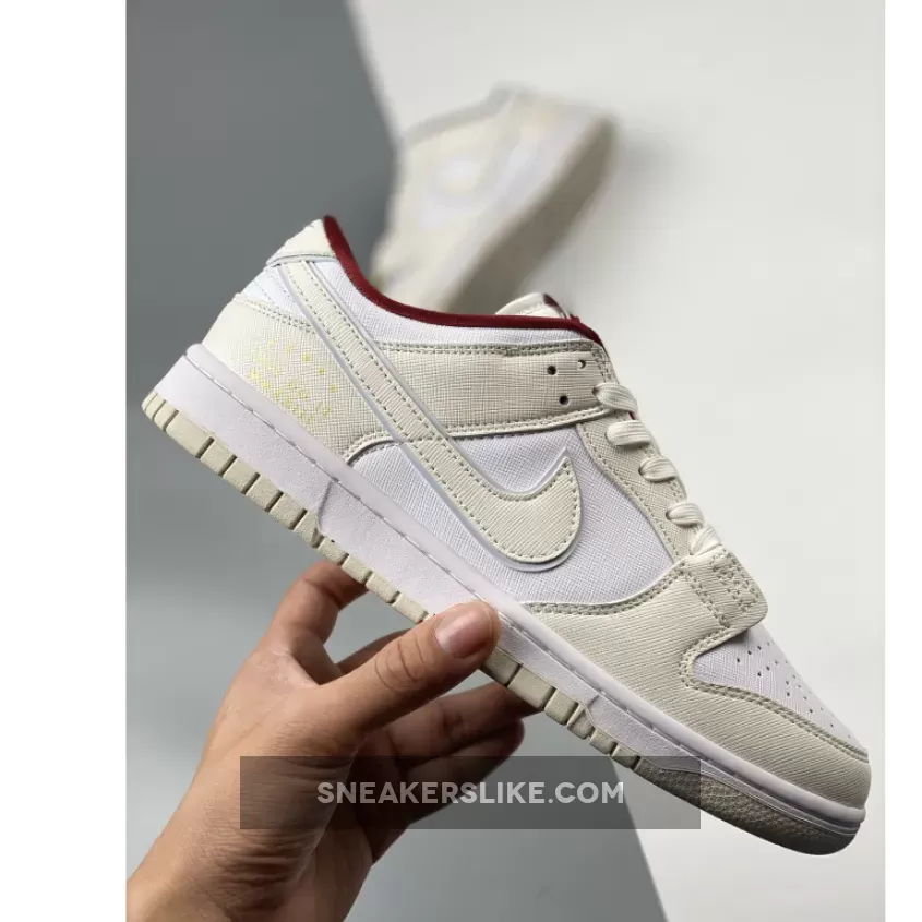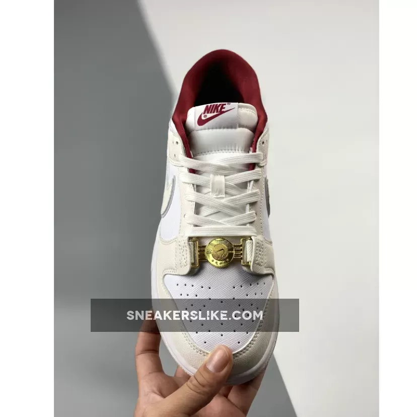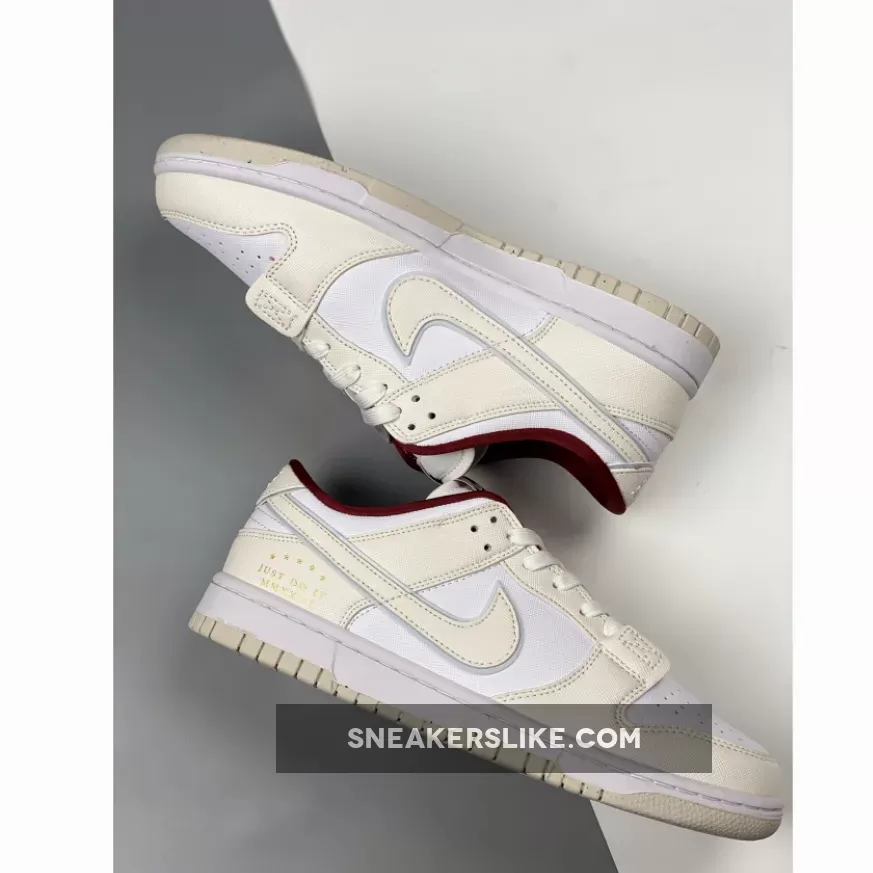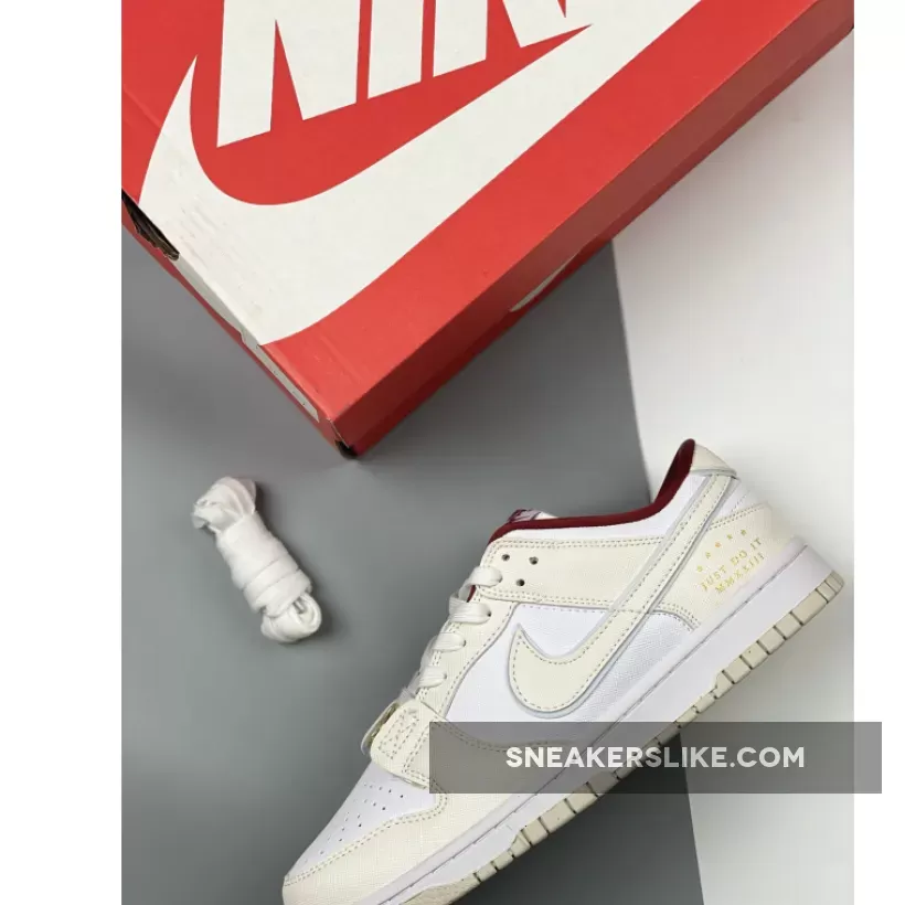 The Dunk Low gets coated in soft hues and sharp slogans for this iteration of the Just Do It collection. Dropping alongside a Nike Blazer and Air Force 1 Low, another iconic silhouette joins a strong roster for the JDI collection. Embodying a gentle approach, Nike packs a sophisticated punch with the smaller details on this edition.Imbued in white and sail leather, the classy upper keeps it cool while the gold details do all the talking. On the lateral heel, Nike’s iconic slogan is announced in capitalised gold lettering, with gold stars arching above that’ll have you reminiscing about your outdated EU Passport. Inside, the passport motif is continued with a regal shade of burgundy, suggesting you need these laced on your feet for any upcoming flighty adventures. The ring-shaped dubraes are a playful addition that are similar to a number of other contemporary Nike releases that have toyed with the traditional lace decorations, such as the “Cuban Link” Air Max 90s from 2020. The dubraes boast the same slogan and line detailing seen on the insoles, rounding off the Just Do It motif.