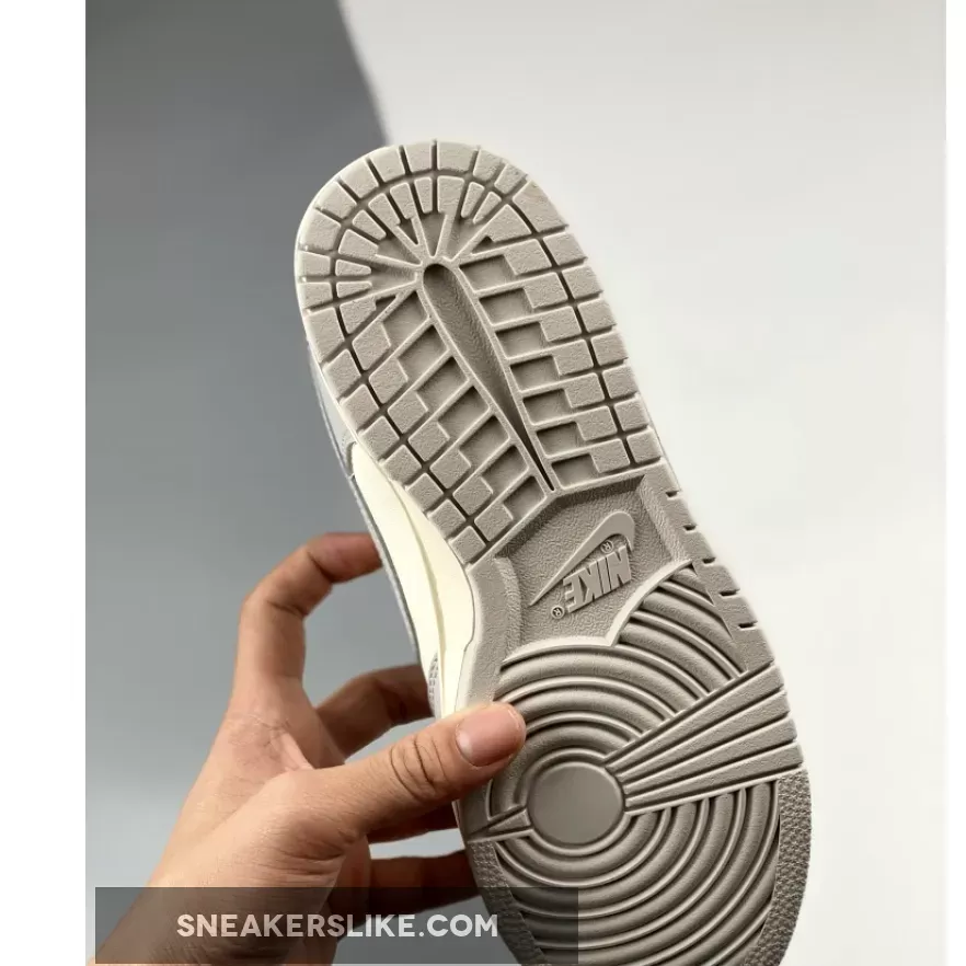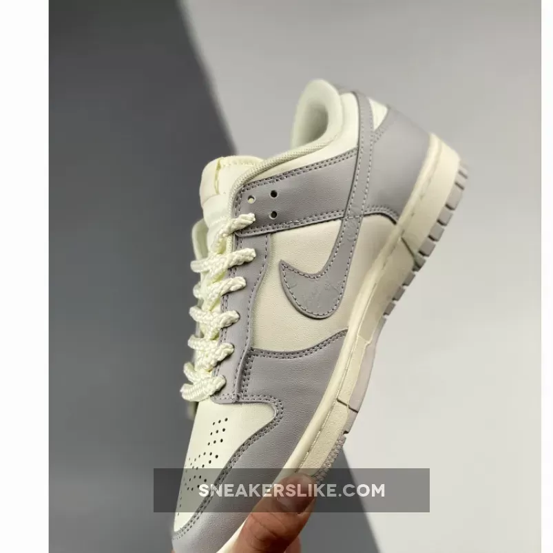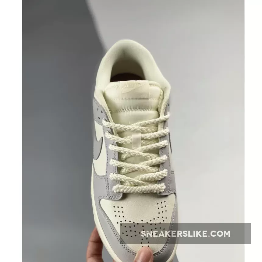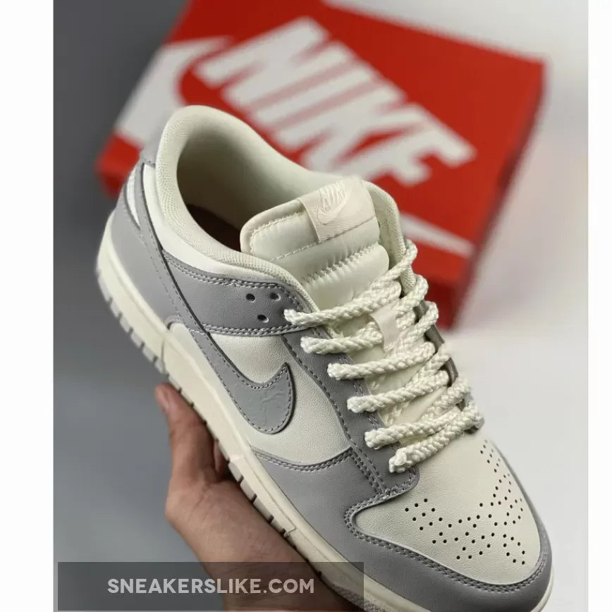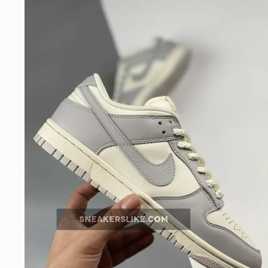 this Nike Dunk Low gets done in Sail/Aura-Tawny-Metallic Silver as the sneaker starts off with a leather construction all throughout the upper in sail and grey. The Swoosh has been introducing a number of playful features onto its iconic silhouette roster, with this Dunk Low “Needlework” edition combining a number of them onto one piece of footwear.