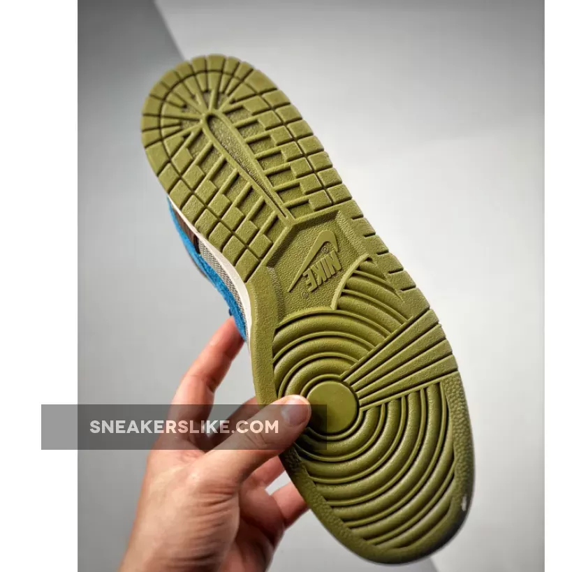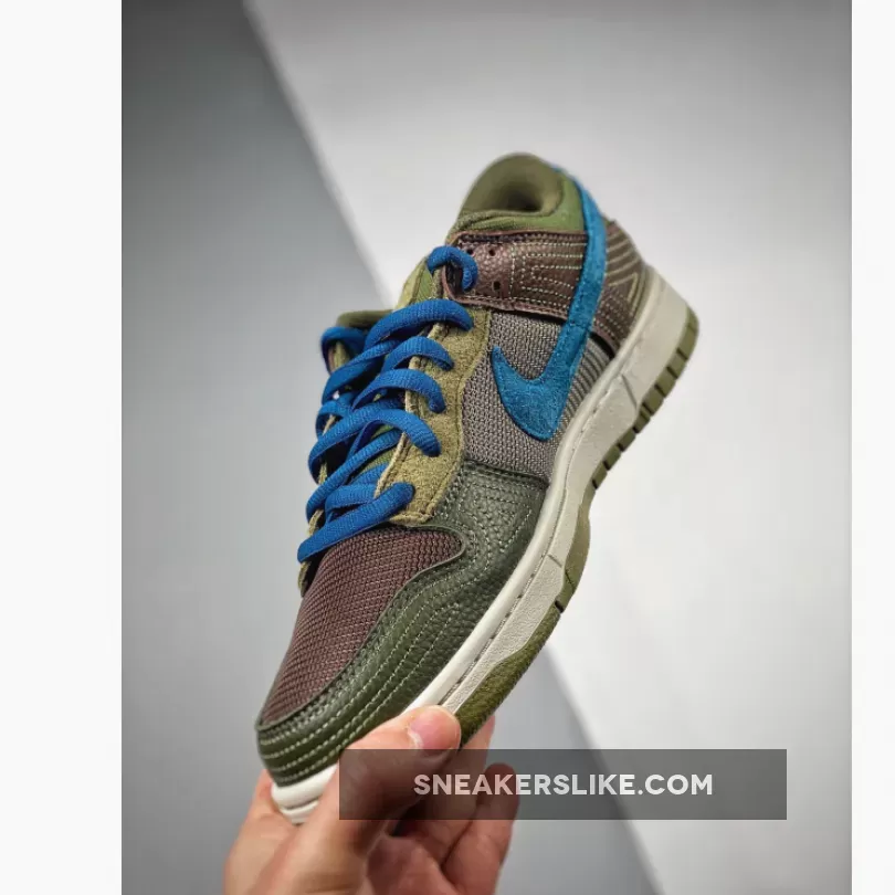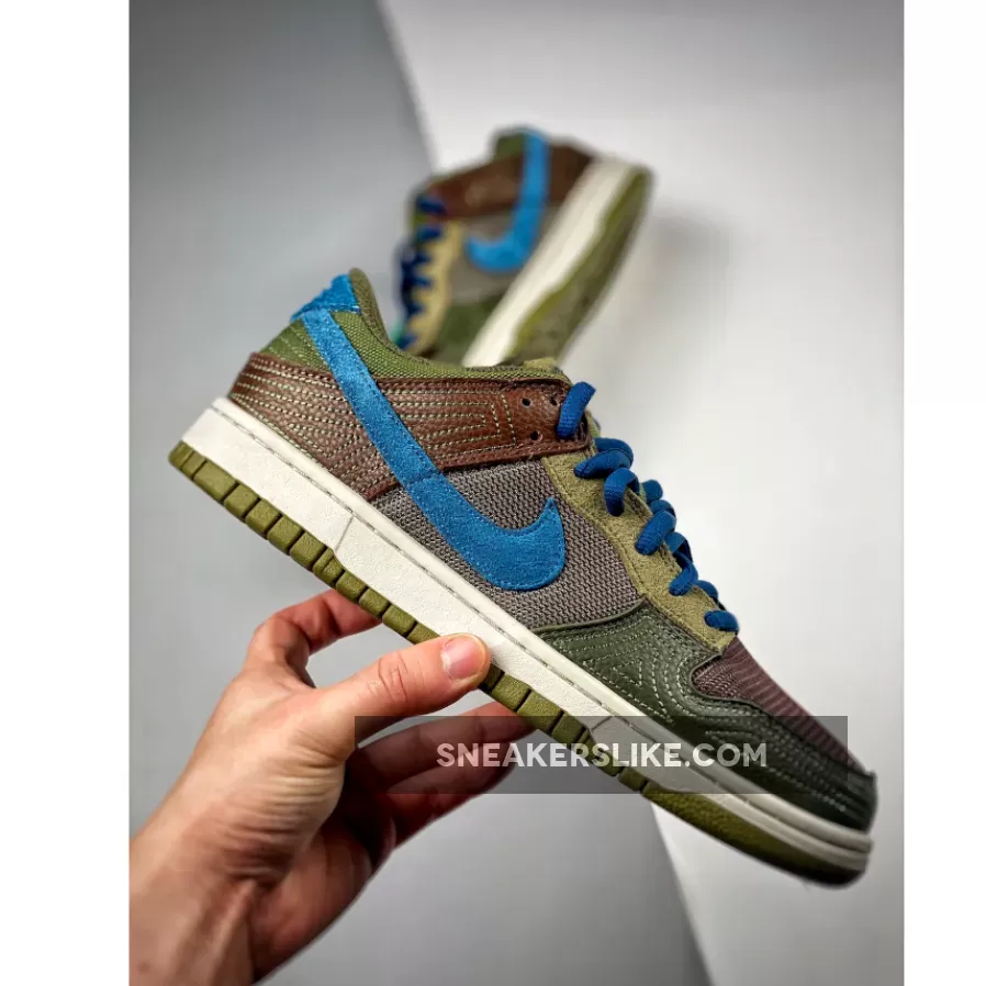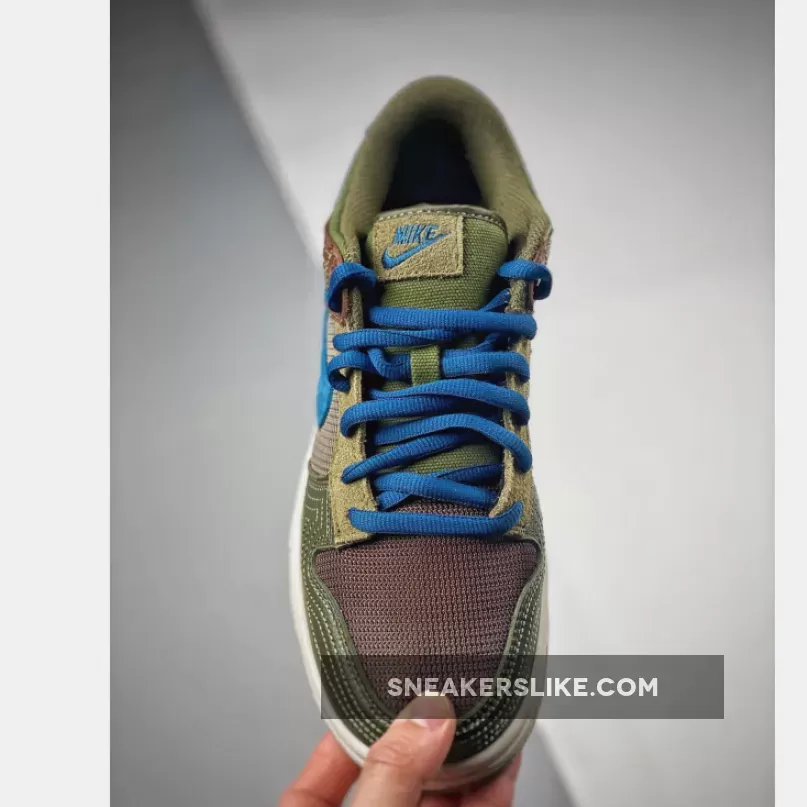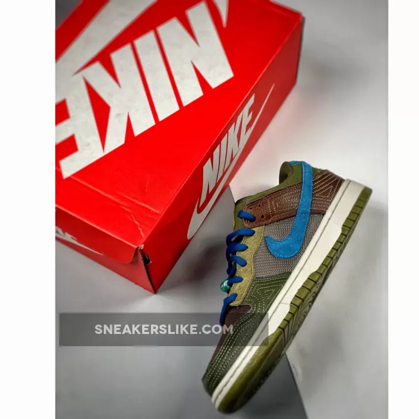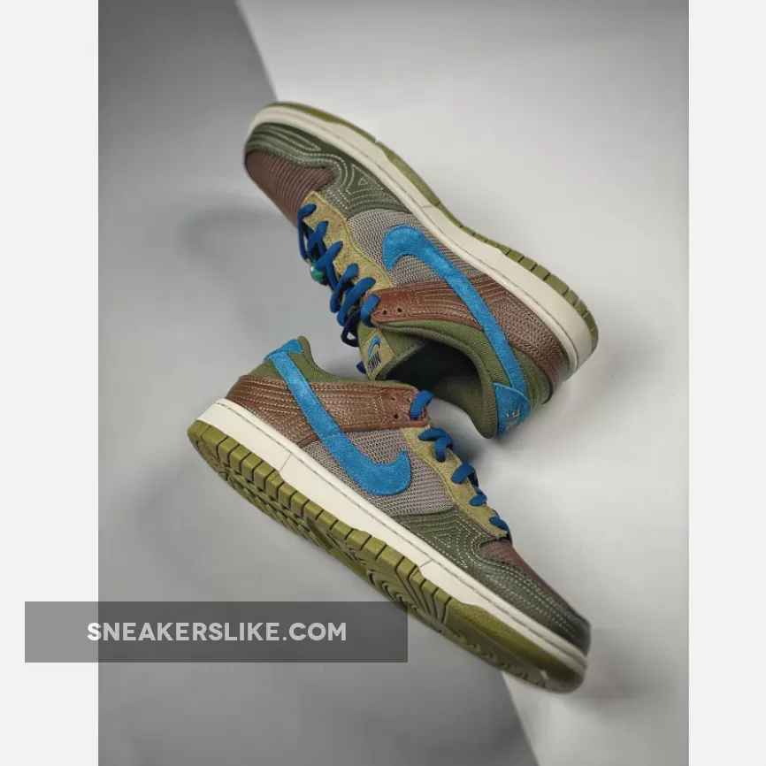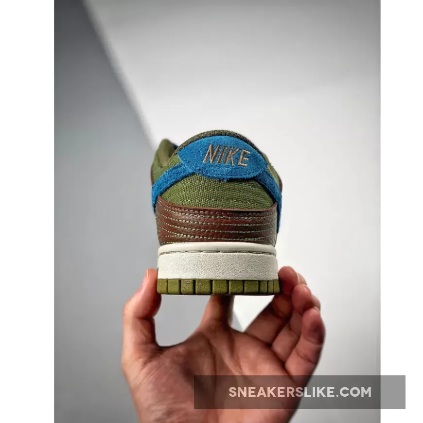 The setup starts with a low-top profile decorated with classic Nike branding details such as branded tongue labels and heel tab and Swoosh logos on the lateral and medial sides. In terms of construction, the setup sees a mix of tightly-woven mesh, fuzzy suede, and smooth leather, painted in earthy shades of green and brown which nods to its cacao bean inspiration. A set of blue shoelaces and Nike Swooshes, white full-length midsole, add a contrasting touch to this tropical design.