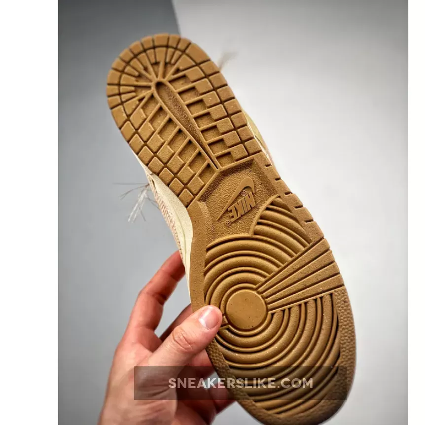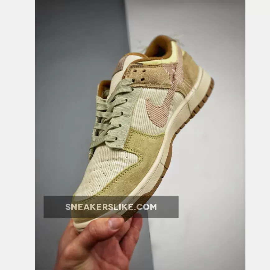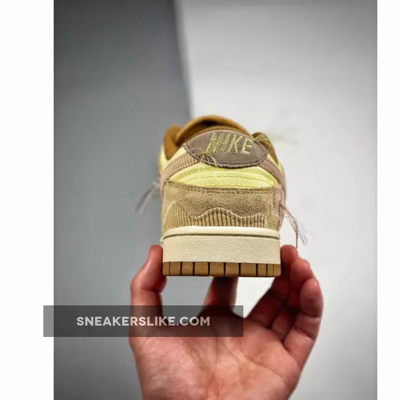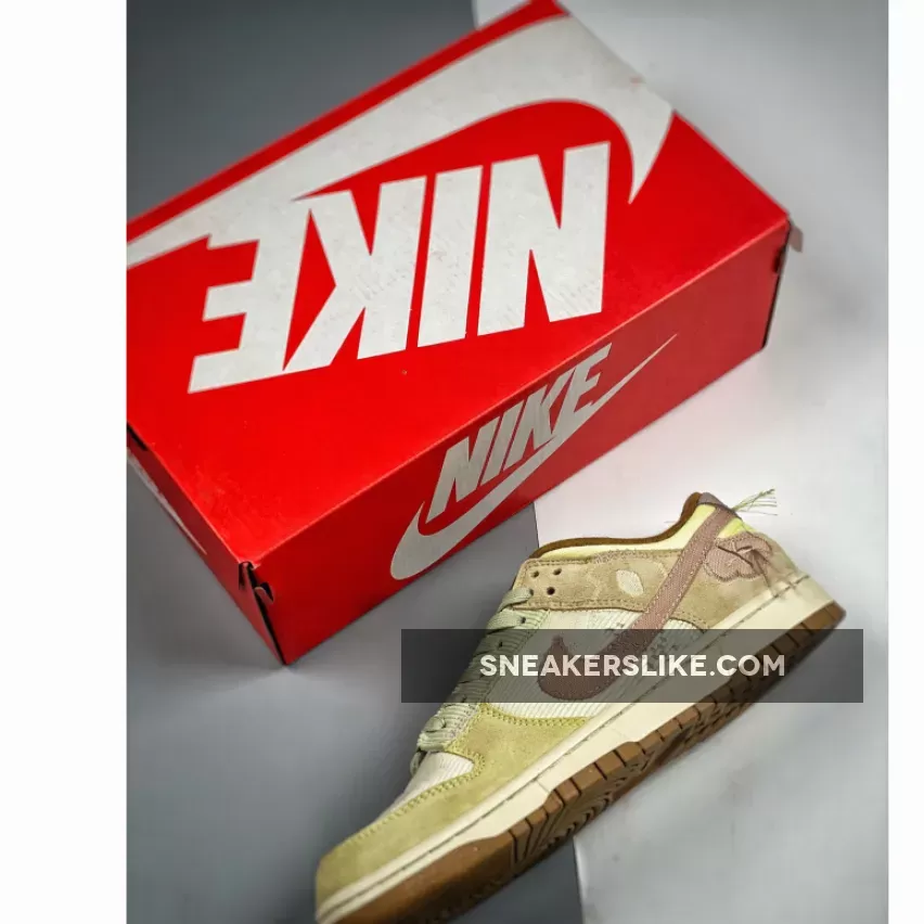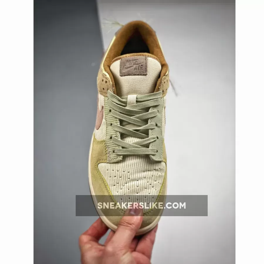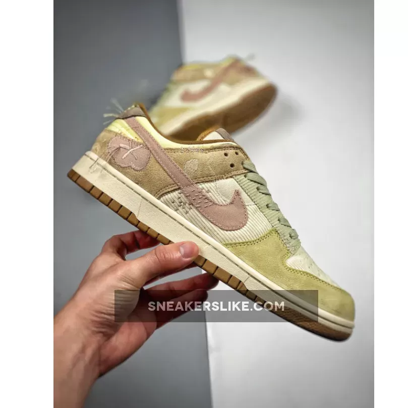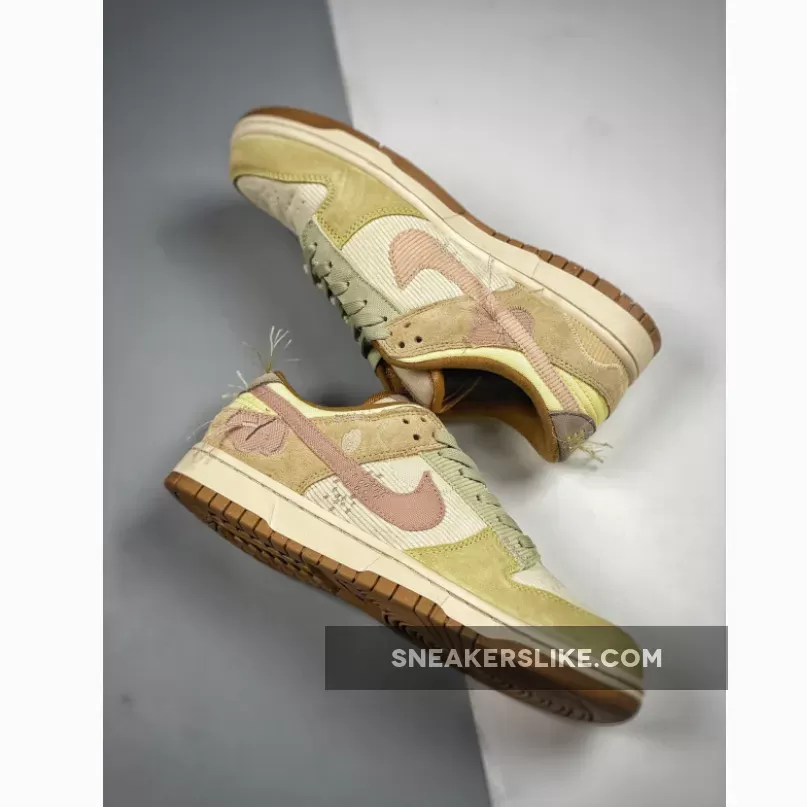 The new Nike Dunk Low experiments with materials and dons pretty pastels. Make the acquaintance of the Nike Dunk Low Bright Side.The base of the upper is a corduroy-like ribbed material showing on the toe box and the quarter. The overlay on the toe cap is suede in a beige-grey hue, matching the ribbed material eyestay panel and the laces. The foxing is also suede but in a darker tan. The suede heel tab is a light lavender colour. The signature profile Swooshes on the lateral sides are canvas in a lavender colour with a smattering of embroidered accents in the same colour marking the Swooshes midway. The swooshes on the medial side are pink in the ribbed material similar to the base but in lavender. Brown denim twill piping lines the cream tongue and the collar.