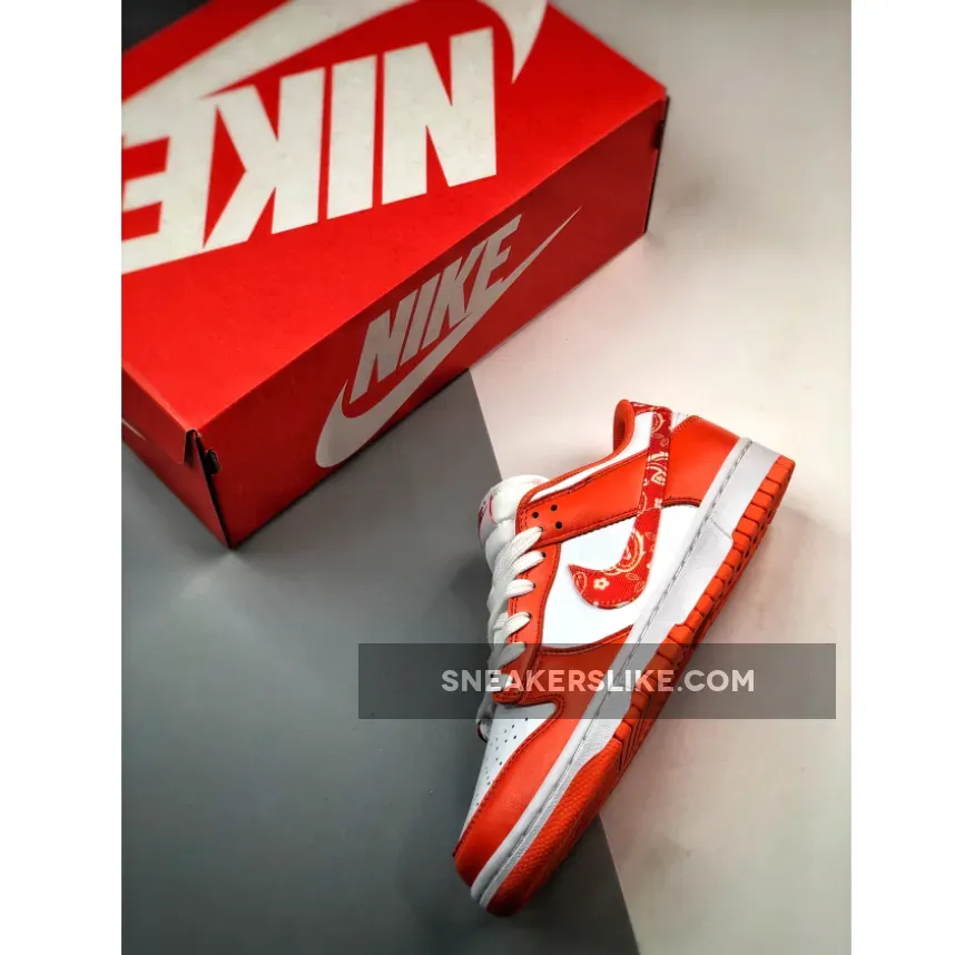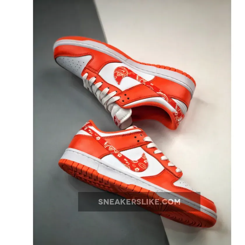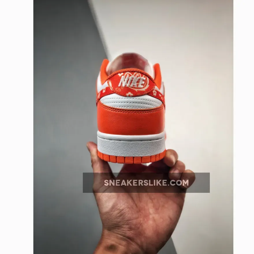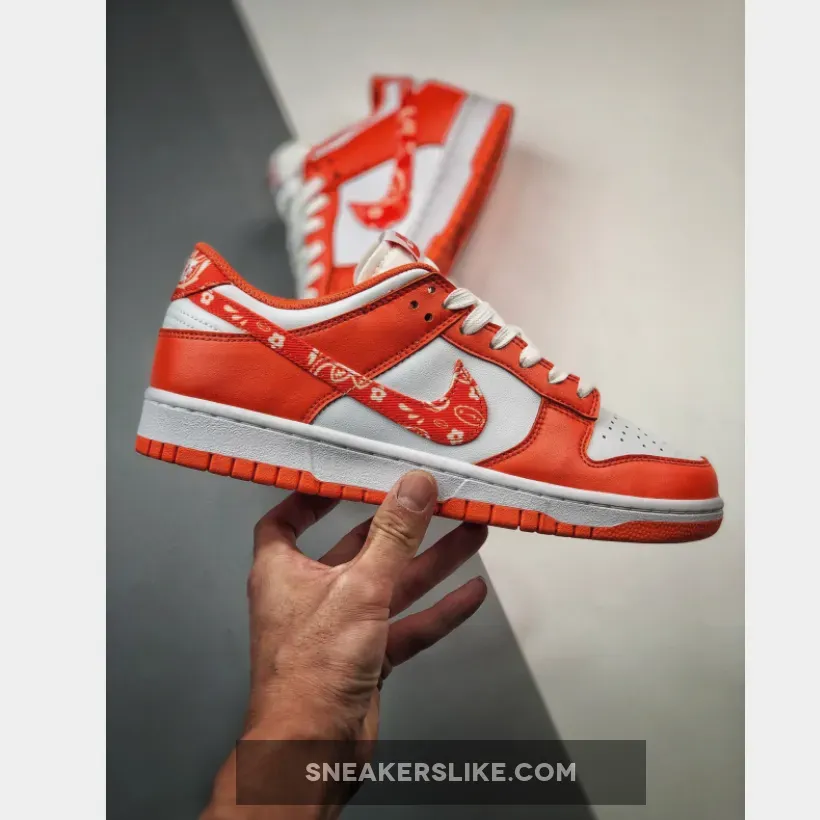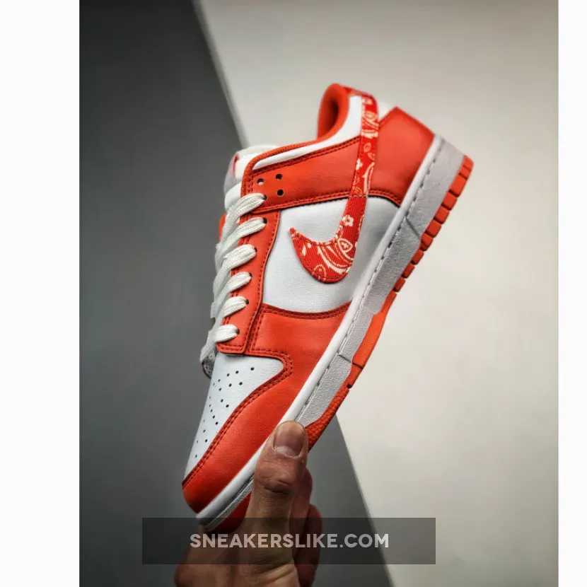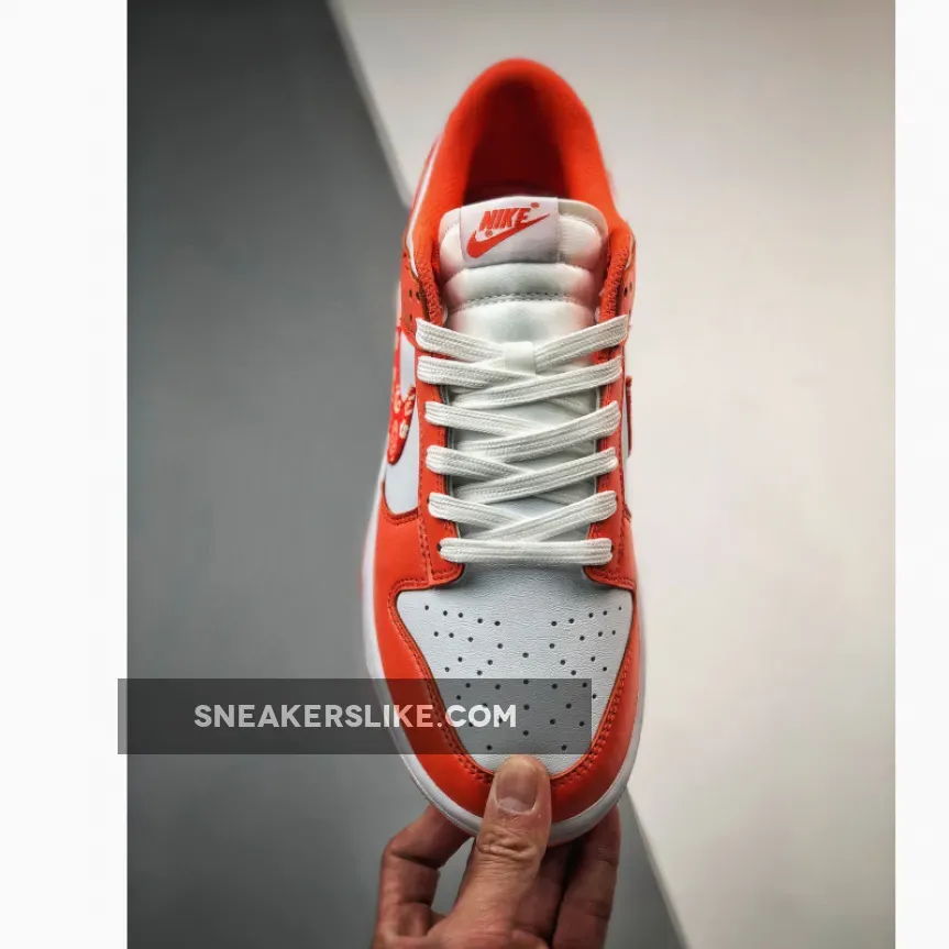 Nike Dunk Low Orange Paisley is guaranteed to brighten up any outfit you’ll pair it with. This new member of the “Paisley Pack” stands out with its undeniably exuberant colourway. Zesty “Syracuse” orange overlays on the toe, eye stays, and ankle decorate this Dunk Low’s pristine white base.