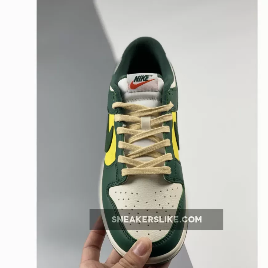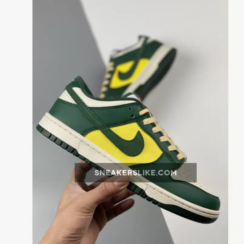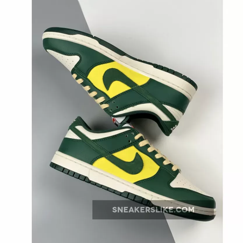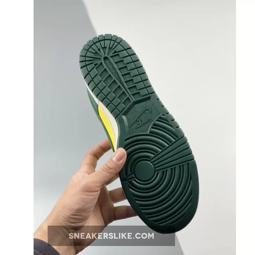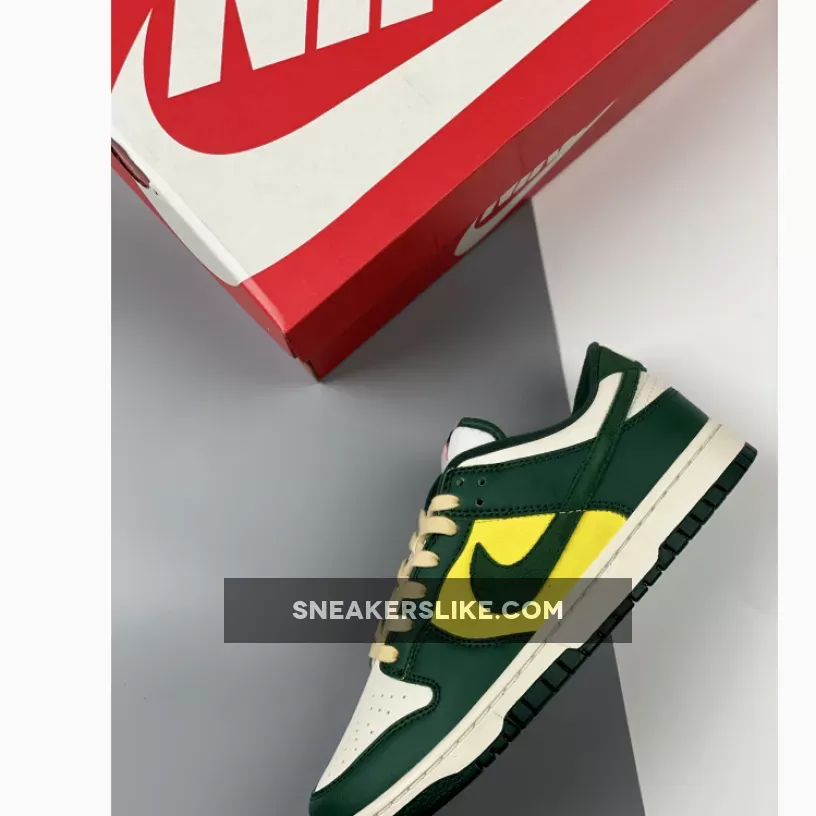 Coming with a mixture of tumbled leather and suede, the sneaker comes dressed in shades of noble green, sail, yellow, and a vintage tan hue throughout the entire upper. the Nike Dunk Low “Noble Green” makes full use of its titular color, applying it throughout the tumbled leather overlays as well as the suede Swoosh. Wheat laces create an aged effect while a classic white midsole rests atop its signature green shade at the outsole. Retro-branded tongues, “Athletic Company” insoles atop a two-tone rubber sole completes the design.