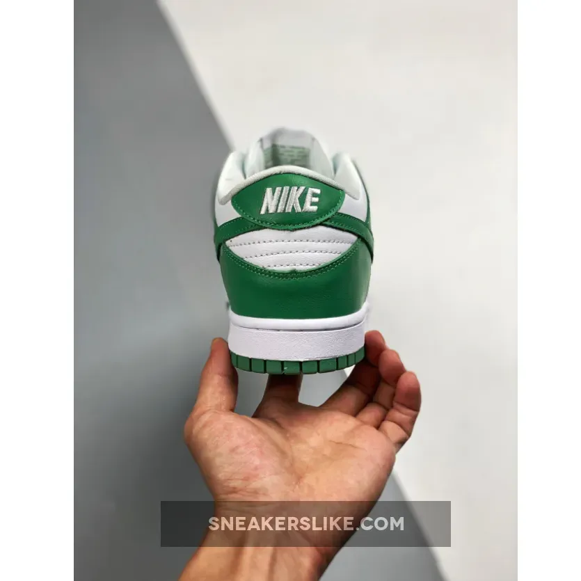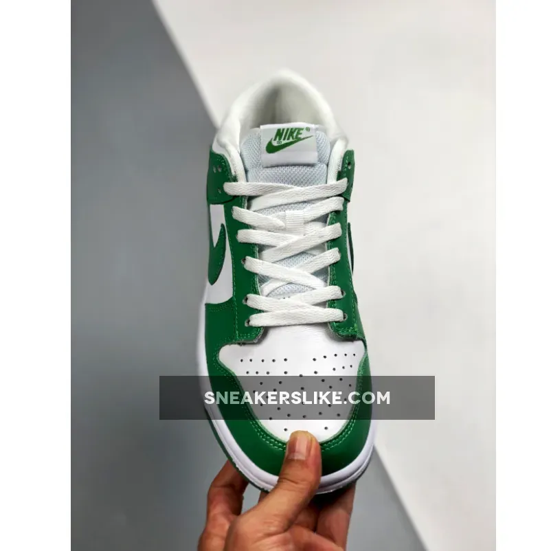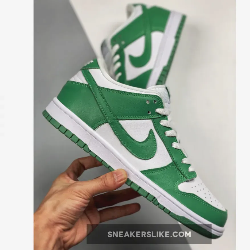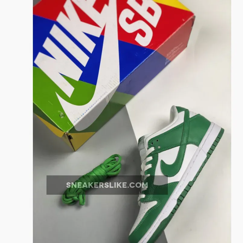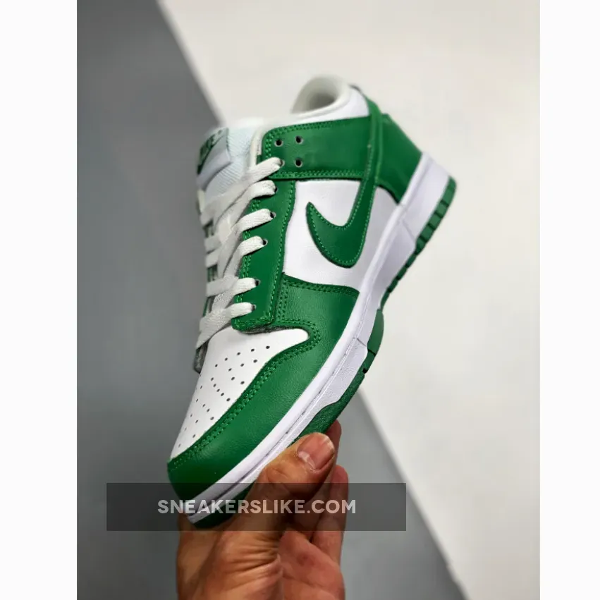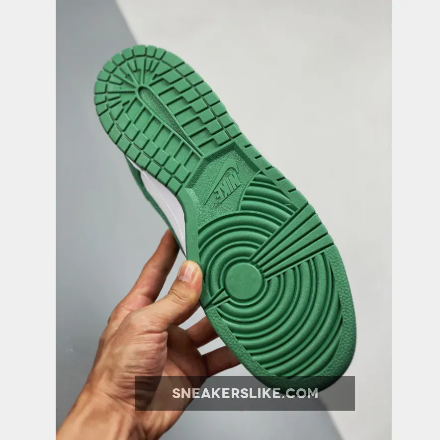 This offering of the Nike Dunk Low features a White leather base with Green Glow overlays, Swoosh logos and rubber outsole.