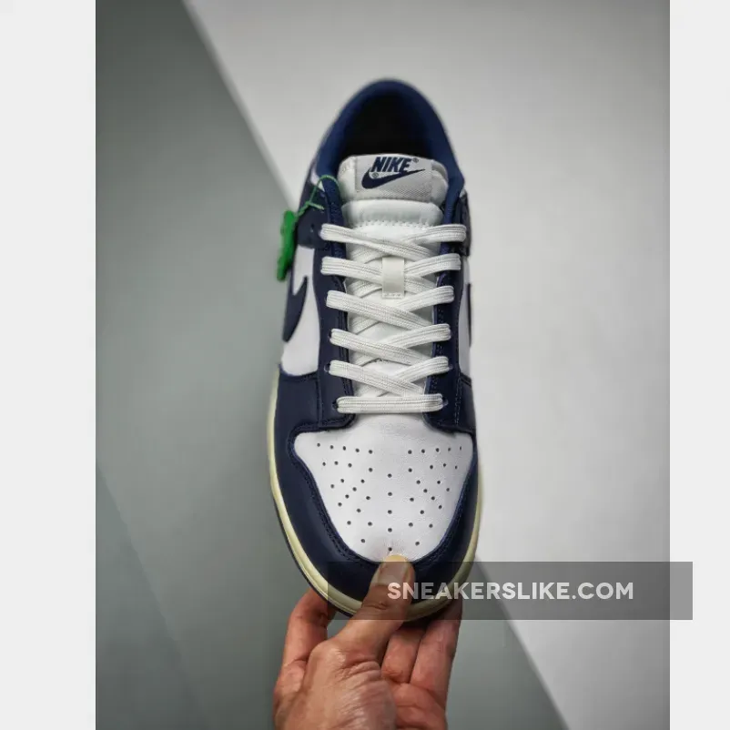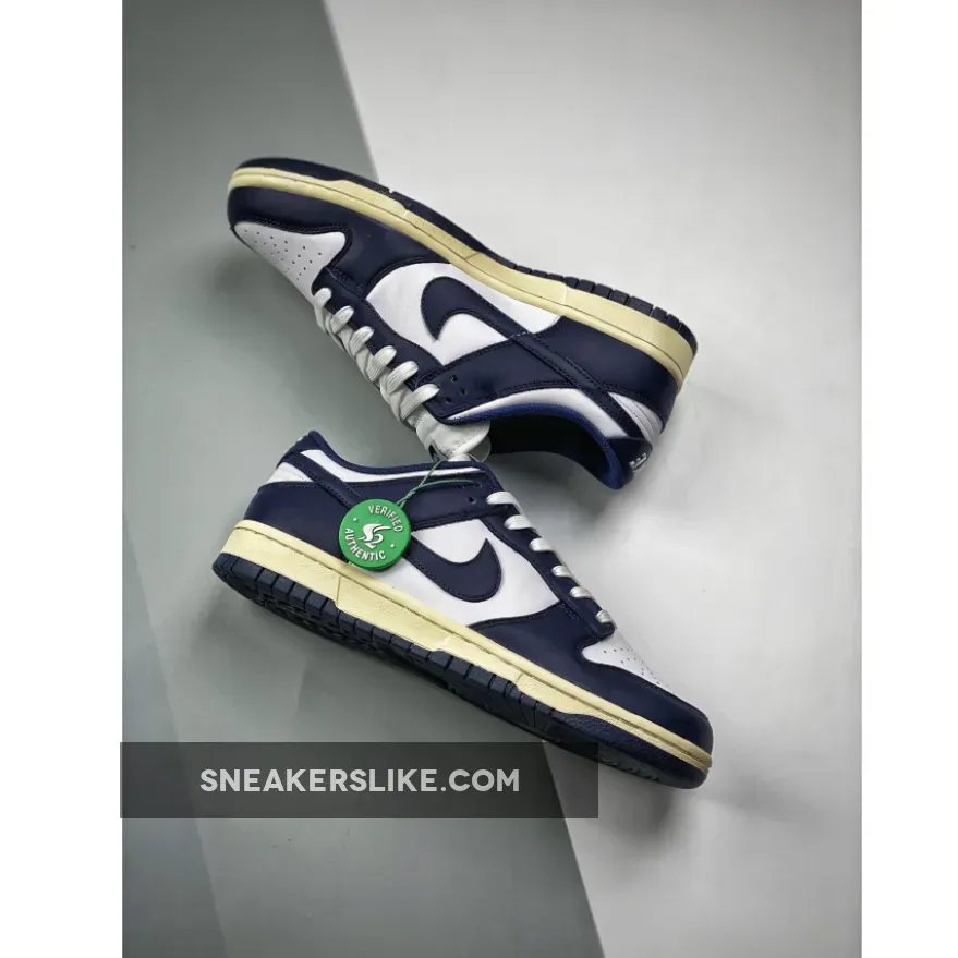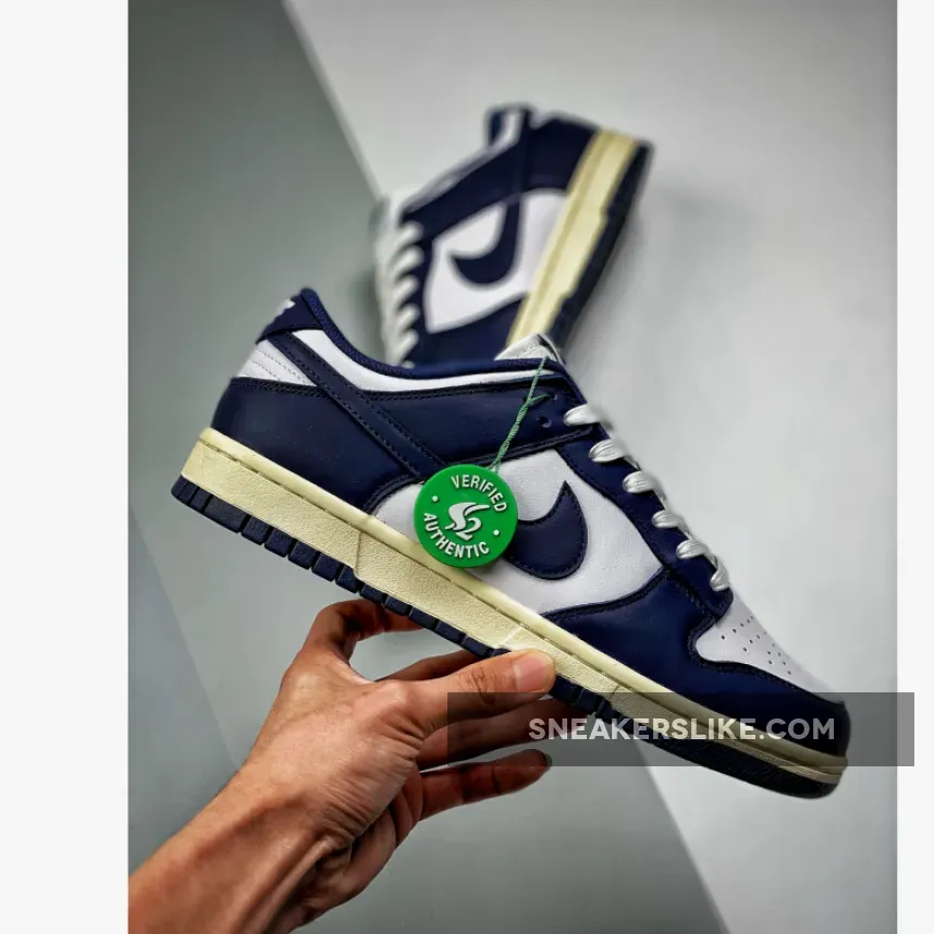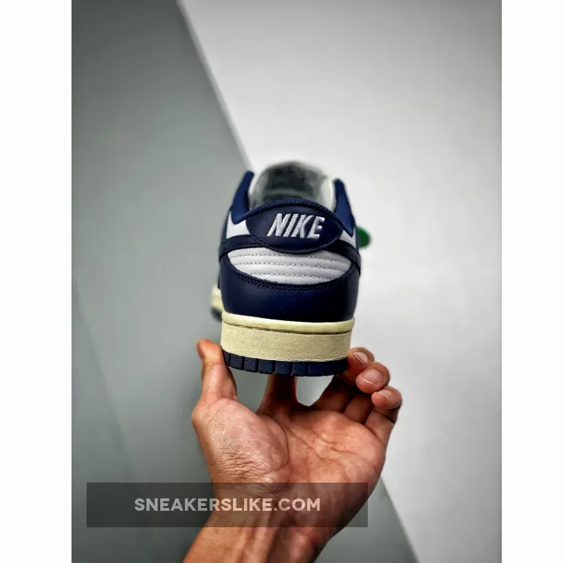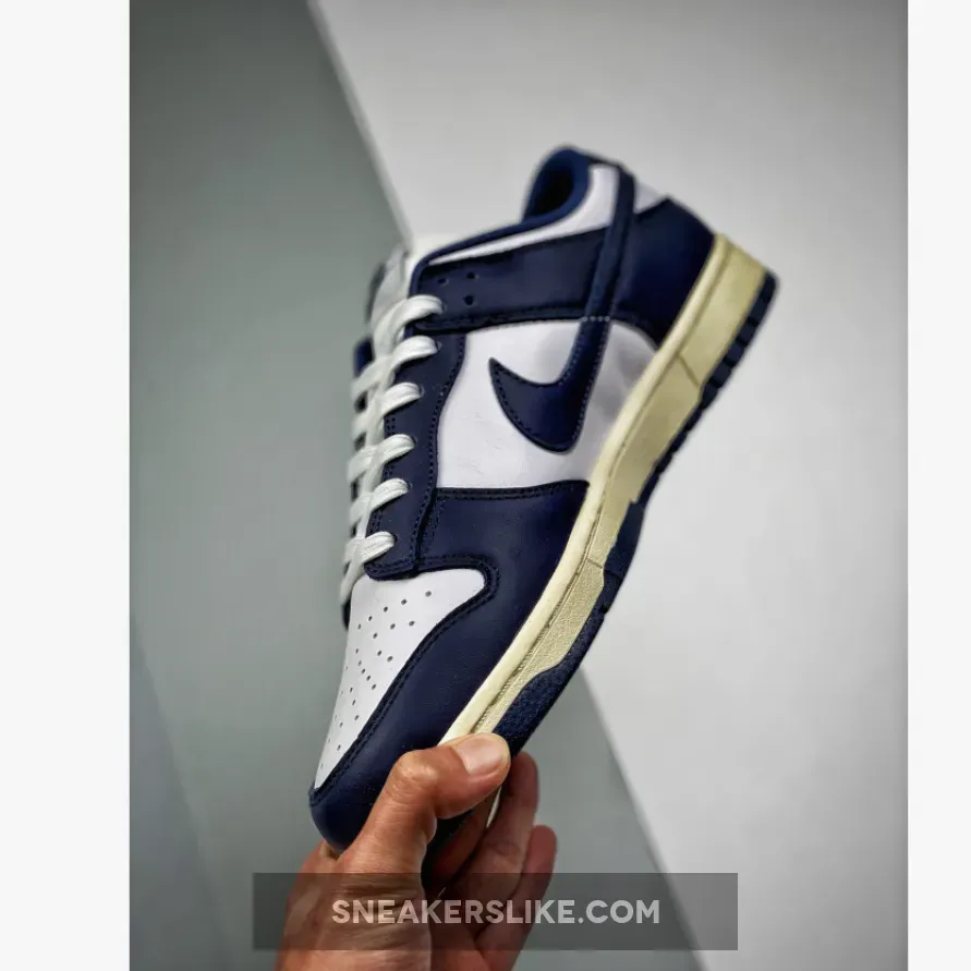 Old is Nike’s new “new.” You’ll definitely notice it on the Nike Dunk Low Navy White. This pair’s vintage-looking soles are not entirely new, though. Nike already did it with the “Be True to Your School” colourways.