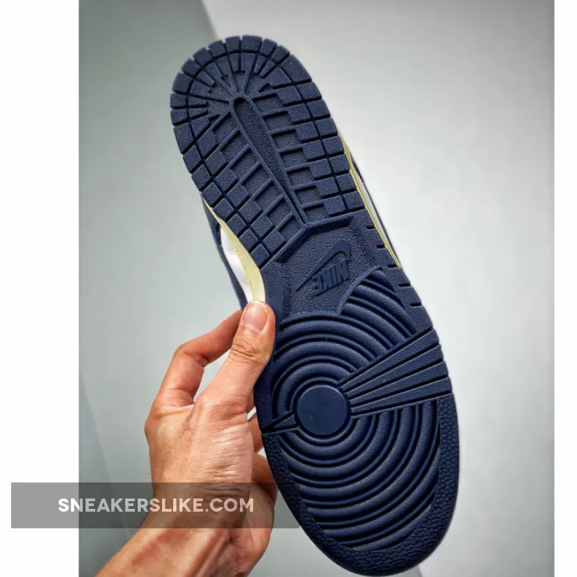 This Nike Dunk Low pair has a crisp white leather upper meant to contrast with the yellowed midsole, matching the tongue, the laces and the heel branding. Navy overlays cover the toe cap, the eye stay, the collar, the heel tab and the lateral Swooshes. Use our official Nike Dunk size guide to know how they fit.