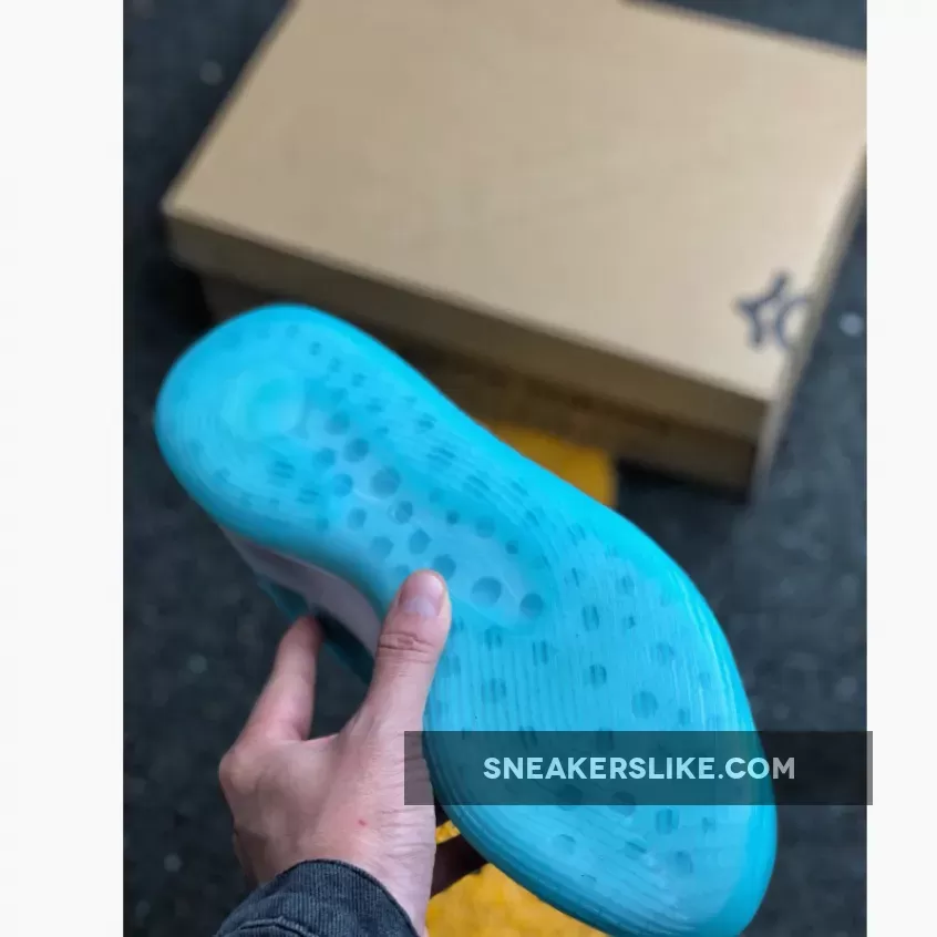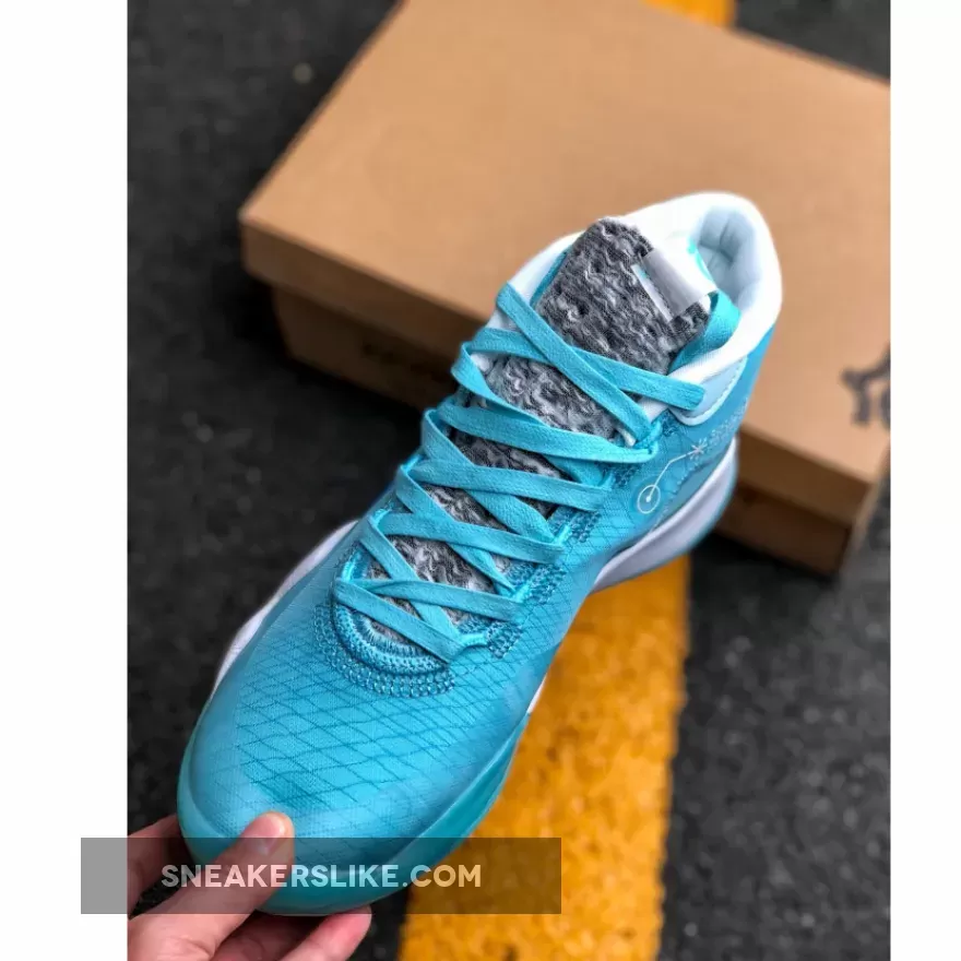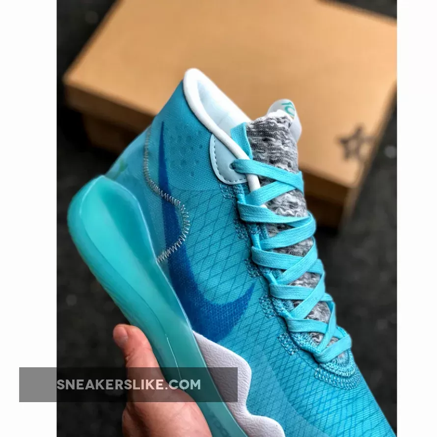 this Nike KD 12 features a Blue Gaze, Photo Blue and Blue Tint color combination. Highlighted with a Teal translucent upper while a darker shade of Blue lands on the base and Swoosh logos on the panels.