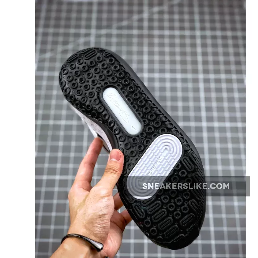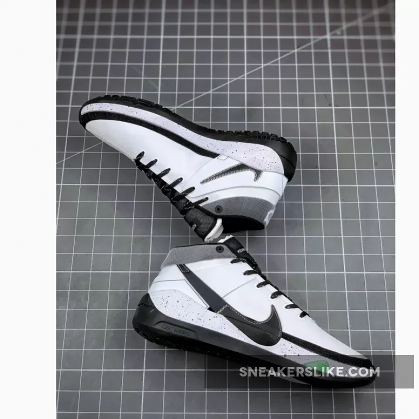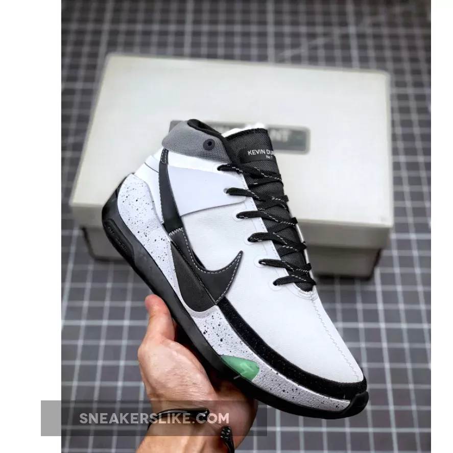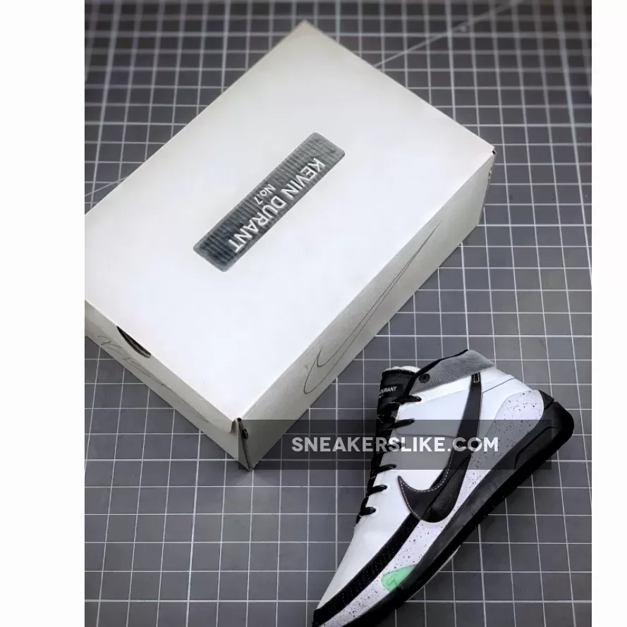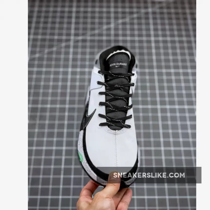 Looking closer this KD 13 comes highlighted with Grey across the upper while Black leather covers the Swoosh logo. In addition we have speckled laces, mesh collars and ‘Kevin Durant No 7’ printed on the tongues.