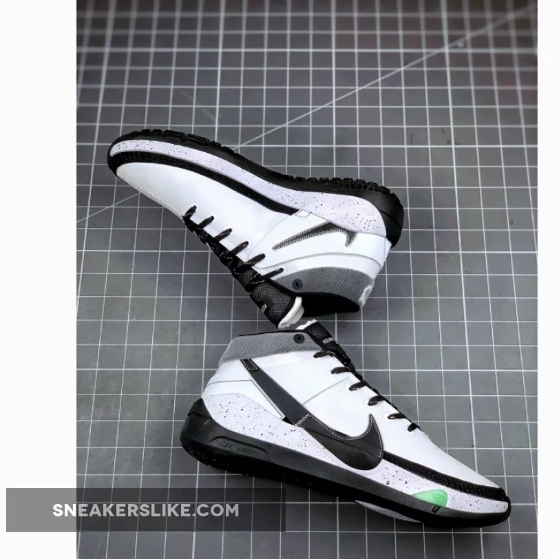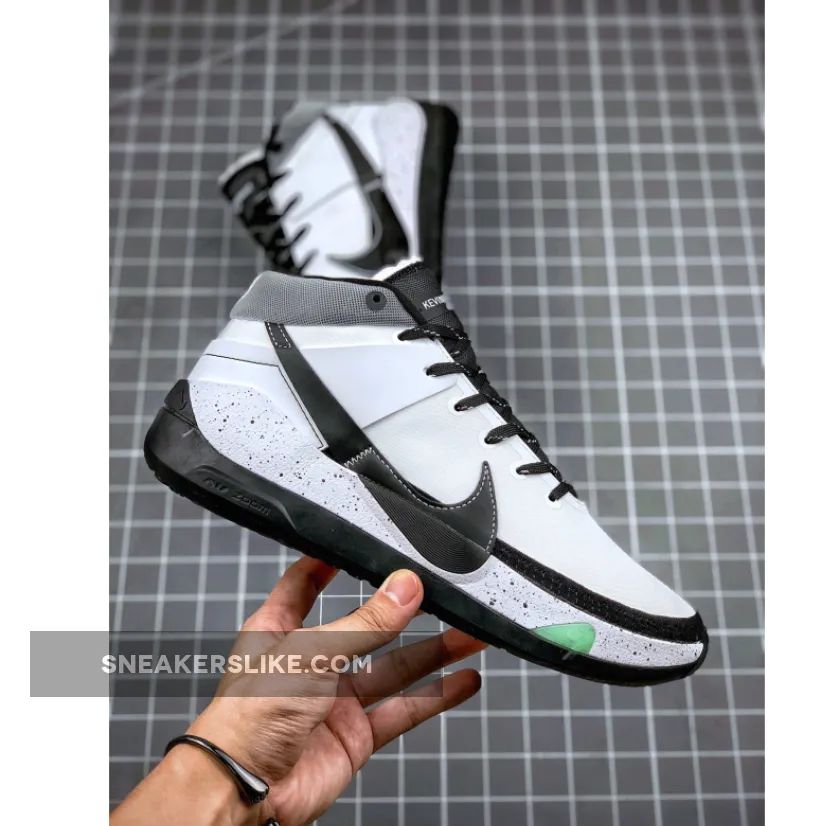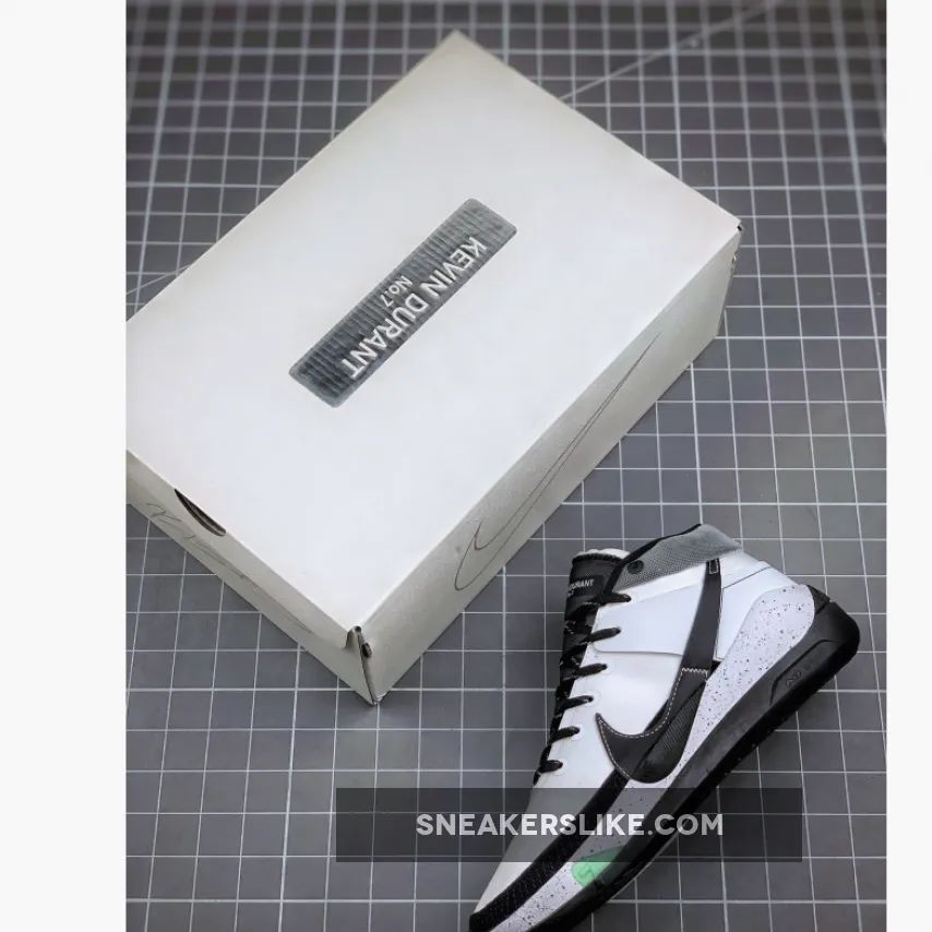 Looking closer this KD 13 comes highlighted with Grey across the upper while Black leather covers the Swoosh logo. In addition we have speckled laces, mesh collars and ‘Kevin Durant No 7’ printed on the tongues.