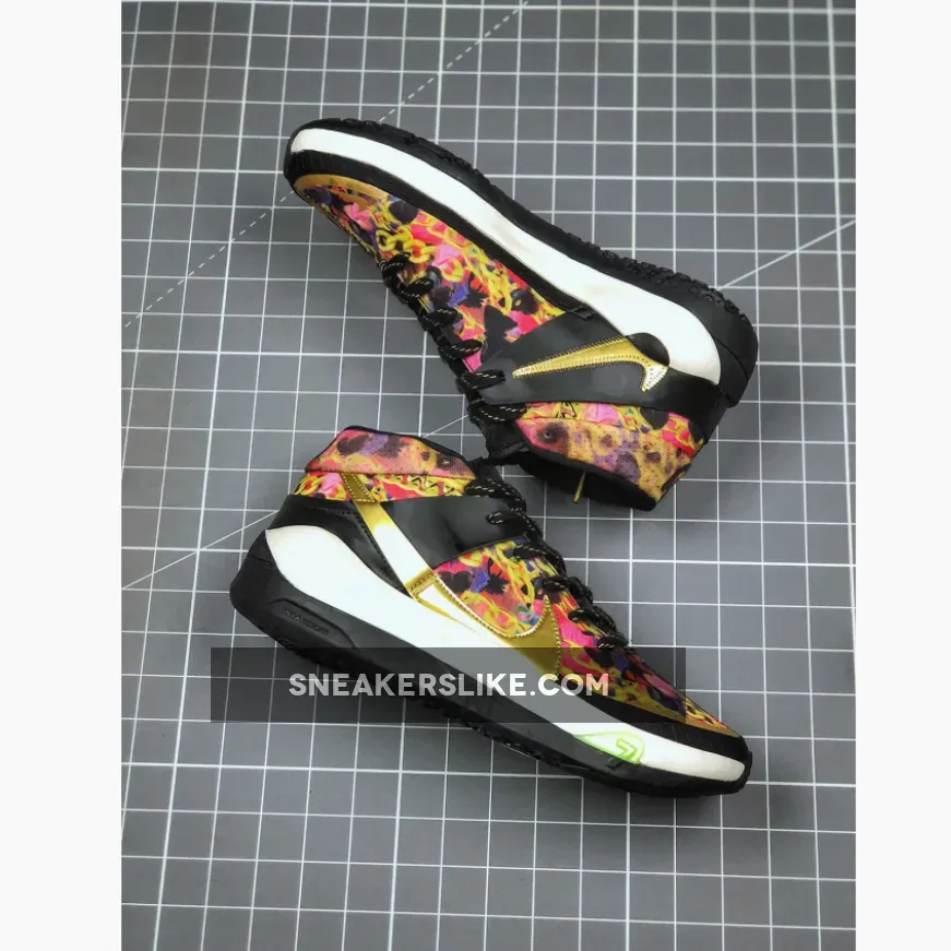 This offering of the Nike KD 13 is inspired by the pump-up playlist that activates Kevin Durant’s clutch mindset. The shoe gives a nod to hip-hop culture and fashion with gold chain and flower graphics on the upper.