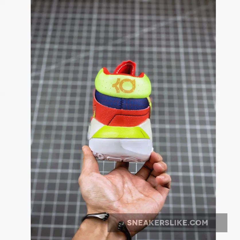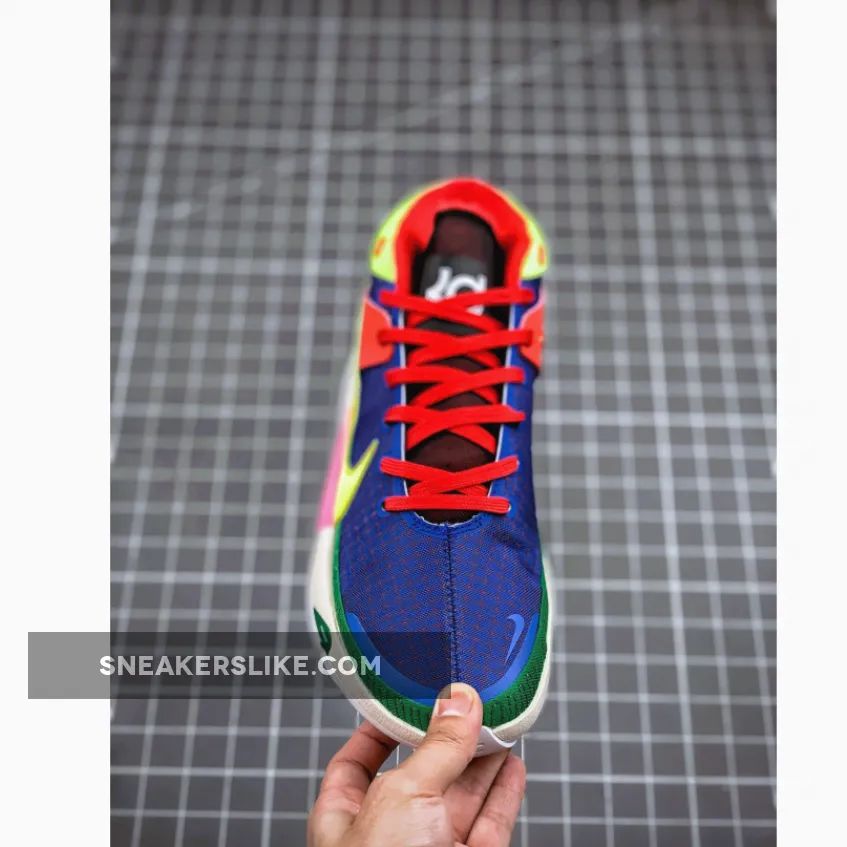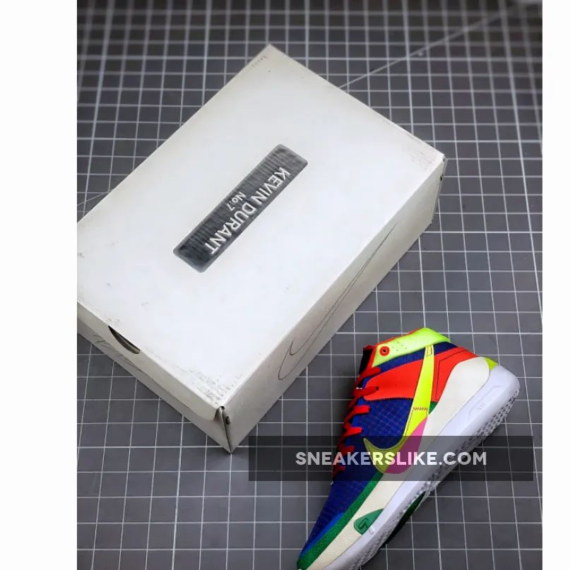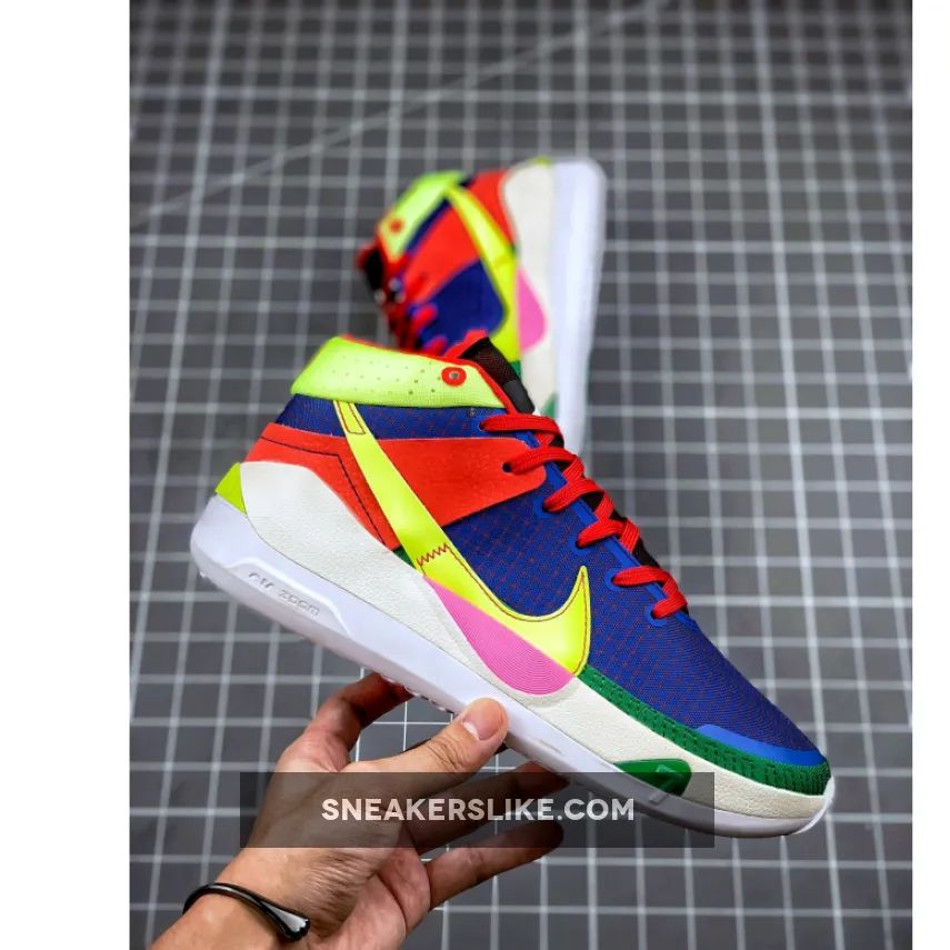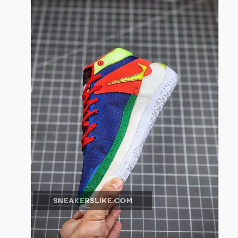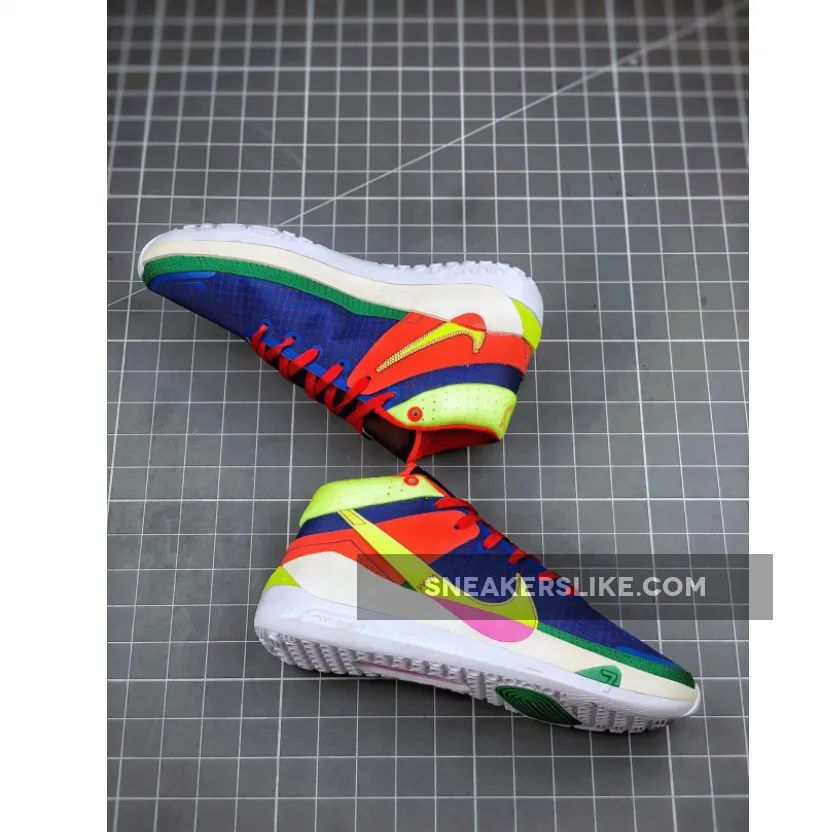 This offering of the Nike KD 13 comes dressed in a playful color blocking featuring a Blue upper with Red grid patterns, Green trim along the forefoot, highlighted with Red and Volt detailing throughout. NY vs NY is printed on the insoles completed with a White rubber sole.