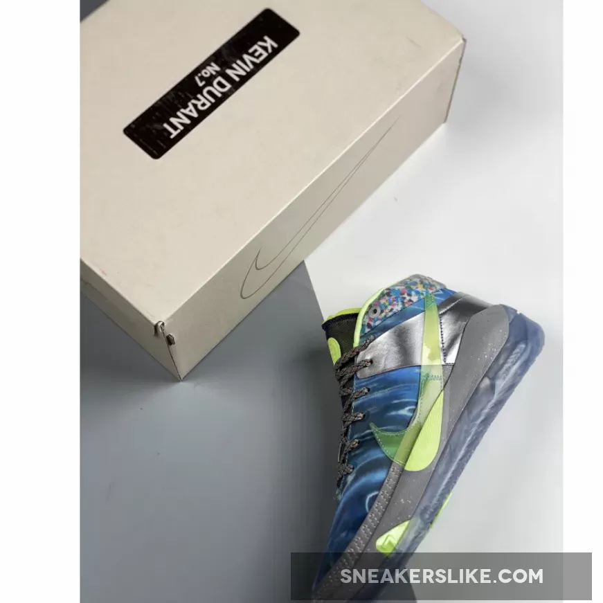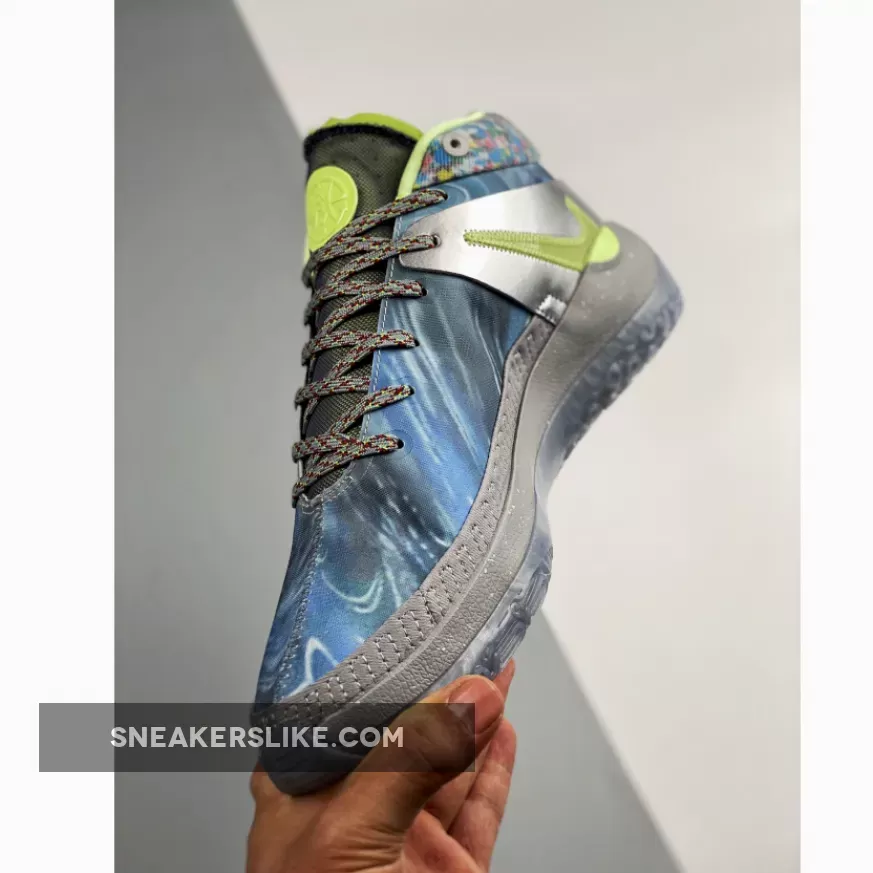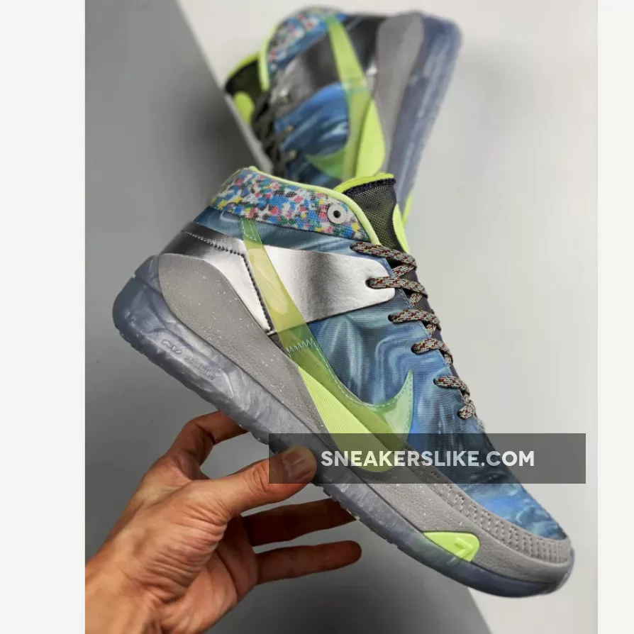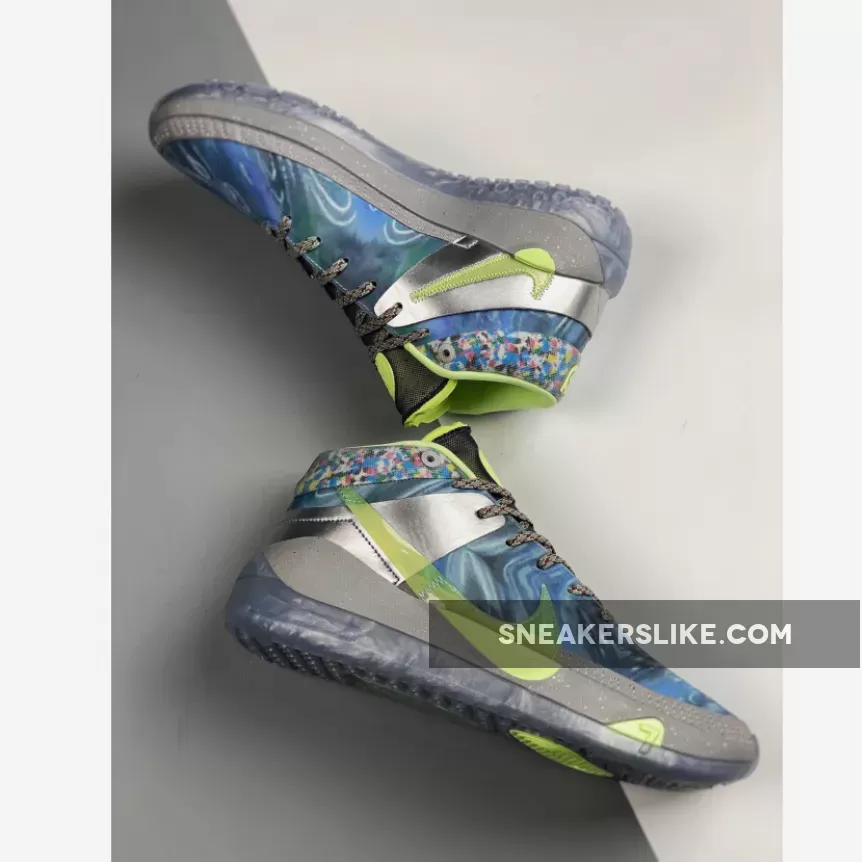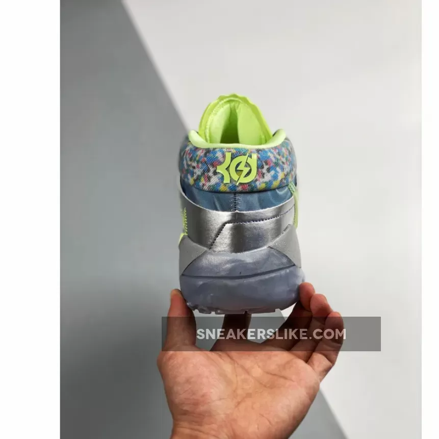 Dressed in a Platinum Tint and Barely Volt color scheme. This Nike KD 13 features a Platinum-colored upper detailed with Multicolor patterns and graphics.