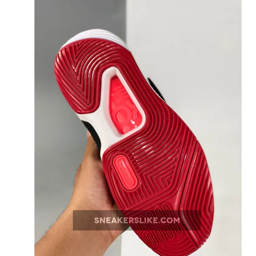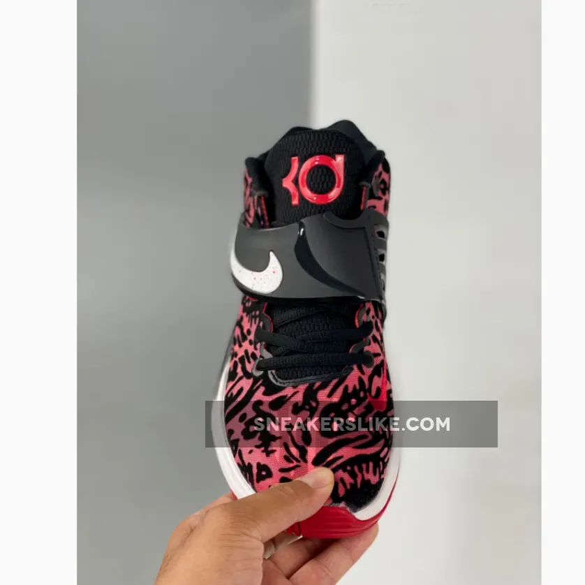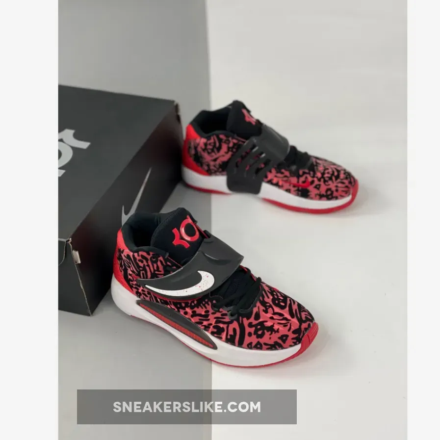 This offering of the Nike KD 14 comes constructed in mix materials featuring a textile Black and Red base with a White speckled Swoosh on its midfoot strap.