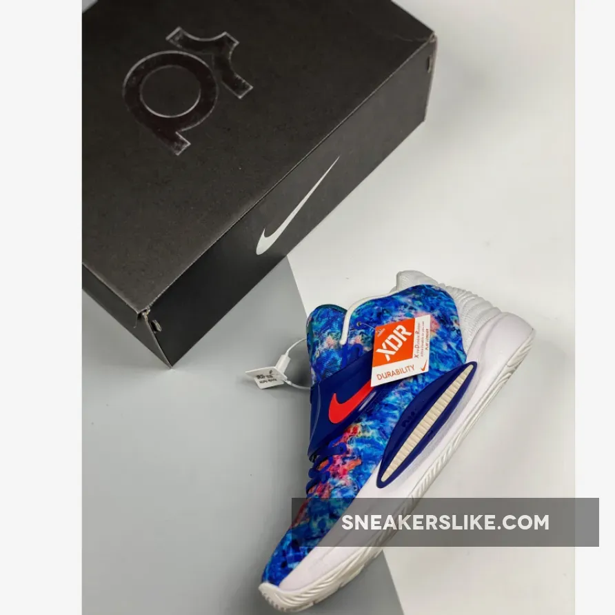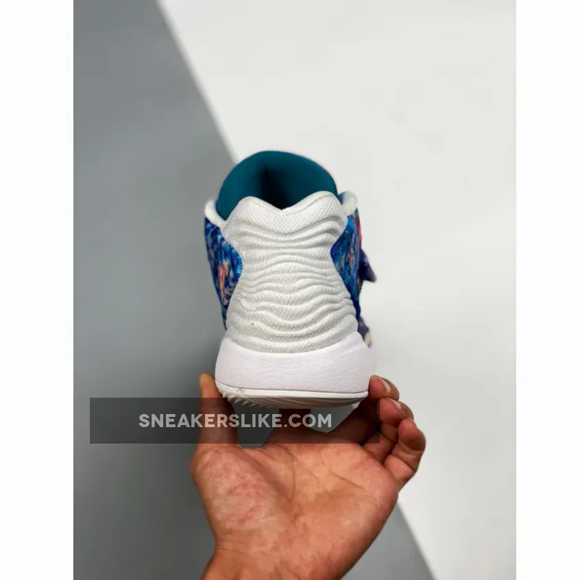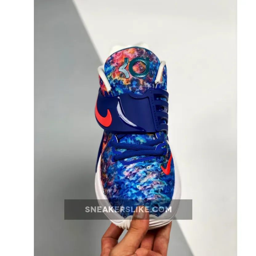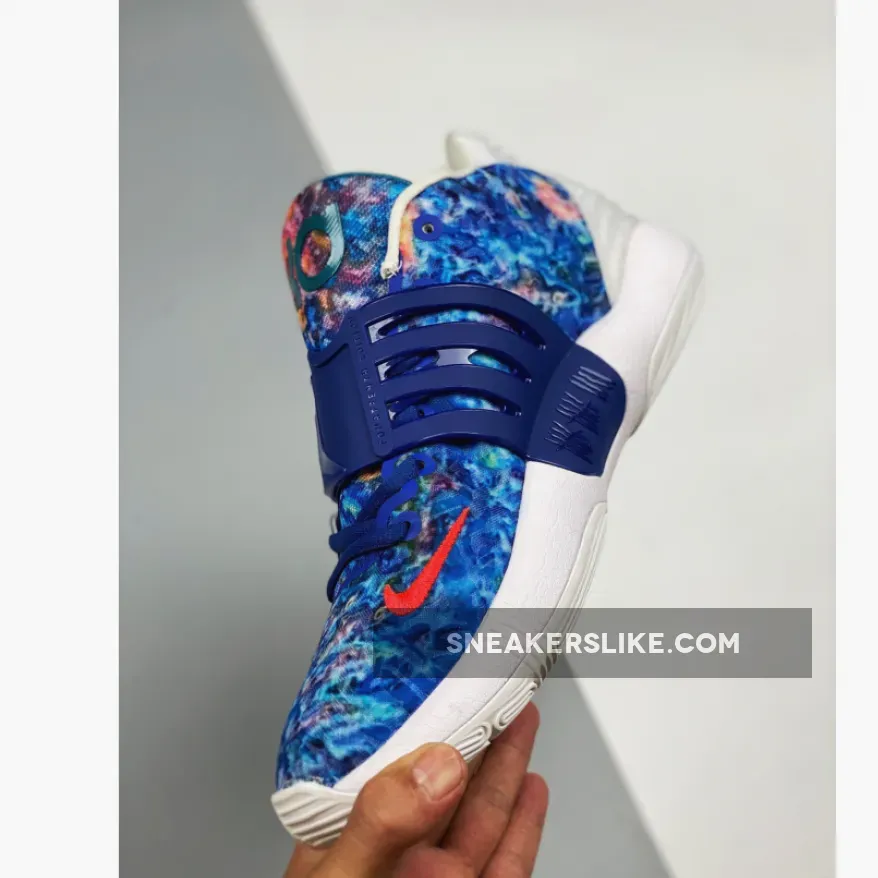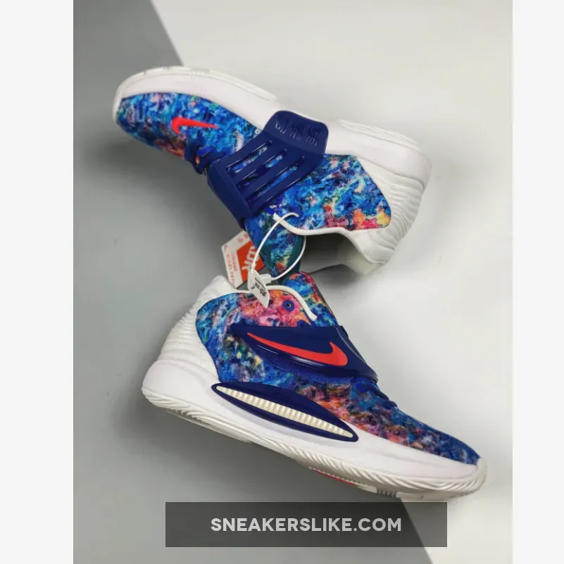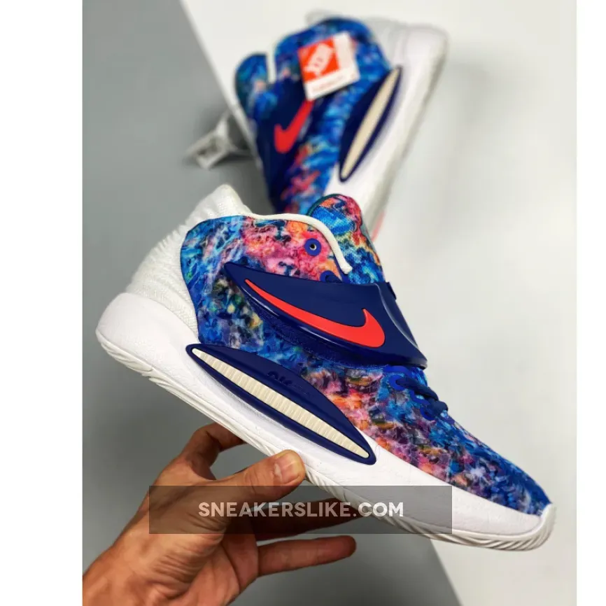Dressed in a Deep Royal Blue, Pale Coral, and Coconut Milk color scheme. This Nike KD 14 is highlighted with a psychedelic graphic print covering majority of its upper and tongue. Other details includes a Royal Blue cross strap at the midfoot with a Crimson Swoosh to match the embroidered Swoosh on the medial forefoot.