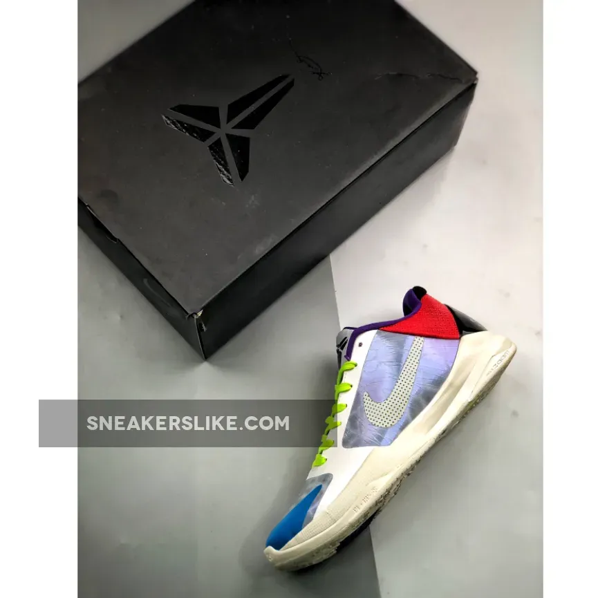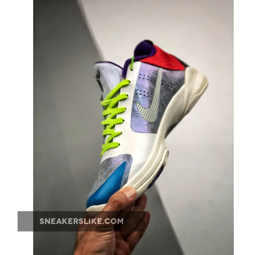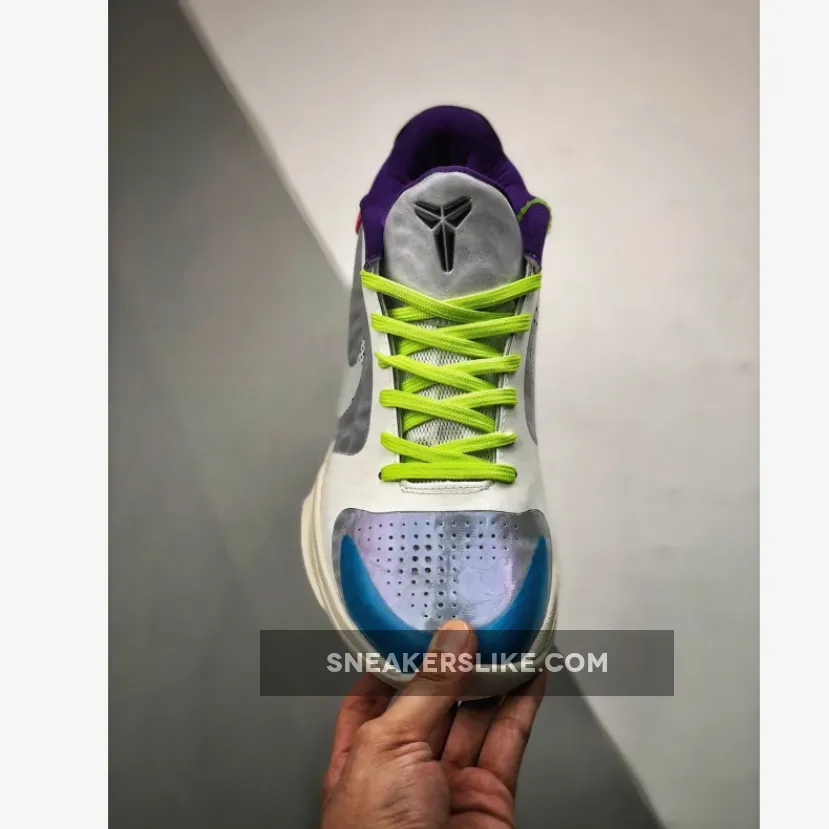 Dressed in a Particle Grey, Light Cream, Sail, and White color scheme. This Nike Kobe 5 Protro features a White and Grey base with Blue on the toes, dotted Swooshes, Red in the rear, Purple lining and Volt laces.