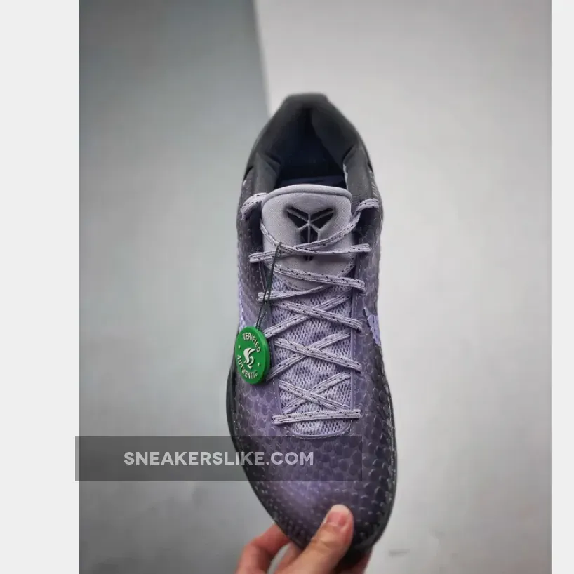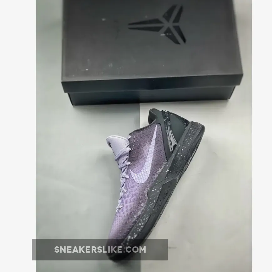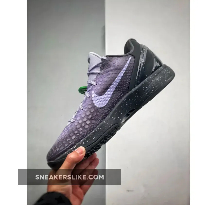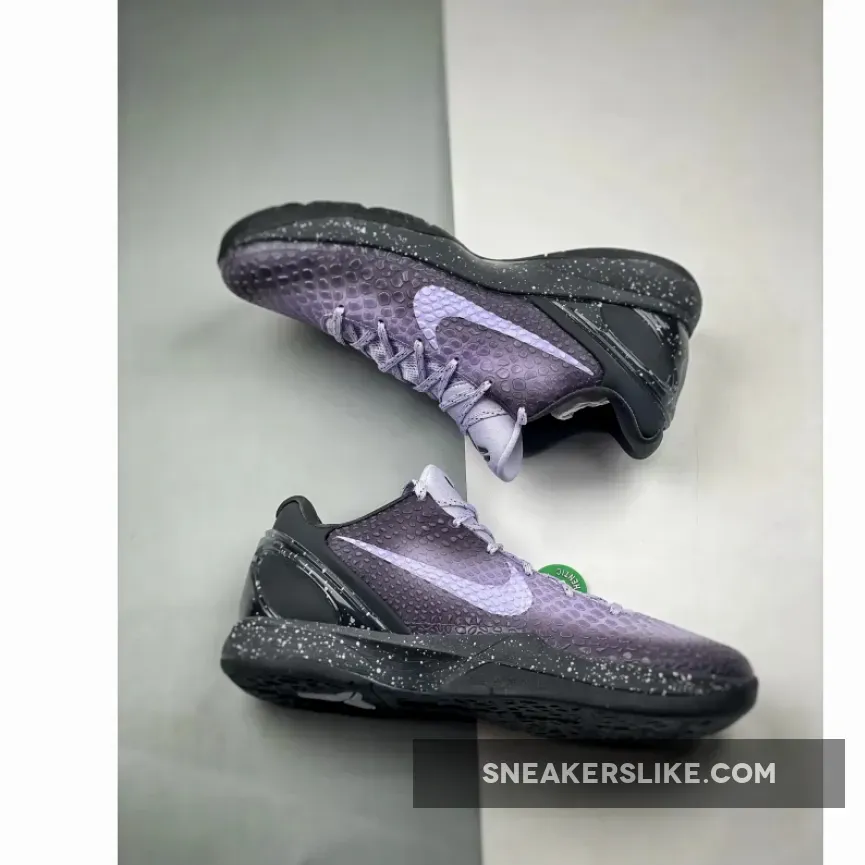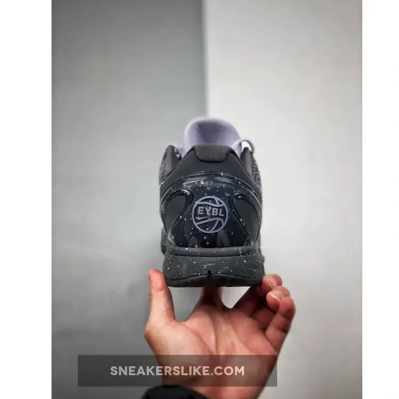 the colorway picks up where the series left off, opting this time for shades of deep purple and black. The latter dyes the entirety of the heel clip and midsole, speckled with splatters of grey all throughout. Above, the Swoosh opts for a white neutral, its scales lightly tinted with the purple that air brushes behind in varying levels of intensity. Kobe’s logo, then, outfits the tongue, placed opposite to the EYBL insignia that dresses the heel in what looks to be reflective paint.