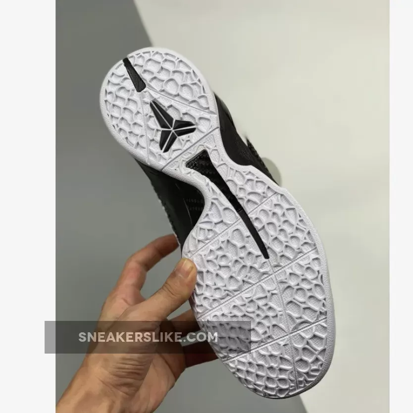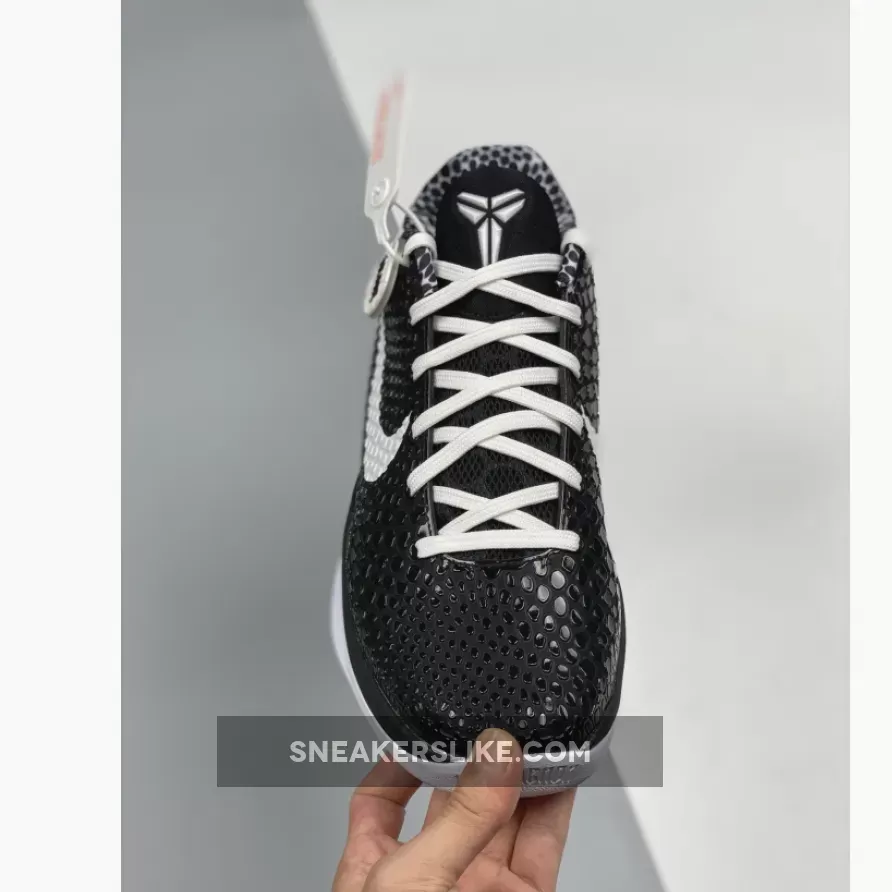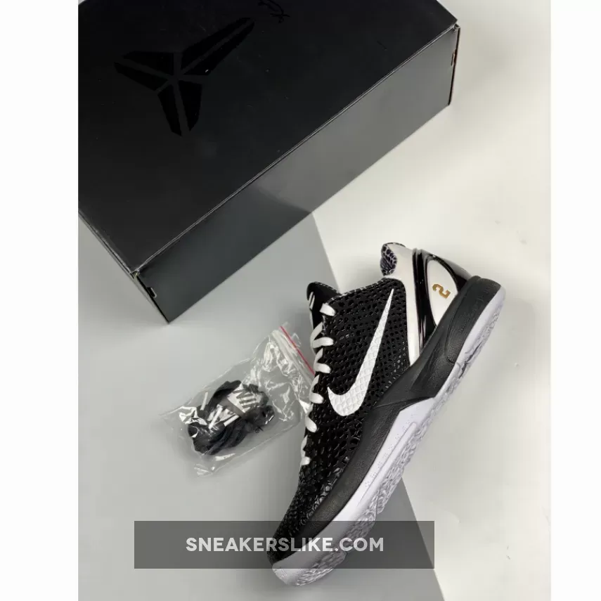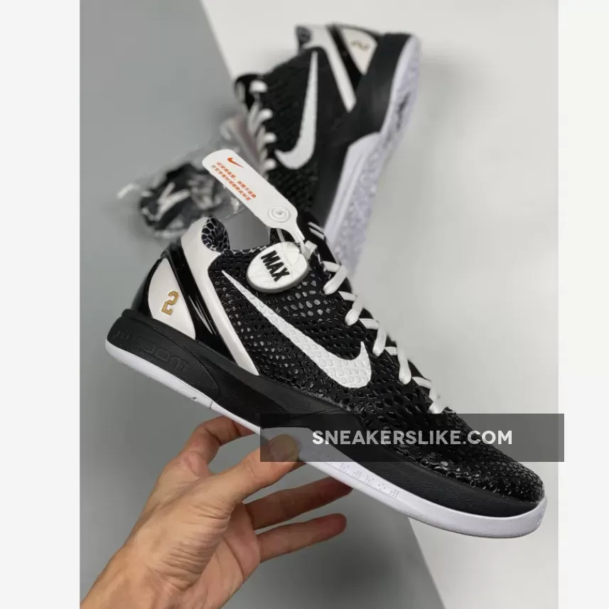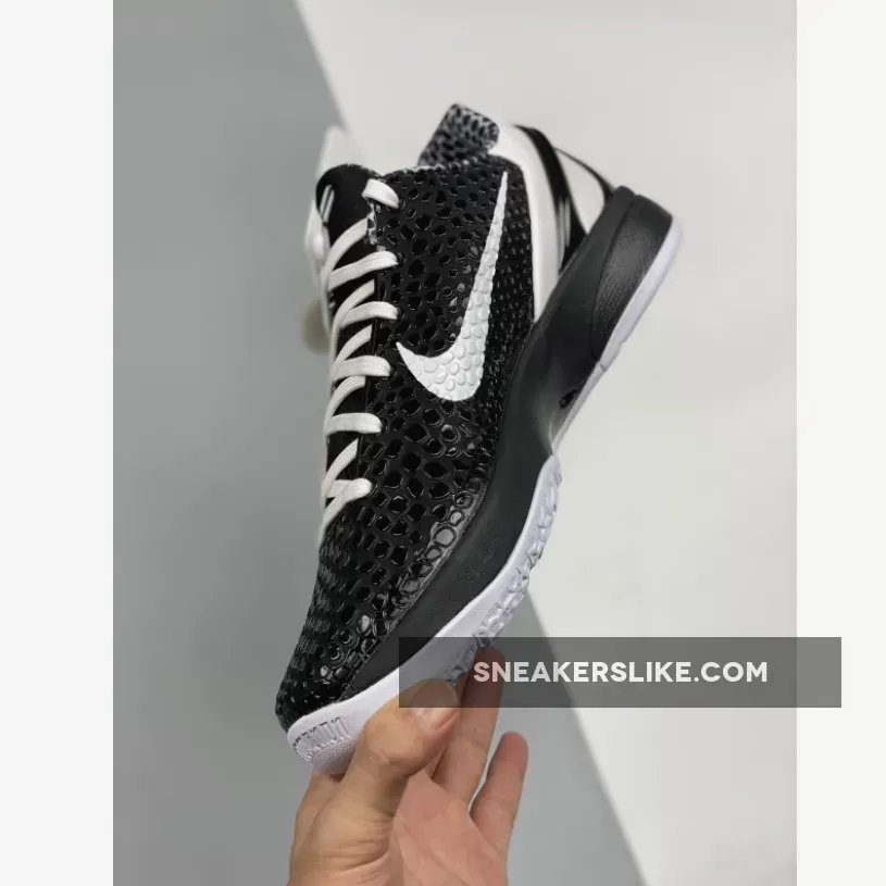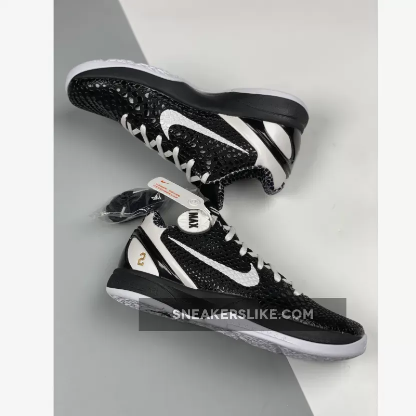 This offering of the Nike Kobe 6 Protro features a Black snakeskin textured upper with White laces, Swooshes, tongue branding, heels, and rubber outsole. The snakeskin print is also used on the inner lining.