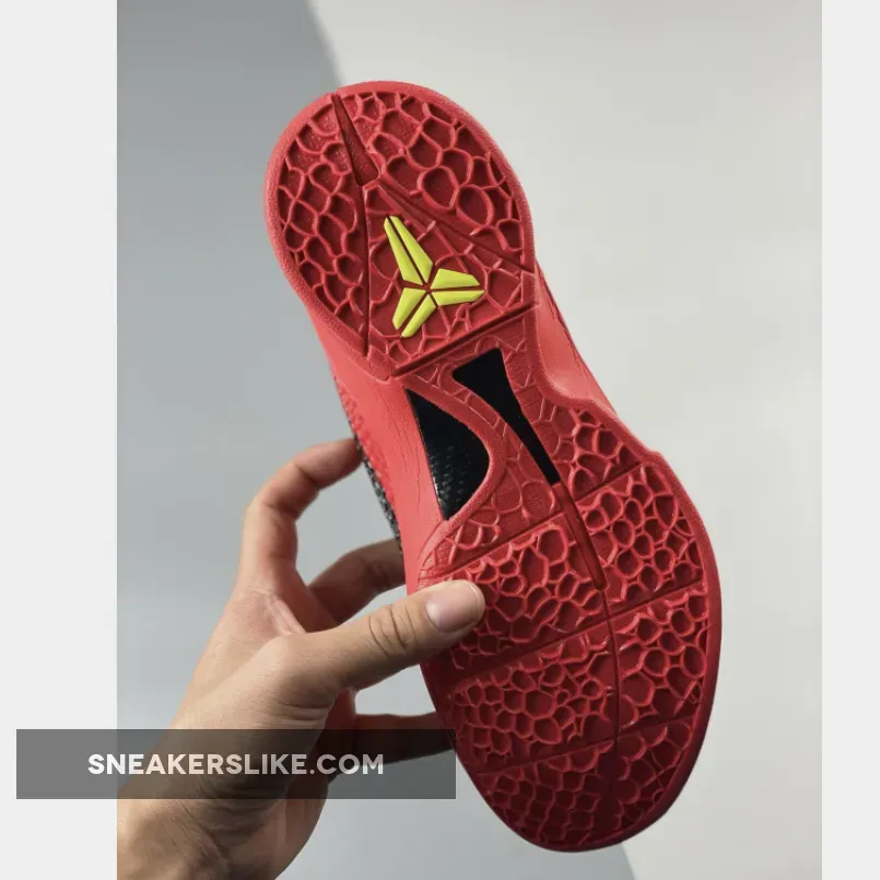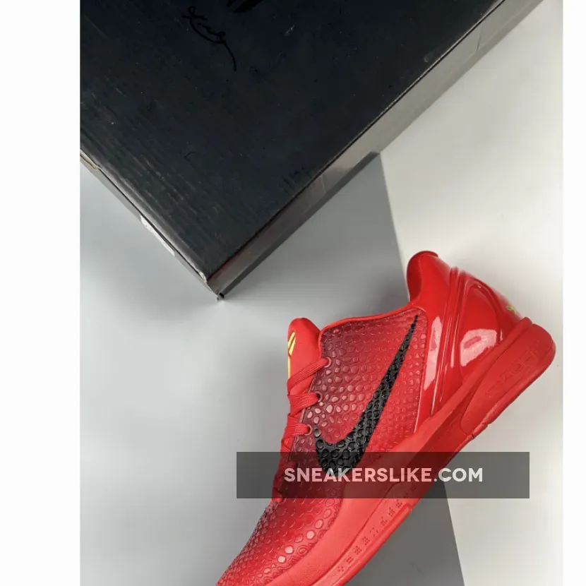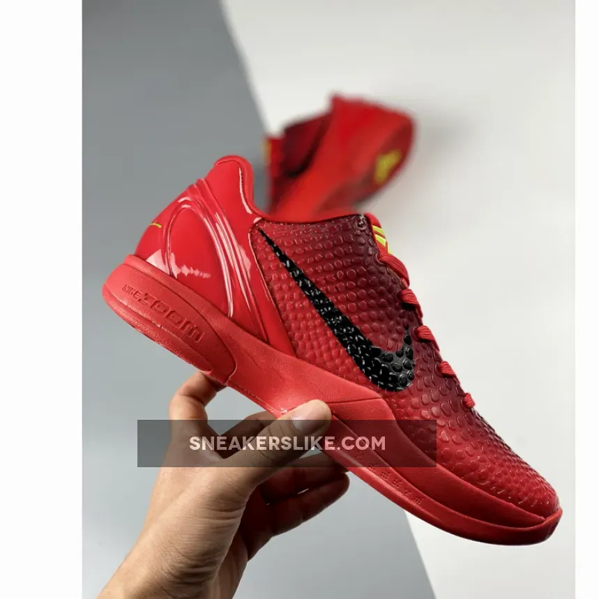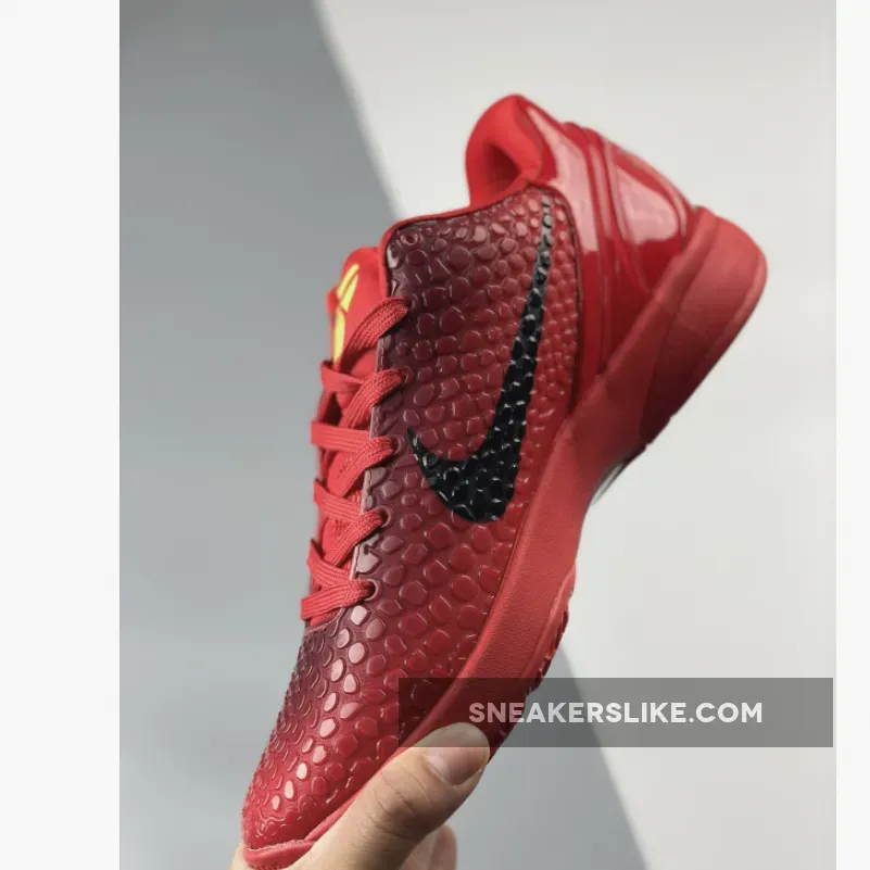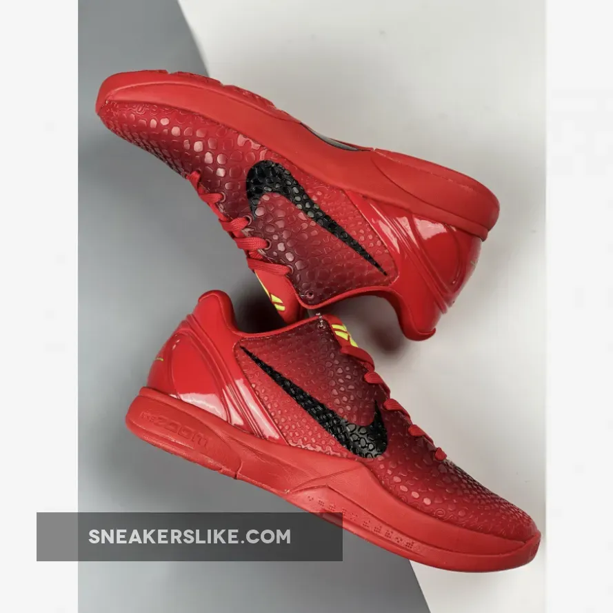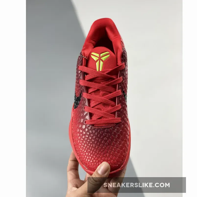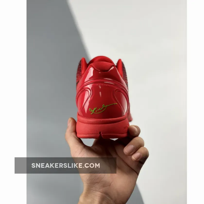 The Nike Kobe 6 Protro “Reverse Grinch” features a Bright Crimson hue all over the snakeskin textured upper which is joined by Black Swooshes and Electric Green accents on the laces and the Kobe branding on the tongues and heels. The laces stand out in “Electric Green,” inspired by the Grinch’s shaggy fur.”