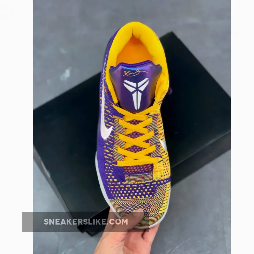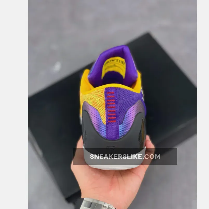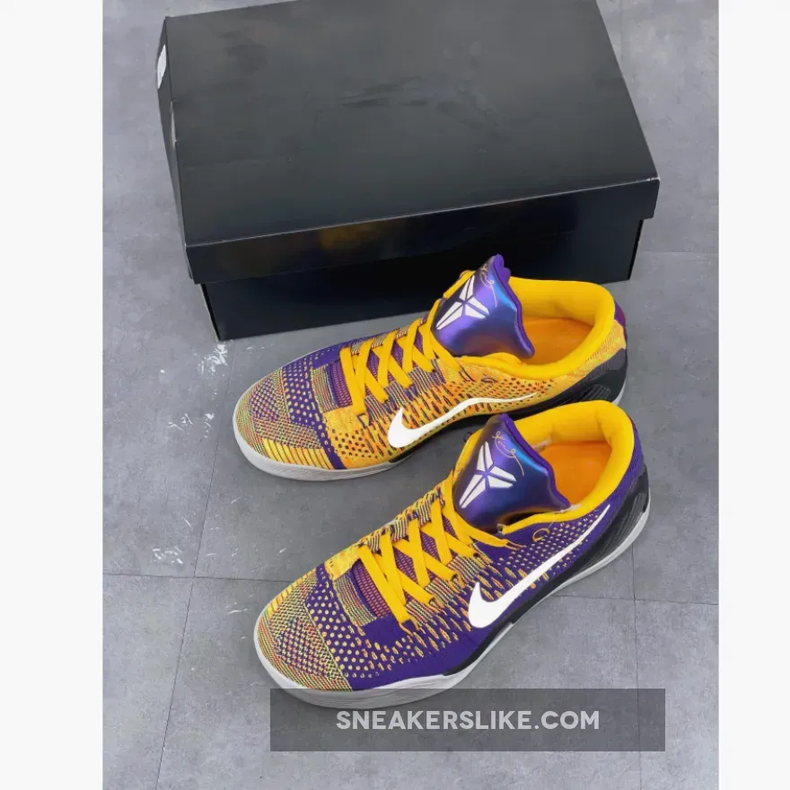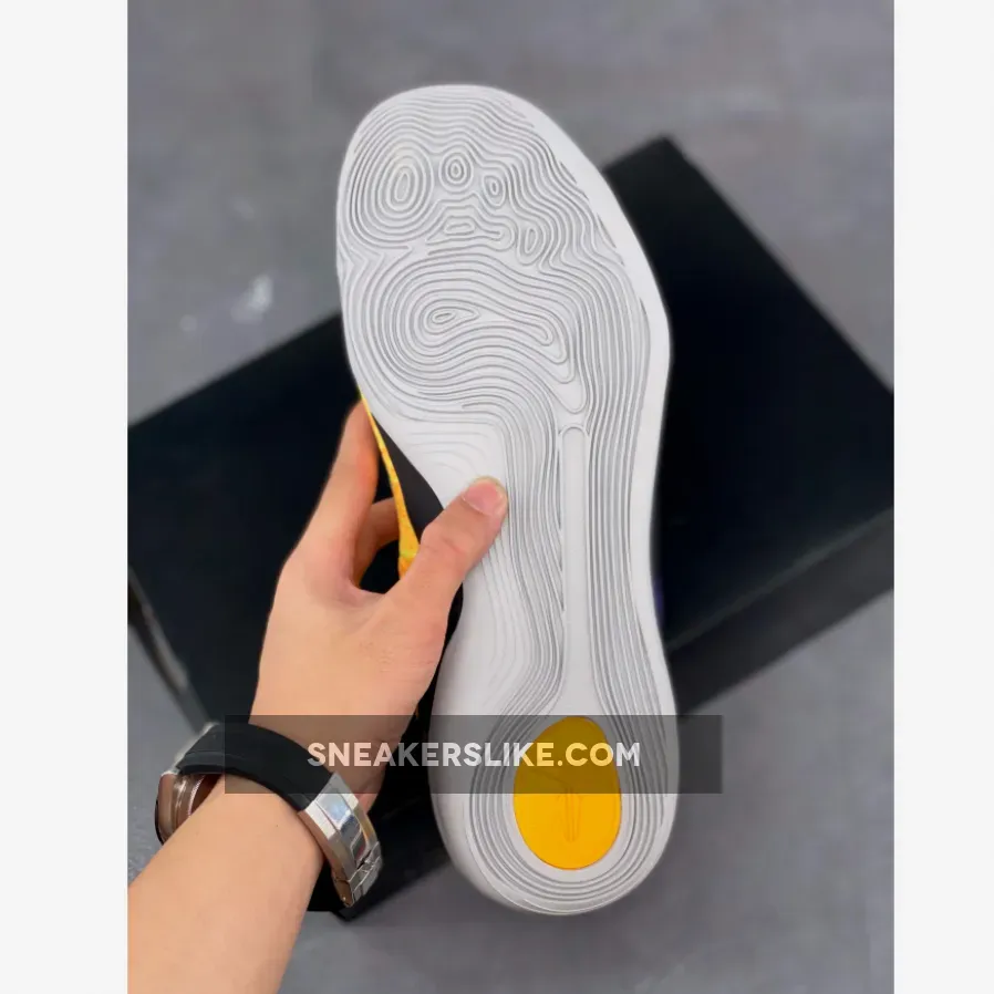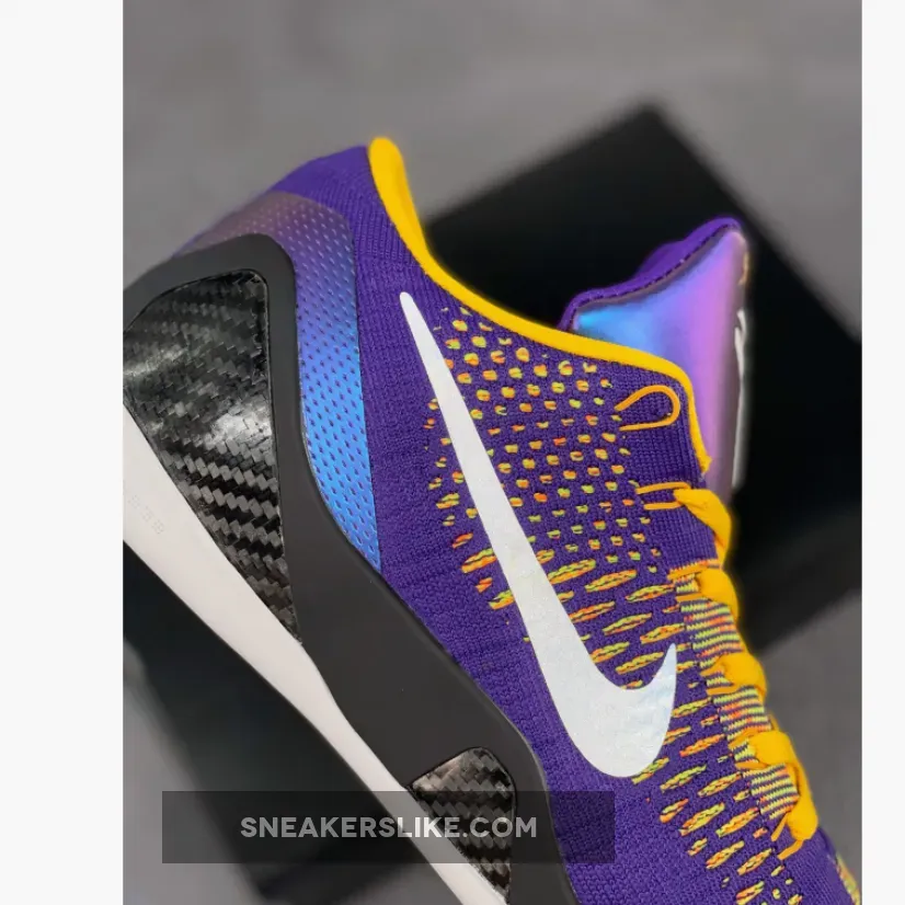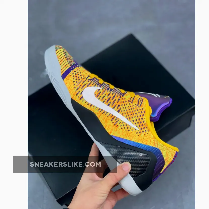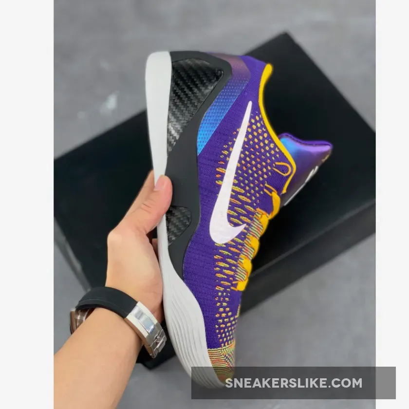 The Nike Kobe 9 Elite Low Purple Yellow Black looks ?. Flyknit upper + Lunarlon midsole = comfy & responsive. Carbon fiber shank for stability. Durable rubber outsole for traction. Perfect for ballin’. #NikeKobe9 #BasketballShoe