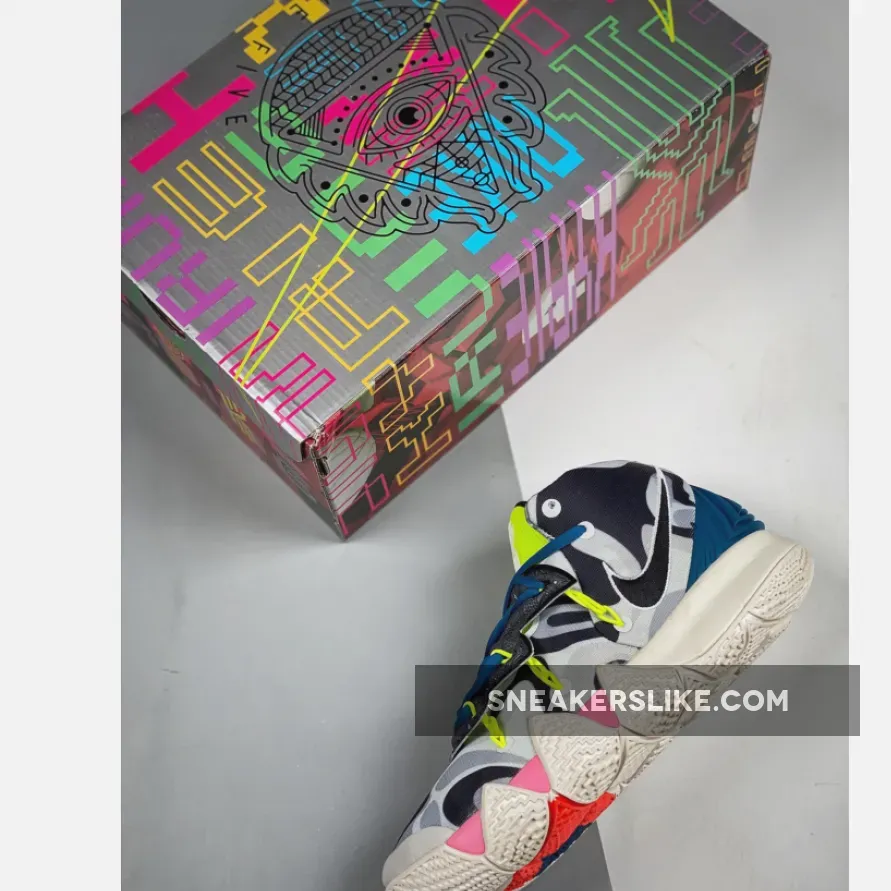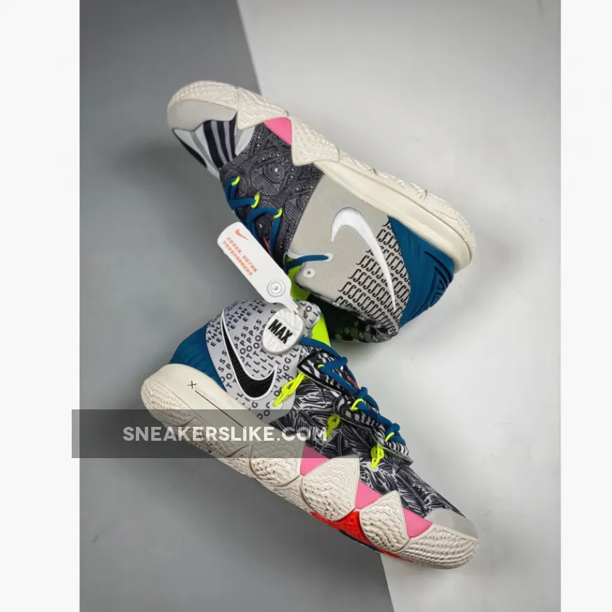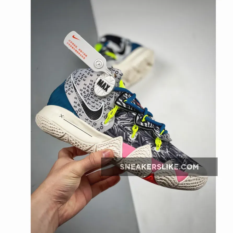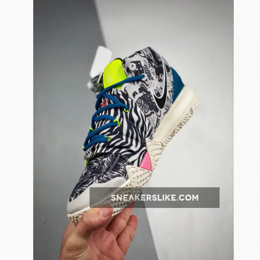 The shoe combines design elements from previous Kyrie models like the 4, 5, and 6. This edition sports a Black, White, and Grey base covered in multiple patterns highlighted with Neon contrasting accents.