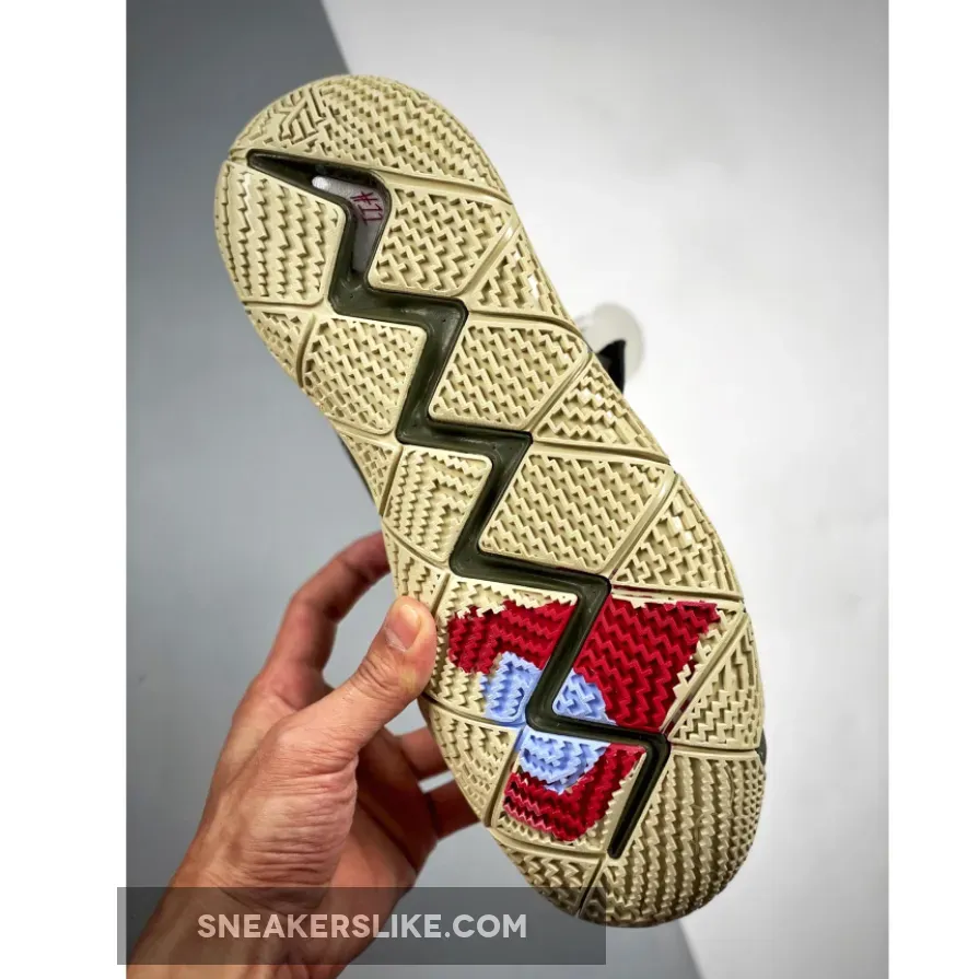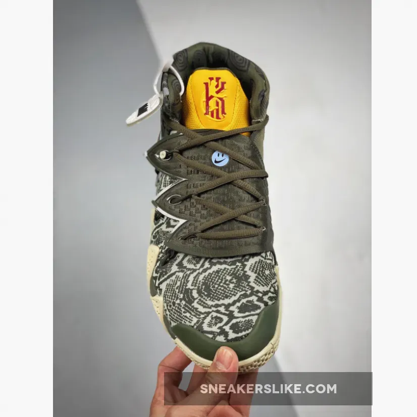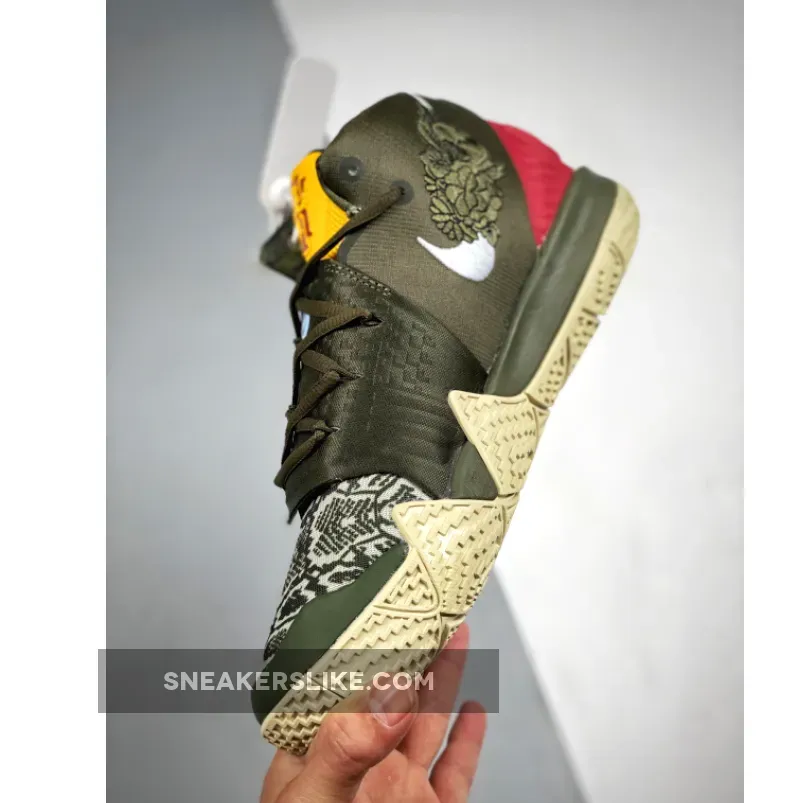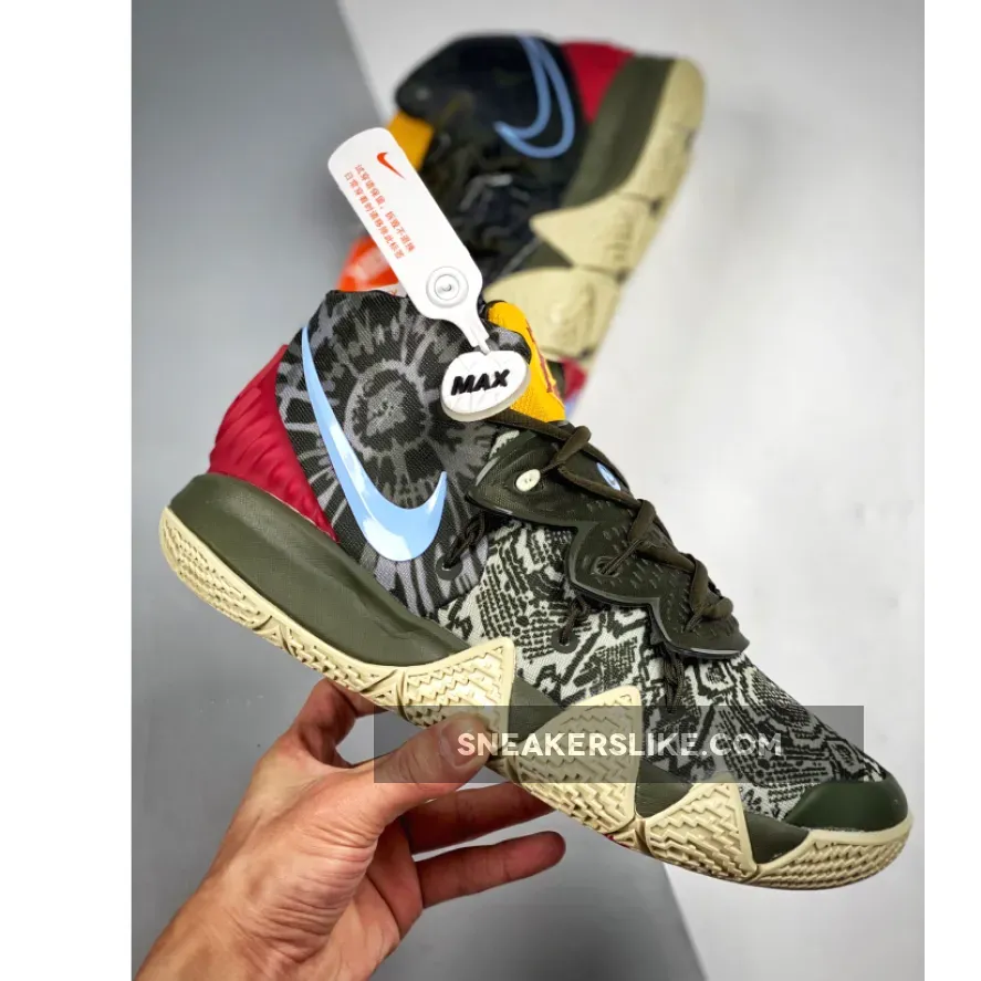 This pair comes comes with a Dark Green across the upper along with Black mesh and a unique design across the toe. In addition we have Light Blue which outlines the Swoosh, Red on the heel and a Light Olive on the rubber outsole. On the tongue we have a space ship, medial side is floral covering the Swoosh while the Kyrie branding on the tongue appears to have an animal intertwined.