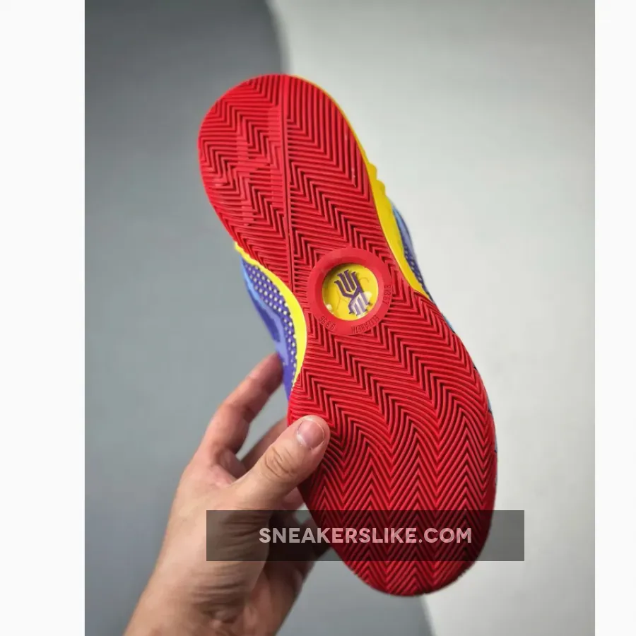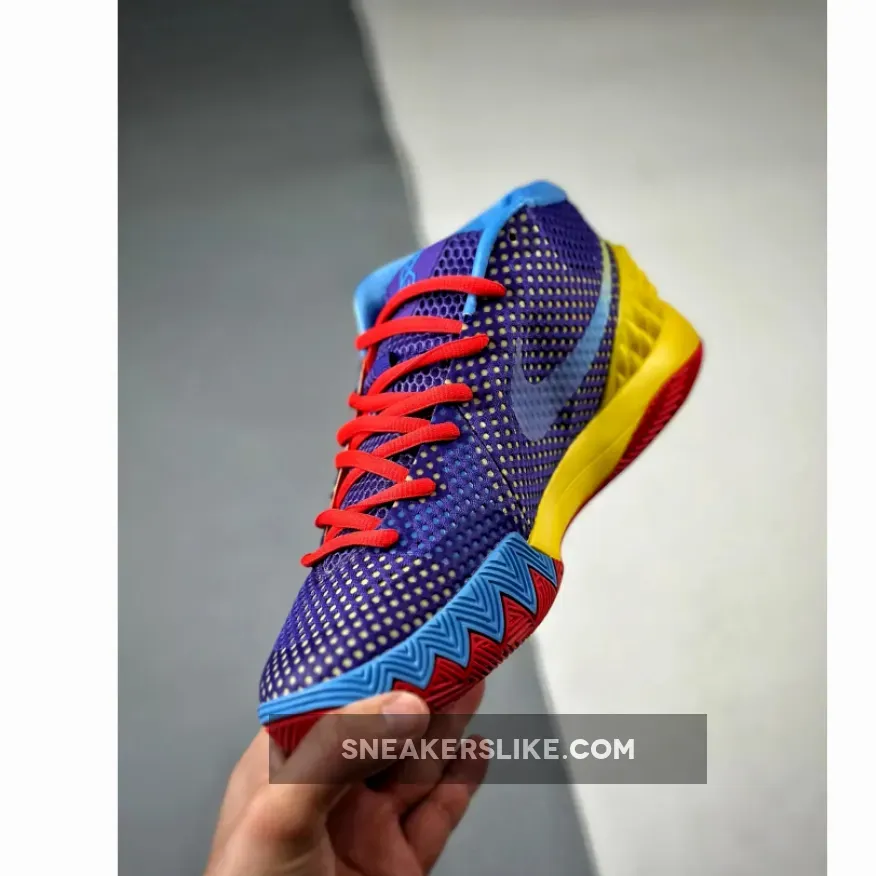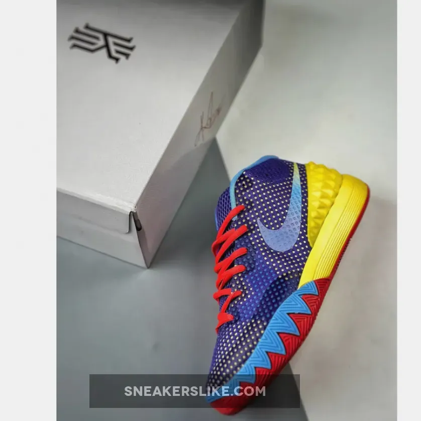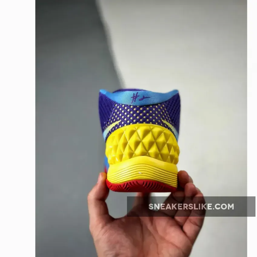 This Kyrie’s first signature shoe features a Hyper Grape mesh upper with Lemon Frost, University Blue, and bright red accents throughout for a bold and colorful look to ensure youthful appeal. The shoe sports a full Grape-based upper with Lemon Frost tackling the back heel, while Blue hints are seen on the inner liner, Nike Swoosh and midsole.