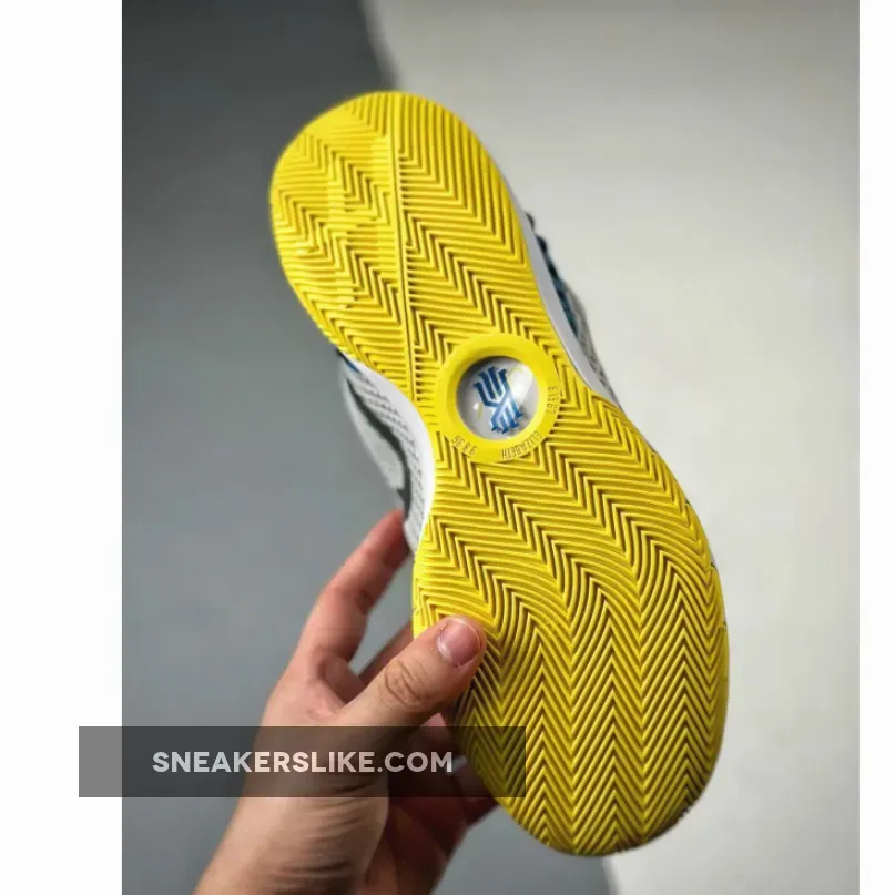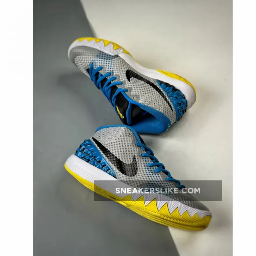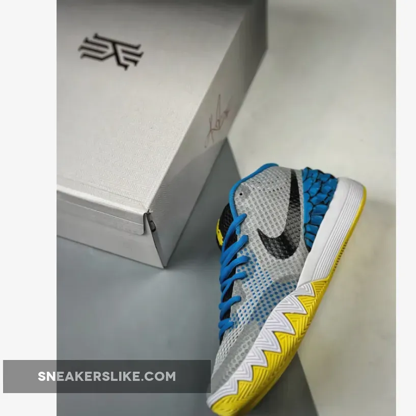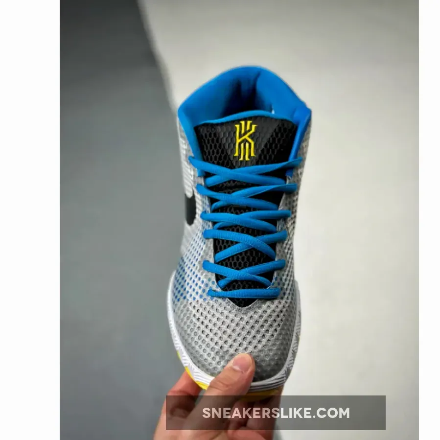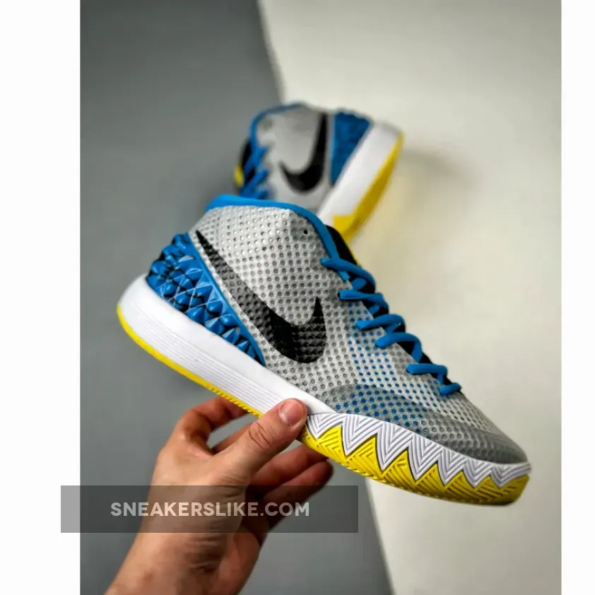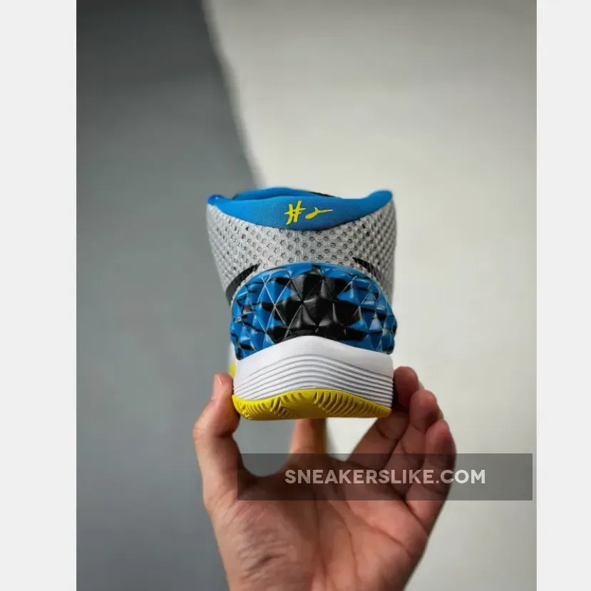the Nike Kyrie 1 is dressed in a White, Black, Light Voltage Yellow, Light Photo Blue, and Metallic Silver color scheme. The shoe features a White-based upper with Black detailing on the tongue and Nike Swoosh logos. Other highlights of this Kyrie 1 includes a Wings-like graphic on the heel, Metallic Silver hints and Yellow and Blue accents.