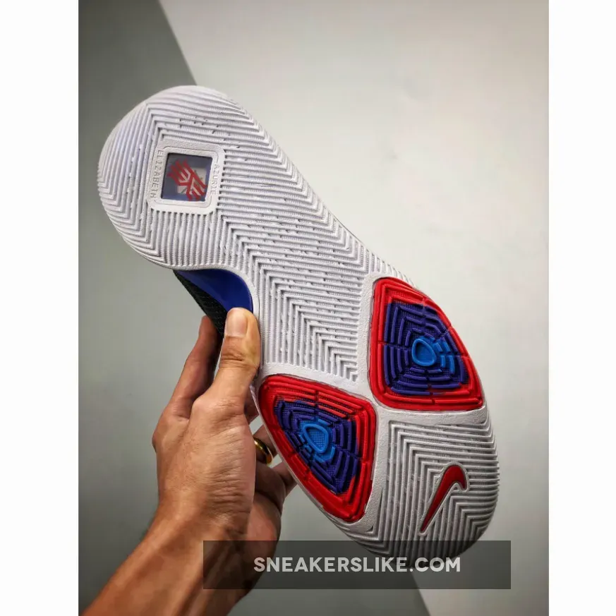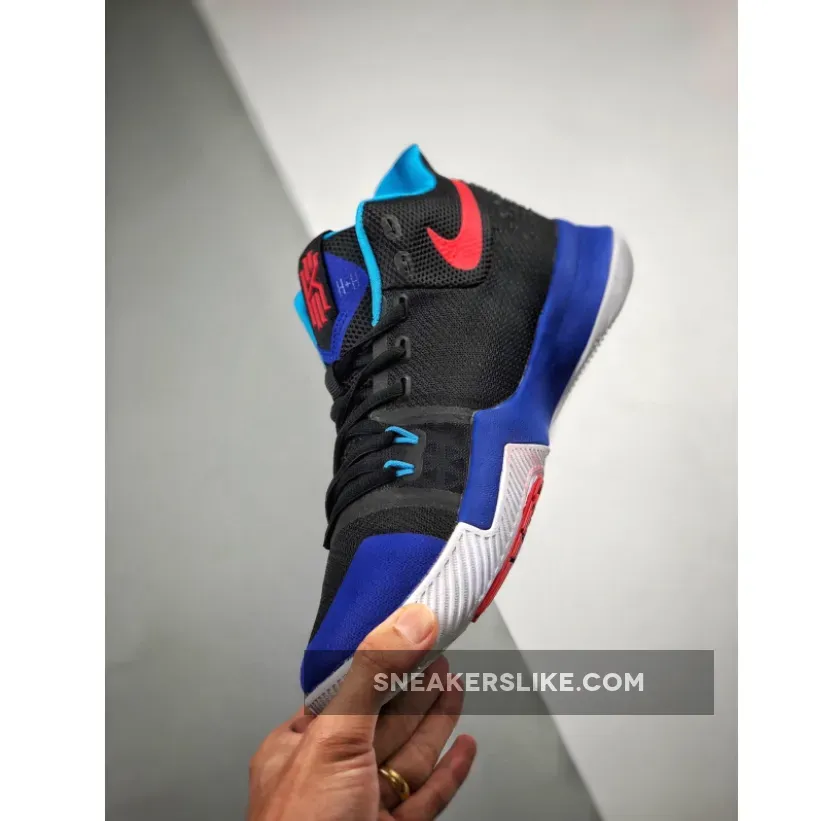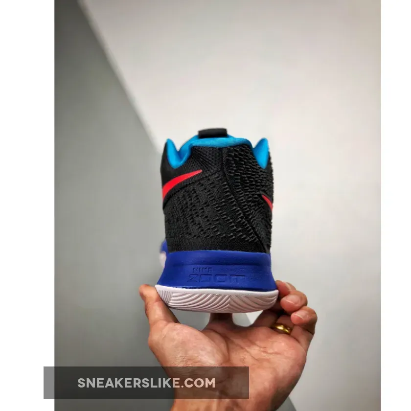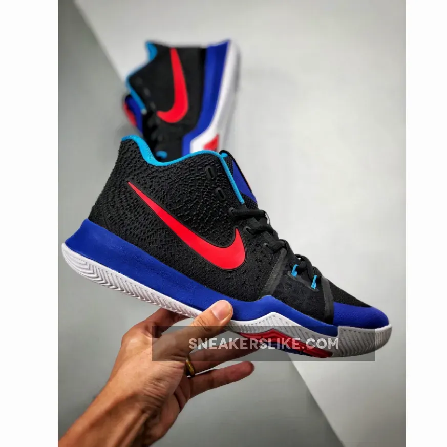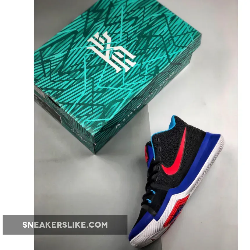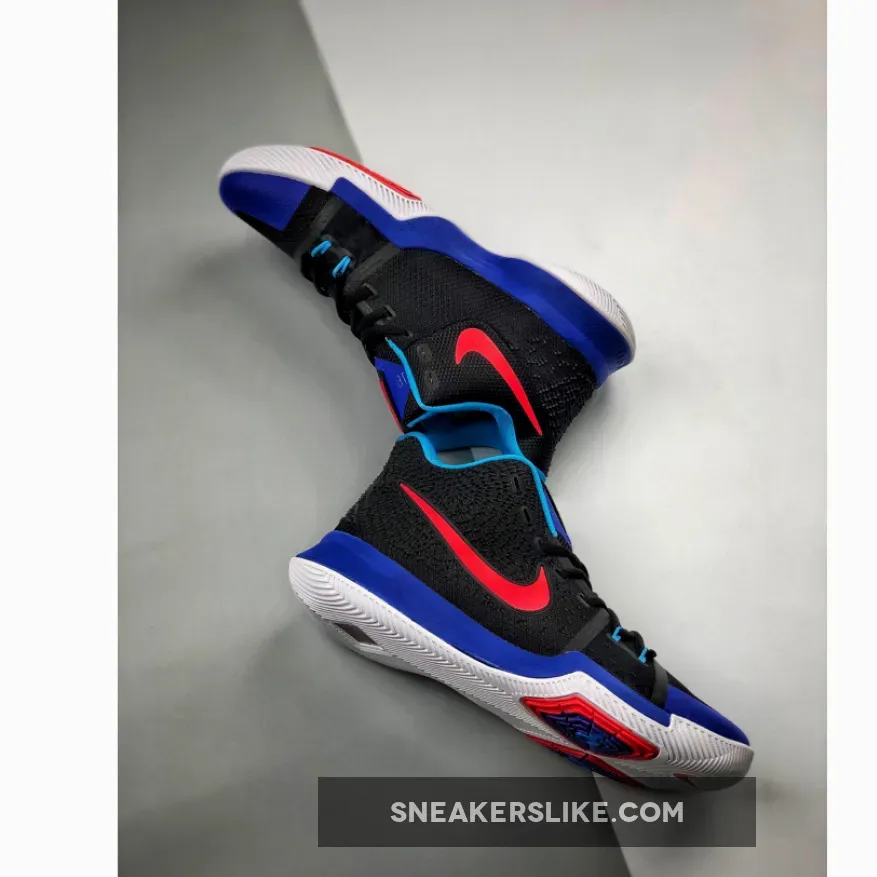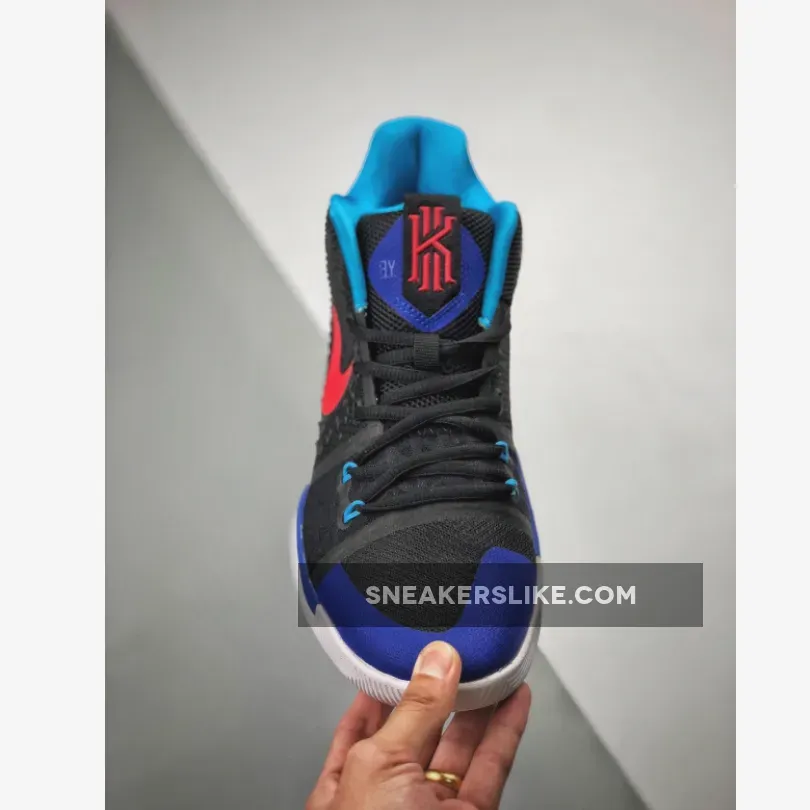 Dressed in similar Ultramarine, Concord, and Team Orange color scheme. This Nike Kyrie 3 features a Black-based upper with Orange accents on the branded areas, Teal inner liners with Concord Purple overlays.