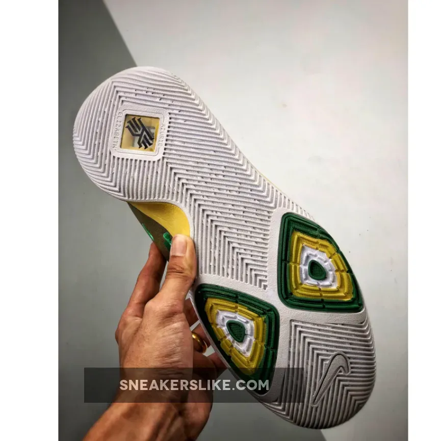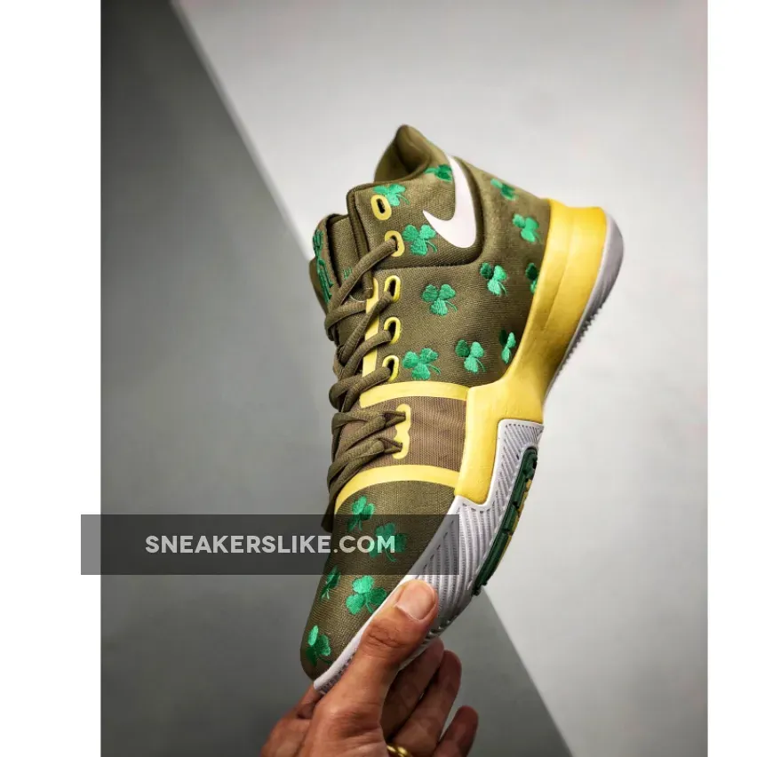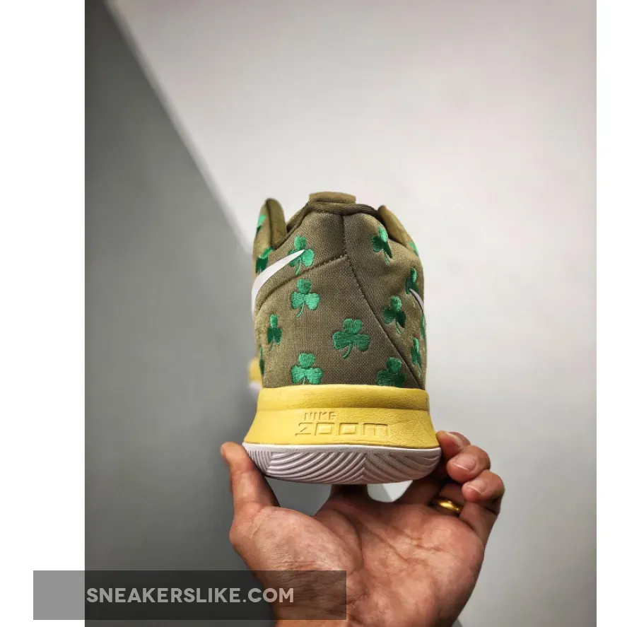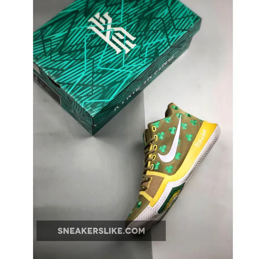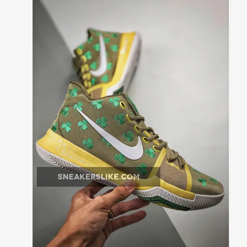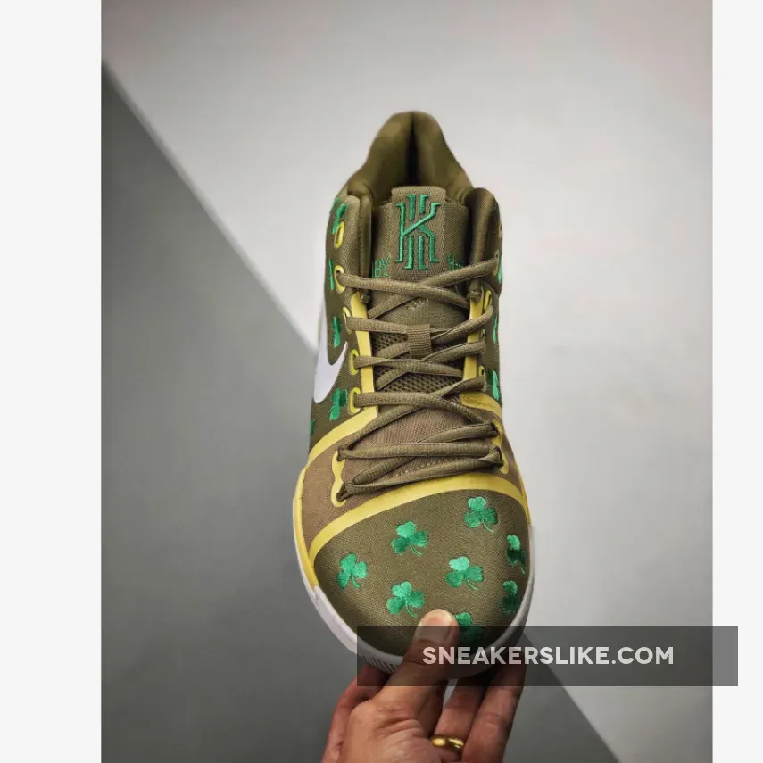 This special edition Nike Kyrie 3 features a Golden-based upper completed with Green shamrock embroidery throughout.
